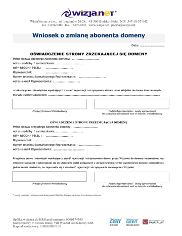 WizjaNet sp. z o.o., ul. Legionów 26/28, 43-300 Bielsko-Biała, NIP: 547-18-37-042 tel. 334963000, fax. 334963002, www.wizja.net, [email protected] Wniosek o zmianę abonenta domeny Data: …………………………… OŚWIADCZENIE STRONY ZRZEKAJĄCEJ SIĘ DOMENY Pełna nazwa obecnego Abonenta domeny: ........................ Adres siedziby / zamieszkania: ........................ NIP/ REGON/ PESEL: ........................ Reprezentant: ........................ Numer telefonu kontaktowego Reprezentanta: ........................ Adres e-mail Reprezentanta: ........................ zrzeka się praw i obowiązków wynikających z zasad* rejestracji i utrzymywania domen przez WizjaNet do domen internetowych, których jesteśmy abonentem: ……………………………………………………………………………………………………………. Pieczęć firmowa Wnioskodawcy Podpis Reprezentanta - osoby uprawnionej do składania oświadczeń woli w imieniu wnioskodawcy OŚWIADCZENIE STRONY PRZEJMUJĄCEJ DOMENĘ Pełna nazwa przyszłego Abonenta domeny ........................ Adres siedziby / zamieszkania: ........................ NIP/ REGON/ PESEL : ........................ Reprezentant: ................................ Numer telefonu kontaktowego Reprezentanta: ...................... Adres e-mail Reprezentanta: ..................................... Przejmuje prawa i obowiązki wynikające z zasad* rejestracji i utrzymywania domen przez WizjaNet do domeny internetowej wymienionej powyżej i zobowiązuje się do uiszczania opłat związanych z utrzymywaniem wyżej wymienionej domeny internetowej, jednocześnie oświadcza, że zapoznał/a się z zasadami* rejestracji i utrzymywania domen przez WizjaNet. Pieczęć firmowa Wnioskodawcy * zasady rejestracji i utrzymywania domen przez WizjaNet dostępne na stronie www.domeny.wizja.net Spółka wpisana do KRS pod numerem 0000374393 Sąd Rejonowy w Bielsku-Białej, VIII Wydział Gospodarczy KRS Kapitał zakładowy: 1.000.000 PLN Podpis Reprezentanta - osoby uprawnionej do składania oświadczeń woli w imieniu wnioskodawcy