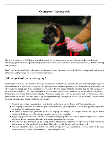 O smyczy i spacerach Nie jest tajemnicą, że Twój piesek powinien czuć się komfortowo na smyczy. Szczenięta lubią odkrywać otaczający je świat, więc z praktycznego punktu widzenia, smycz zapewni psu bezpieczeństwo, a Tobie kontrolę nad sytuacją. Da Ci to również możliwość miłego spędzania czasu razem. Spacery są nie tylko jedną z najlepszych rodzinnych aktywności, ale pomogą też w trenowaniu szczeniaka. Jak uczyć chodzenia na smyczy? Pierwszym krokiem, aby nauczyć Twojego szczeniaka chodzenia na smyczy, będzie przyzwyczajenie go do noszenia dobrze dopasowanej obroży. Każdy pies powinien najpierw przyzwyczaić się do obroży, dlatego jest to obowiązkowy zakup gdy tylko szczenię pojawi się w Twoim domu. Obroża powinna być na tyle ciasna, aby szczeniak nie mógł się z niej sam oswobodzić, ale nie może powodować dyskomfortu ani utrudniać oddychania. Regularnie sprawdzaj dopasowanie obroży. Pomiędzy szyją psa i obrożą powinno być wystarczająco dużo przestrzeni, by wsunąć tam dwa palce. Gdy Twój podopieczny przywyknie już do obroży na szyi, kolejne kroki pomogą Ci rozpocząć naukę chodzenia na smyczy. Przypnij smycz i daj szczeniakowi możliwość chodzenia z nią po domu, pod Twoim nadzorem. Nie ciągnij za smycz i nie zmuszaj pieska do chodzenia, gdy się opiera. Kucnij i przyjemnym głosem spróbuj go do siebie przywołać. W czasie kwarantanny, prowadź psiaka na smyczy do miejsca, w którym wolno mu się w domu załatwiać. Jeśli nie chce Cię słuchać, spróbuj zachęcić go zabawką. Nagradzaj go smakołykiem i chwal za każdym razem gdy posłusznie idzie w wyznaczonym przez Ciebie kierunku. W ten sposób najbardziej wzmocnisz pożądane zachowanie. Zwyczajowo psy prowadzi się po lewej stronie. Przyzwyczaj szczenię do chodzenia w ten sposób za każdym razem, gdy wychodzicie na dwór. Nagradzaj go, kiedy sam staje w tej pozycji. Podczas spacerów staraj się skupiać na sobie uwagę Twojego szczeniaka. Możesz używać do tego różnego rodzaju zachęt. Mów do niego i wydawaj polecenia. W czasie spacerów możesz też uczyć go komendy „do nogi”. Przeczytaj nasz artykuł nt. komend, aby dowiedzieć się więcej na ten temat. Spacery mogą być wspaniałym sposobem nawiązywania więzi z nowym psem. Nie tylko pomogą Ci rozwiązać większość trudności, które napotyka Twój szczeniak, ale również stanowią doskonałą rozrywkę. Czas, abyście wyszli z domu i zaczęli odkrywać świat, jednocześnie utrwalając wcześniej ćwiczone komendy. Zobacz więcej filmików z akademii szczeniaka Po co uczyć chodzenia na smyczy? Dzięki temu Twój podopieczny nie zerwie się do biegu w trakcie spaceru i będzie bezpieczniejszy. Pozwoli Ci to zapanować nad szczeniakiem, gdy stanie się nadmiernie pobudzony. Smycz można wykorzystać ucząc psa innych umiejętności, jak np. zostawania w domu, przychodzenia na zawołanie, itp. W wielu miastach i miejscach publicznych, smycze są wymagane podczas spacerów. Dzięki temu, będziesz mógł zabrać Twojego ulubieńca gdzie tylko zechcesz. Powered by TCPDF (www.tcpdf.org)