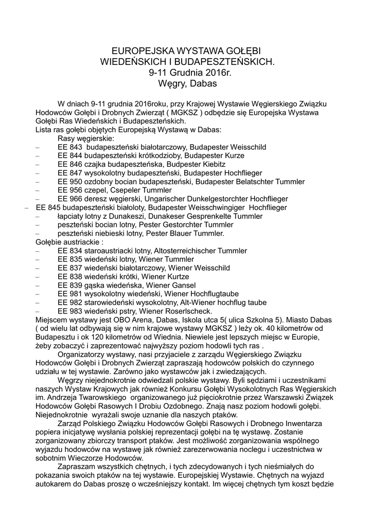 EUROPEJSKA WYSTAWA GOŁĘBI WIEDEŃSKICH I BUDAPESZTEŃSKICH. 9-11 Grudnia 2016r. Węgry, Dabas W dniach 9-11 grudnia 2016roku, przy Krajowej Wystawie Węgierskiego Związku Hodowców Gołębi i Drobnych Zwierząt ( MGKSZ ) odbędzie się Europejska Wystawa Gołębi Ras Wiedeńskich i Budapeszteńskich. Lista ras gołębi objętych Europejską Wystawą w Dabas: Rasy węgierskie: – EE 843 budapeszteński białotarczowy, Budapester Weisschild – EE 844 budapeszteński krótkodzioby, Budapester Kurze – EE 846 czajka budapeszteńska, Budpester Kiebitz – EE 847 wysokolotny budapeszteński, Budapester Hochflieger – EE 950 ozdobny bocian budapeszteński, Budapester Belatschter Tummler – EE 956 czepel, Csepeler Tummler – EE 966 deresz węgierski, Ungarischer Dunkelgestorchter Hochflieger – EE 845 budapeszteński białoloty, Budapester Weisschwingiger Hochflieger – łapciaty lotny z Dunakeszi, Dunakeser Gesprenkelte Tummler – peszteński bocian lotny, Pester Gestorchter Tummler – peszteński niebieski lotny, Pester Blauer Tummler. Gołębie austriackie : – EE 834 staroaustriacki lotny, Altosterreichischer Tummler – EE 835 wiedeński lotny, Wiener Tummler – EE 837 wiedeński białotarczowy, Wiener Weisschild – EE 838 wiedeński krótki, Wiener Kurtze – EE 839 gąska wiedeńska, Wiener Gansel – EE 981 wysokolotny wiedeński, Wiener Hochflugtaube – EE 982 starowiedeński wysokolotny, Alt-Wiener hochflug taube – EE 983 wiedeński pstry, Wiener Roserlscheck. Miejscem wystawy jest OBO Arena, Dabas, Iskola utca 5( ulica Szkolna 5). Miasto Dabas ( od wielu lat odbywają się w nim krajowe wystawy MGKSZ ) leży ok. 40 kilometrów od Budapesztu i ok 120 kilometrów od Wiednia. Niewiele jest lepszych miejsc w Europie, żeby zobaczyć i zaprezentować najwyższy poziom hodowli tych ras . Organizatorzy wystawy, nasi przyjaciele z zarządu Węgierskiego Związku Hodowców Gołębi i Drobnych Zwierząt zapraszają hodowców polskich do czynnego udziału w tej wystawie. Zarówno jako wystawców jak i zwiedzających. Węgrzy niejednokrotnie odwiedzali polskie wystawy. Byli sędziami i uczestnikami naszych Wystaw Krajowych jak również Konkursu Gołębi Wysokolotnych Ras Węgierskich im. Andrzeja Twarowskiego organizowanego już pięciokrotnie przez Warszawski Związek Hodowców Gołębi Rasowych I Drobiu Ozdobnego. Znają nasz poziom hodowli gołębi. Niejednokrotnie wyrażali swoje uznanie dla naszych ptaków. Zarząd Polskiego Związku Hodowców Gołębi Rasowych i Drobnego Inwentarza popiera inicjatywę wysłania polskiej reprezentacji gołębi na tę wystawę. Zostanie zorganizowany zbiorczy transport ptaków. Jest możliwość zorganizowania wspólnego wyjazdu hodowców na wystawę jak również zarezerwowania noclegu i uczestnictwa w sobotnim Wieczorze Hodowców. Zapraszam wszystkich chętnych, i tych zdecydowanych i tych nieśmiałych do pokazania swoich ptaków na tej wystawie. Europejskiej Wystawie. Chętnych na wyjazd autokarem do Dabas proszę o wcześniejszy kontakt. Im więcej chętnych tym koszt będzie mniejszy. Wyjazd nie jest „komercyjny”. Odbędzie się po kosztach. Start z Warszawy. Krzysztof Stachurski wiceprezes Warszawskiego Związku Hodowców Gołębi Rasowych i Drobiu Ozdobnego. Telefon kontaktowy nr 504 285 724. Wyciąg z Regulaminu Europejskiej Wystawy. 1 - Organizatorem Wystawy jest Węgierski Związek Hodowców Gołębi I Małych Zwierząt Hodowlanych ( MGKSZ). 2 - Wystawa odbędzie się w dniach 9-11 grudnia 2016r 3 - Miejsce Wystawy: Węgry, Dabas, OBO Arena, Iskola ut 5. 4 - Osoba kontaktowa: Antal Uhrner – prezes MGKSZ ( w języku węgierskim lub niemieckim). Tel +36 20 320 6849 tel/fax +36 1342 55 38, e-mail [email protected] 5 - MGKSZ zgłoszenia opłacone przyjmuje do 31 października 2016r. W zgłoszeniu należy wypełnić wszystkie rubryki w obojętnym języku. Ze strony polskiej zgłoszenia przyjmuje i przesyła Węgrom Krzysztof Stachurski 04-172 Warszawa ul Grochowska 99 Pracownia Złotnicza, tel 504 285 724. Druk dwujęzyczny węgiersko-polski zgłoszenia jest w zakładce „do pobrania” na stronie internetowej Polskiego ZHGRIDI oraz Warszawskiego ZHGRIDO. Opłatę zgłoszonych eksponatów przyjmuje w/w Krzysztof Stachurski. 6 - Cennik wystawy: - opłata wpisowa - 8 Euro - opłata za gołębia – 8 Euro - woliera (8 ptaków) - 25 Euro - młodzi hodowcy (obrączka fioletowa) od eksponatu - 4 Euro - katalog (obowiązkowo) – 8 Euro - karnet wejściowy na piątek, sobotę i niedzielę – 8 Euro 7- Terminarz Wystawy: czwartek 8 grudnia - przyjęcie eksponatów piątek 9 grudnia – ocena sędziowska sobota 10 grudnia 8.00- 18.00 – zwiedzanie wystawy sobota 10 grudnia 19.30 Dabas Motel – Wieczór Hodowcy (dodatkowo płatny) niedziela 11 grudnia 8.00 – 14.00 zwiedzanie wystawy niedziela 14.00 - -wydawanie eksponatów 8 – Giełda sprzedaży czynna od rana 9 – W w/w rasach gołębi będą nadawane tytuły Mistrz Europy i Champion Europy. Mistrz Europy nadawany będzie pod warunkiem zgłoszenia na wystawie przez różnych hodowców minimum 20 sztuk gołębi jednej rasy. W przypadku gdzie w jednej rasie będzie wystawionych minimum 20 sztuk w tym samym rysunku lub kolorze tytuł będzie nadawany dla poszczególnych rysunków lub kolorów. Champion Europy. W jednej rasie, ze wszystkich rysunków i kolorów nadawany będzie tytuł Champion Europy najlepszemu gołębiowi, który uzyskał minimum 95 pkt. 10 – Eksponaty z wystawy mogą być sprzedawane wyłącznie „przez katalog”.