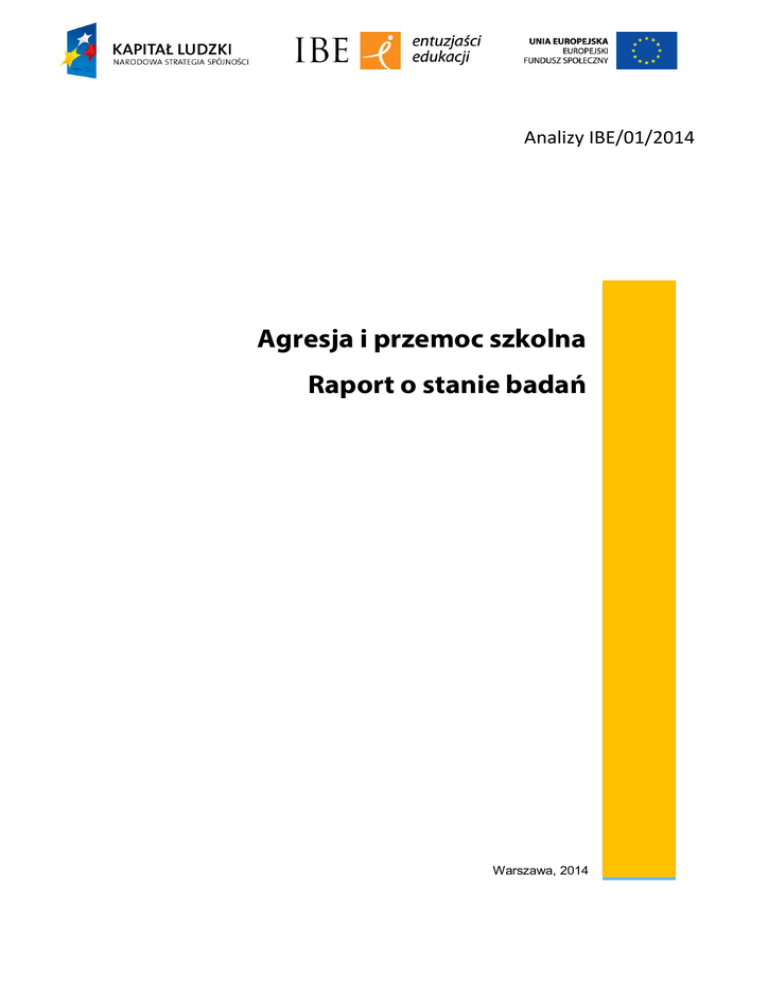 Analizy IBE/01/2014 Agresja i przemoc szkolna Raport o stanie badań Warszawa, 2014 Autor: Agata Komendant-Brodowska Wydawca: Instytut Badań Edukacyjnych ul. Górczewska 8 01-180 Warszawa tel. (22) 241 71 00; www.ibe.edu.pl © Copyright by: Instytut Badań Edukacyjnych, Warszawa, lipiec 2014 Publikacja opracowana w ramach projektu systemowego: Badanie jakości i efektywności edukacji oraz instytucjonalizacja zaplecza badawczego, współfinansowanego przez Unię Europejską ze środków Europejskiego Funduszu Społecznego, realizowanego przez Instytut Badań Edukacyjnych. Egzemplarz bezpłatny Streszczenie Celem opracowania jest przedstawienie najważniejszych danych na temat agresji szkolnej (rówieśniczej), w oparciu o dane z badań prowadzonych w Polsce i zagranicą. W raporcie przedstawione są definicje agresji, przemocy i dręczenia szkolnego (ang. bullying), najważniejsze dane na temat skali agresji w Polsce i na świecie oraz trendy dotyczące skali problemu. W ostatniej części opisane są znane indywidualne i środowiskowe czynniki ryzyka, czyli cechy uczniów, którzy częściej niż inni stają się ofiarami przemocy, a także cechy szkół powiązane z wyższym niż średnio natężeniem problemu. Streszczenie angielskie – ABSTRACT The aim of this desk research report is to provide basic information about school aggression and violence. Definitions of aggression, violence and bullying are presented along with data about the scale of the problem, both in Poland, and on international level. In addition, main trends concerning the scale of school aggression are described, based on surveys carried in Poland and in other countries. The last part of the report provides a list of individual and school-level risk factors, i.e. those characteristics of students and schools that make them more vulnerable to the problem of violence. 3 Spis Treści Streszczenie .........................................................................................................................3 Streszczenie angielskie – ABSTRACT ................................................................................3 Spis Treści ............................................................................................................................4 1. Wprowadzenie .............................................................................................................5 2. Agresja, przemoc, dręczenie szkolne ........................................................................6 2.1. Agresja a przemoc – istotne rozróżnienie ..................................................................................7 2.2. Agresja szkolna czy agresja w szkole? ......................................................................................8 2.3. Typologie agresji .......................................................................................................................9 2.4. Dręczenie szkolne................................................................................................................... 10 2.5. Agresja elektroniczna i cyberbullying ....................................................................................... 19 3. Skala problemu..........................................................................................................20 3.1. Skala agresji szkolnej ........................................................................................................ 20 3.2. Skala dręczenia szkolnego ................................................................................................ 28 4. Czy przemoc w polskich szkołach narasta? Analiza trendów ...............................35 5. Czynniki ryzyka, czynniki chroniące ........................................................................40 5.1. Przemoc a płeć, wiek i typ szkoły ............................................................................................ 42 5.2. Cechy indywidualne, relacje z rodziną i rówieśnikami .............................................................. 45 5.3. Cechy szkół jako czynniki ryzyka............................................................................................. 47 6. Podsumowanie ..........................................................................................................49 7. Literatura cytowana ..................................................................................................50 4 1. Wprowadzenie Celem opracowania jest przedstawienie najważniejszych danych na temat agresji i przemocy szkolnej, w oparciu o badania prowadzone w Polsce i zagranicą. W raporcie opisane są definicje agresji, przemocy i szczególnego typu przemocy szkolnej, jakim jest dręczenie (ang. bullying), dane na temat skali agresji szkolnej w Polsce, również na tle międzynarodowym oraz odpowiedzi na pytania dotyczące trendów obserwowanych w ostatnich latach, a także czynników, indywidualnych i środowiskowych, powiązanych z poziomem przemocy. Chociaż zachowania agresywne występujące w szkołach pojawiają się nie tylko w relacjach między uczniami, ale też w relacjach uczniów i nauczycieli, w gronie pedagogicznym oraz relacjach dyrektora szkoły i nauczycieli, opracowanie koncentruje się jedynie na pierwszym z wymienionych typów zachowań, a więc agresji rówieśniczej. → Cel raportu: przedstawienie najważniejszych danych na temat agresji i przemocy szkolnej, w oparciu o badania prowadzone w Polsce i zagranicą W każdej sferze życia od czasu do czasu stykamy się z działaniami, które można określić mianem agresji, a więc takimi, których celem jest wyrządzenie szkody innej osobie i szkoła nie jest pod tym względem miejscem szczególnym. Zachowania, które można uznać za agresję szkolną, różnią się formą i intensywnością: od kłótni pomiędzy przyjaciółmi, poprzez obgadywanie nielubianego kolegi lub koleżanki, wysyłanie złośliwego e-maila lub wpisywanie nieprzyjemnych 