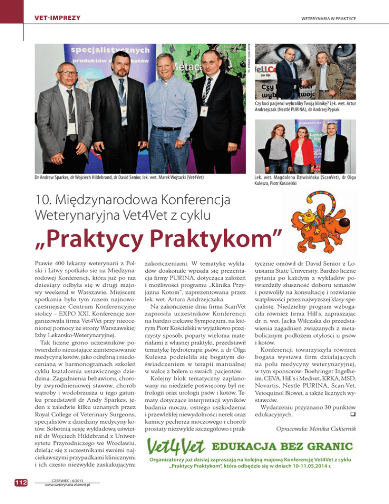 VETIMPREZY fot. archiwum organizatorów WETERYNARIA W PRAKTYCE Czy koci pacjenci wybraliby Twoją klinikę? Lek. wet. Artur Andrzejczak (Nestlé PURINA), dr Andrzej Pępiak Dr Andrew Sparkes, dr Wojciech Hildebrand, dr David Senior, lek. wet. Marek Wojtacki (Vet4Vet) Lek. wet. Magdalena Dziwisińska (ScanVet), dr Olga Kulesza, Piotr Kościelski 10. Międzynarodowa Konferencja Weterynaryjna Vet4Vet z cyklu „Praktycy Praktykom” Prawie 400 lekarzy weterynarii z Polski i Litwy spotkało się na Międzynarodowej Konferencji, która już po raz dziesiąty odbyła się w drugi majowy weekend w Warszawie. Miejscem spotkania było tym razem najnowocześniejsze Centrum Konferencyjne stolicy – EXPO XXI. Konferencję zorganizowała firma Vet4Vet przy nieocenionej pomocy ze strony Warszawskiej Izby Lekarsko-Weterynaryjnej. Tak liczne grono uczestników potwierdziło nieustające zainteresowanie medycyną kotów, jako odrębną i niedocenianą w harmonogramach szkoleń cyklu kształcenia ustawicznego dziedziną. Zagadnienia behawioru, choroby zwyrodnieniowej stawów, chorób wątroby i wodobrzusza u tego gatunku przedstawił dr Andy Sparkes, jeden z zaledwie kilku uznanych przez Royal College of Veterinary Surgeons, specjalistów z dziedziny medycyny kotów. Sobotnią sesję wykładową uświetnił dr Wojciech Hildebrand z Uniwersytetu Przyrodniczego we Wrocławiu, dzieląc się z uczestnikami swoimi najciekawszymi przypadkami klinicznymi i ich często niezwykle zaskakującymi 112 CZERWIEC • 6/2013 www.weterynaria.elamed.pl zakończeniami. W tematykę wykładów doskonale wpisała się prezentacja firmy PURINA, dotycząca założeń i możliwości programu „Klinika Przyjazna Kotom”, zaprezentowana przez lek. wet. Artura Andrzejczaka. Na zakończenie dnia firma ScanVet zaprosiła uczestników Konferencji na bardzo ciekawe Sympozjum, na którym Piotr Kościelski w wyjątkowo przejrzysty sposób, poparty wieloma materiałami z własnej praktyki, przedstawił tematykę hydroterapii psów, a dr Olga Kulesza podzieliła się bogatym doświadczeniem w terapii manualnej w walce z bólem u swoich pacjentów. Kolejny blok tematyczny zaplanowany na niedzielę poświęcony był nefrologii oraz urologii psów i kotów. Tematy dotyczące interpretacji wyników badania moczu, ostrego uszkodzenia i przewlekłej niewydolności nerek oraz kamicy pęcherza moczowego i chorób prostaty niezwykle szczegółowo i prak- tycznie omówił dr David Senior z Louisiana State University. Bardzo liczne pytania po każdym z wykładów potwierdziły słuszność doboru tematów i pozwoliły na konsultację i rozwianie wątpliwości przez najwyższej klasy specjalistę. Niedzielny program wzbogaciła również firma Hill’s, zapraszając dr. n. wet. Jacka Wilczaka do przedstawienia zagadnień związanych z metabolicznym podłożem otyłości u psów i kotów. Konferencji towarzyszyła również bogata wystawa firm działających na polu medycyny weterynaryjnej, w tym sponsorów: Boehringer Ingelheim, CEVA, Hill’s i Medivet, KRKA, MSD, Novartis, Nestlé PURINA, Scan-Vet, Vetoquinol Biowet, a także licznych wystawców. Wydarzeniu przyznano 30 punktów edukacyjnych. Opracowała: Monika Cukiernik Organizatorzy już dzisiaj zapraszają na kolejną majową Konferencję Vet4Vet z cyklu „Praktycy Praktykom”, która odbędzie się w dniach 10-11.05.2014 r.