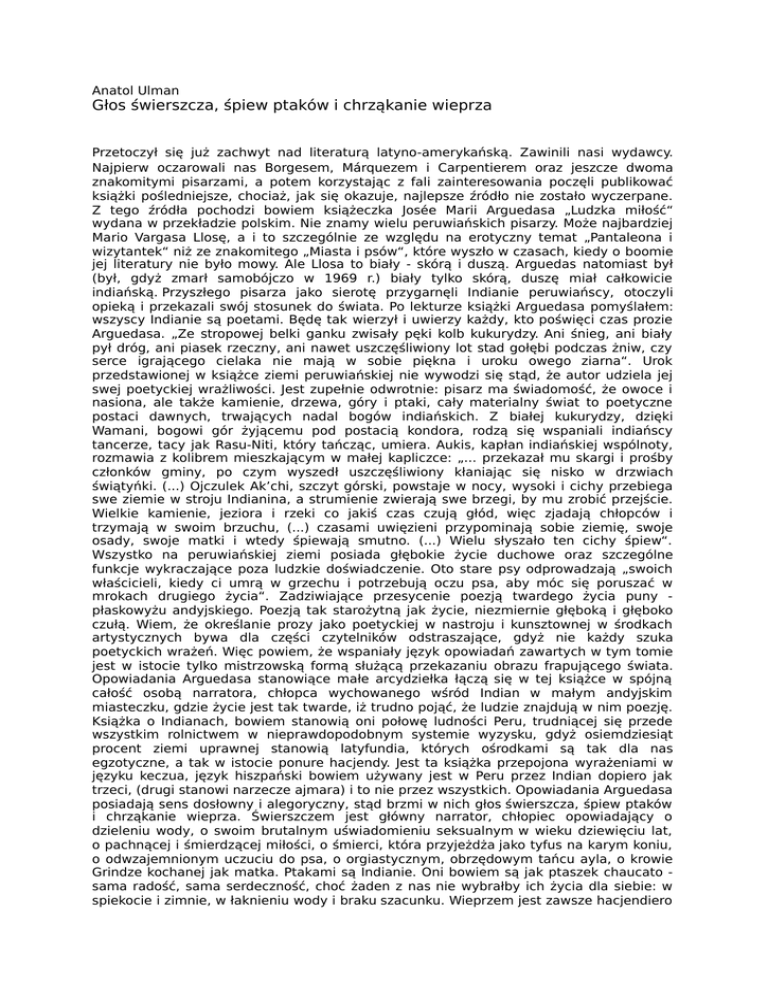 Anatol Ulman Głos świerszcza, śpiew ptaków i chrząkanie wieprza Przetoczył się już zachwyt nad literaturą latyno-amerykańską. Zawinili nasi wydawcy. Najpierw oczarowali nas Borgesem, Márquezem i Carpentierem oraz jeszcze dwoma znakomitymi pisarzami, a potem korzystając z fali zainteresowania poczęli publikować książki pośledniejsze, chociaż, jak się okazuje, najlepsze źródło nie zostało wyczerpane. Z tego źródła pochodzi bowiem książeczka Josée Marii Arguedasa „Ludzka miłość“ wydana w przekładzie polskim. Nie znamy wielu peruwiańskich pisarzy. Może najbardziej Mario Vargasa Llosę, a i to szczególnie ze względu na erotyczny temat „Pantaleona i wizytantek“ niż ze znakomitego „Miasta i psów“, które wyszło w czasach, kiedy o boomie jej literatury nie było mowy. Ale Llosa to biały - skórą i duszą. Arguedas natomiast był (był, gdyż zmarł samobójczo w 1969 r.) biały tylko skórą, duszę miał całkowicie indiańską. Przyszłego pisarza jako sierotę przygarnęli Indianie peruwiańscy, otoczyli opieką i przekazali swój stosunek do świata. Po lekturze książki Arguedasa pomyślałem: wszyscy Indianie są poetami. Będę tak wierzył i uwierzy każdy, kto poświęci czas prozie Arguedasa. „Ze stropowej belki ganku zwisały pęki kolb kukurydzy. Ani śnieg, ani biały pył dróg, ani piasek rzeczny, ani nawet uszczęśliwiony lot stad gołębi podczas żniw, czy serce igrającego cielaka nie mają w sobie piękna i uroku owego ziarna“. Urok przedstawionej w książce ziemi peruwiańskiej nie wywodzi się stąd, że autor udziela jej swej poetyckiej wrażliwości. Jest zupełnie odwrotnie: pisarz ma świadomość, że owoce i nasiona, ale także kamienie, drzewa, góry i ptaki, cały materialny świat to poetyczne postaci dawnych, trwających nadal bogów indiańskich. Z białej kukurydzy, dzięki Wamani, bogowi gór żyjącemu pod postacią kondora, rodzą się wspaniali indiańscy tancerze, tacy jak Rasu-Niti, który tańcząc, umiera. Aukis, kapłan indiańskiej wspólnoty, rozmawia z kolibrem mieszkającym w małej kapliczce: „... przekazał mu skargi i prośby członków gminy, po czym wyszedł uszczęśliwiony kłaniając się nisko w drzwiach świątyńki. (...) Ojczulek Ak’chi, szczyt górski, powstaje w nocy, wysoki i cichy przebiega swe ziemie w stroju Indianina, a strumienie zwierają swe brzegi, by mu zrobić przejście. Wielkie kamienie, jeziora i rzeki co jakiś czas czują głód, więc zjadają chłopców i trzymają w swoim brzuchu, (...) czasami uwięzieni przypominają sobie ziemię, swoje osady, swoje matki i wtedy śpiewają smutno. (...) Wielu słyszało ten cichy śpiew“. Wszystko na peruwiańskiej ziemi posiada głębokie życie duchowe oraz szczególne funkcje wykraczające poza ludzkie doświadczenie. Oto stare psy odprowadzają „swoich właścicieli, kiedy ci umrą w grzechu i potrzebują oczu psa, aby móc się poruszać w mrokach drugiego życia“. Zadziwiające przesycenie poezją twardego życia puny płaskowyżu andyjskiego. Poezją tak starożytną jak życie, niezmiernie głęboką i głęboko czułą. Wiem, że określanie prozy jako poetyckiej w nastroju i kunsztownej w środkach artystycznych bywa dla części czytelników odstraszające, gdyż nie każdy szuka poetyckich wrażeń. Więc powiem, że wspaniały język opowiadań zawartych w tym tomie jest w istocie tylko mistrzowską formą służącą przekazaniu obrazu frapującego świata. Opowiadania Arguedasa stanowiące małe arcydziełka łączą się w tej książce w spójną całość osobą narratora, chłopca wychowanego wśród Indian w małym andyjskim miasteczku, gdzie życie jest tak twarde, iż trudno pojąć, że ludzie znajdują w nim poezję. Książka o Indianach, bowiem stanowią oni połowę ludności Peru, trudniącej się przede wszystkim rolnictwem w nieprawdopodobnym systemie wyzysku, gdyż osiemdziesiąt procent ziemi uprawnej stanowią latyfundia, których ośrodkami są tak dla nas egzotyczne, a tak w istocie ponure hacjendy. Jest ta książka przepojona wyrażeniami w języku keczua, język hiszpański bowiem używany jest w Peru przez Indian dopiero jak trzeci, (drugi stanowi narzecze ajmara) i to nie przez wszystkich. Opowiadania Arguedasa posiadają sens dosłowny i alegoryczny, stąd brzmi w nich głos świerszcza, śpiew ptaków i chrząkanie wieprza. Świerszczem jest główny narrator, chłopiec opowiadający o dzieleniu wody, o swoim brutalnym uświadomieniu seksualnym w wieku dziewięciu lat, o pachnącej i śmierdzącej miłości, o śmierci, która przyjeżdża jako tyfus na karym koniu, o odwzajemnionym uczuciu do psa, o orgiastycznym, obrzędowym tańcu ayla, o krowie Grindze kochanej jak matka. Ptakami są Indianie. Oni bowiem są jak ptaszek chaucato sama radość, sama serdeczność, choć żaden z nas nie wybrałby ich życia dla siebie: w spiekocie i zimnie, w łaknieniu wody i braku szacunku. Wieprzem jest zawsze hacjendiero (jakkolwiek by się nazywał: don Braulio czy don Pablo), obywatel, pan okolicy, kochanek wszystkich kobiet, na które ma chęć, łącznie z krewnymi. On bruka, ogarnięty żądzą znaczenia i posiadania wszystkiego dokoła, wspaniały świat, w którym nawet kamienie żyją. Lecz głos świerszcza i śpiew ptaków starożytny i zgodny, przebija się niestrudzenie przez brud i góruje w tej niezwykłej książce, której treść trafnie określa tytuł, który w tłumaczeniu niesłusznie zawężono. Powinno być, jak w oryginale: „Amor mundo...“ miłość świata. José Maria Arguedas Ludzka miłość Warszawa 1979 PIW Zbliżenia, nr 17/1980, 24 IV 1980