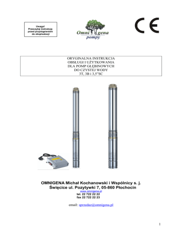 Uwaga! Przeczytaj instrukcję przed przystąpieniem do eksploatacji ORYGINALNA INSTRUKCJA OBSŁUGI I UŻYTKOWANIA DLA POMP GŁĘBINOWYCH DO CZYSTEJ WODY 3T, 3B i 3,5”SC OMNIGENA Michał Kochanowski i Wspólnicy s. j. Święcice ul. Pozytywki 7, 05-860 Płochocin www.omnigena.pl tel. 22 722 22 22 fax 22 722 22 23 email: [email protected] 1 DEKLARACJA ZGODNOŚCI WE 06/2015 OMNIGENA Michał Kochanowski i Wspólnicy s. j. Święcice ul. Pozytywki 7, 05-860 Płochocin deklaruje z całą odpowiedzialnością, że: Pompy głębinowe typu: 3T , 3B, 3,5SC 2 , 3,5SC 3 , 3,5SC 5 są zgodne z dokumentacją wytwórcy i spełniają zasadnicze wymagania bezpieczeństwa zawarte w dyrektywach: maszynowej 2006/42/WE kompatybilności elektromagnetycznej 2004/108/WE niskonapięciowej 2006/95/WE Oraz są zgodne z normami zharmonizowanymi PN-EN 809+A1:2009; PN-EN 12723:2004; PN-EN 60335-2-41:2005/A2:2010 PN-EN 60335-1:2004/A1:2005; PN-EN 60529:2003; PN-EN ISO 12100:2011 PN-EN 61000-6-3:2008/A1:2011; PN-EN 55014-1:2007; PN-EN 61000-3-2:2007/A1:2010; PN-EN 61000-3-3:2011; PN-EN 60204-1:2010/AC:2011; PN-EN ISO 20361:2009 Jakakolwiek zmiana wprowadzona do wyrobu unieważnia niniejszą deklarację. Osoba odpowiedzialna za przygotowanie i przechowywanie dokumentacji technicznej w siedzibie firmy: Katarzyna Kochanowska Data pierwszego umieszczenia oznakowania CE na wyrobie: 15 Producent Święcice 21 Marca 2015 2 WPROWADZENIE Dziękujemy za wybór pompy głębinowej oferowanej przez naszą firmę OMNIGENA. Mamy nadzieję że dzięki lekturze niniejszej instrukcji dokonacie Państwo wyboru właściwych parametrów pompy i będziecie obeznani z zasadami bezpieczeństwa podczas pracy z pompą oraz z jej parametrami technicznymi i z zasadami użytkowania urządzenia. Zanurzalny agregat pompowy składa się z dwóch zespołów : z części hydraulicznej zwanej dalej hydrauliką oraz zanurzalnego silnika zwanego dalej silnikiem. Oba zagregowane zespoły dalej będą nazywane pompą głębinową lub w skrócie pompą. NINIEJSZA INSTRUKCJA OBSŁUGI JEST nieodłączną częścią urządzenia i powinna zostać przekazana wraz z pompą podczas sprzedaży. W celu identyfikacji konkretnego modelu pompy sprzedawca jest zobowiązany do wpisania w karcie gwarancyjnej model oraz numer seryjny urządzenia, które znajdują się na tabliczce znamionowej / obudowie silnika. Numer seryjny zawiera rok produkcji pompy. Instrukcja opisuje budowę, parametry pomp, procedury obsługi, transportu, smarowania, konserwacji, inspekcji i regulacji. Pomoże ona operatorowi używać pompę wydajnie, ekonomicznie i bezbłędnie. Przed rozpoczęciem pracy należy dokładnie zapoznać się z prawidłowym doborem pompy i sposobem jej obsługi . W tym celu należy uważnie przeczytać niniejszą instrukcję obsługi i starannie wykonywać zalecone czynności. W przeciwnym razie może dojść do obrażeń ciała lub uszkodzenia sprzętu. Żywotność urządzenia, jak również wydajna i niezawodna praca w dużym stopniu zależy od obsługi i sposobu prowadzenia eksploatacji W przypadku zmiany przez użytkownika parametrów na odbiegające od oryginalnej specyfikacji fabrycznej lub gdy będą dokonane inne modyfikacje, gwarancja przestanie obowiązywać. UWAGA Niestosowanie się do zaleceń zawartych w instrukcji lub użytkowanie urządzenia niezgodnie z jego przeznaczeniem może spowodować cofnięcie gwarancji. Gwarancja nie będzie obejmować usterek spowodowanych wykonywaniem nieuprawnionych regulacji, nieuzgodnionych z producentem przeróbek, a także zastosowań niezgodnych z przeznaczeniem. SPIS TREŚCI: 1. Bezpieczeństwo ...................................................................................…..str.4 2. Transport i magazynowanie..................................................................….str.5 3. Zastosowanie. Informacje ogólne.......................................................…...str.5 4. Ogólnie o doborze pomp....................................................................…....str.7 5. Dobór silnika do hydrauliki..............................................................….....str.8 6. Montaż mechaniczny pompy głębinowej.........................................…....str.10 7. Podłączenie elektryczne.....................................................................…..str.11 8. Uruchomienie, wyłączenie pompy..........................................................str.13 9. Obsługa i konserwacja pompy................................................................ str.14 10. Zakłócenia w pracy, ich przyczyny, sposoby usuwania.......................str.14 11. Poziom hałasu........................................................................................str.15 12. Utylizacja...............................................................................................str.15 3 1 BEZPIECZEŃSTWO. 1.1 Informacje, które są oznaczane poniżej określonymi symbolami są bardzo istotne dla bezpieczeństwa użytkownika, montażu, eksploatacji i konserwacji pompy: – symbol zagrożenia ogólnego. Przy takim oznaczeniu znajdują się ostrzeżenia, których nie przestrzeganie może stanowić zagrożenie dla zdrowia lub życia. – symbol ostrzeżenia przed porażeniem elektrycznym. Nie przestrzeganie może skutkować porażeniem elektrycznym i spowodować obrażenia ciała lub śmierć . Przed wykonywaniem czynności oznaczonych tym symbolem przewód zasilający pompę musi zostać odłączony od zasilania elektrycznego lub musi być umożliwione zablokowanie włącznika głównego w pozycji zero. UWAGA - symbol znajduje się w tych miejscach instrukcji, które mówią o wskazówkach właściwej eksploatacji pompy dla uniknięcia zniszczeń w samym urządzeniu 1.2 Zalecenia dotyczące bezpieczeństwa. Pompa nie może być podłączona do sieci elektrycznej w jakikolwiek sposób jeżeli nie znajduje się w studni. Wyjątkiem może być konieczność sprawdzenia kierunku obrotów silnika z pow