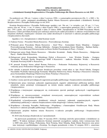 SPRAWOZDANIE PREZYDENTA MIASTA RZESZOWA z działalności Komisji Bezpieczeństwa i Porządku Publicznego dla Miasta Rzeszowa za rok 2010 Na podstawie art. 38b ust. 3 ustawy z dnia 5 czerwca 1998 r. o samorządzie powiatowym (Dz. U. z 2001 r. Nr. 142 poz. 1592 z późn. zmianami) przedkładam Radzie Miasta Rzeszowa sprawozdanie z działalności Komisji Bezpieczeństwa i Porządku Publicznego za rok 2010. Komisja Bezpieczeństwa i Porządku Publicznego zgodnie z art. 38a ust. 1 w związku z art. 92 ust. 1 i 2 ww. ustawy oraz art. 30 ust. 1 i art. 31 ustawy z dnia 8 marca 1990 r. o samorządzie gminnym ( Dz.U. z 2001 r. nr 142 poz. 1591 z późn. zm.) powołana została w dniu 25 marca 2008r. Zarządzeniem nr 18/2008 Prezydenta Miasta Rzeszowa. Celem powołania Komisji jest realizacja ustawowych zadań prezydenta w zakresie zwierzchnictwa nad miejskimi służbami, inspekcjami i strażami oraz zadań określonych w ustawach w zakresie porządku publicznego i bezpieczeństwa obywateli. Zgodnie z ww. Zarządzeniem w skład Komisji weszli: 1) Tadeusz Ferenc - Prezydent Miasta Rzeszowa - Przewodniczący Komisji, 2) Wskazani przez Prezydenta Miasta Rzeszowa: - Józef Wisz - Komendant Straży Miejskiej - Zastępca Przewodniczącego Komisji, - Jadwiga Jabłońska - Zastępca Komendanta Straży Miejskiej, - Barbara Stafiej Zastępca Przewodniczącej Stowarzyszenia na Rzecz Kobiet Poszukujących Pracy „Victoria", 3) Delegowani przez Radę Miasta Rzeszowa: - Mirosław Kwaśniak - Radny Miasta Rzeszowa, - Małgorzata Rączy - Radna Miasta Rzeszowa, 4) Delegowani przez Komendanta Miejskiego Policji w Rzeszowie: - kom. Wioletta Wandas - Zastępca Naczelnika Wydziału Ruchu Drogowego KMP w Rzeszowie - nadkom. Mirosław Wośko - Naczelnik Wydziału Prewencji KMP w Rzeszowie, 5) W pracach Komisji bierze udział Roman Pokrzywa - Prokurator Prokuratury Rejonowej w Rzeszowie wskazany przez Prokuratora Okręgowego w Rzeszowie. 6) Do udziału w pracach Komisji głosem doradczym powołany został także st. kpt. Paweł Szkoła, Zastępca Naczelnika Wydziału Operacyjnego Komendy Miejskiej Państwowej Straży Pożarnej w Rzeszowie wskazany przez Komendanta Miejskiego Państwowej Straży Pożarnej w Rzeszowie. Do zadań Komisji należy w szczególności: 1) Analiza i ocena zjawisk powodujących zagrożenia porządku publicznego i bezpieczeństwa mieszkańców. 2) Opiniowanie pracy instytucji, jednostek organizacyjnych, organów administracji publicznej (policji, służb miejskich, straży pożarnej) wykonujących na terenie miasta zadania z zakresu porządku publicznego i bezpieczeństwa. 3) Współpraca z instytucjami zajmującymi się zwalczaniem zjawisk patologii społecznych i zapobieganiem bezrobociu. 4) Współpraca ze stowarzyszeniami, związkami stowarzyszeń, samorządowymi wojewódzkimi osobami prawnymi w zakresie swojego działania. 5) Współudział w koordynowaniu działalności różnych instytucji, jednostek organizacyjnych, organów administracji publicznej w zakresie bezpieczeństwa ruchu drogowego i ochrony środowiska. 6) Współpraca z Komisją Porządku Publicznego i Współpracy z Samorządami Osiedlowymi Rady Miasta Rzeszowa w zakresie porządku publicznego i bezpieczeństwa. 7) Opiniowanie projektu budżetu miasta Rzeszowa w zakresie porządku publicznego i bezpieczeństwa mieszkańców. W 2010 roku Komisja obradowała na 3 posiedzeniach: Na pierwszym posiedzeniu w dniu 19 stycznia 2010 r. Komisja omówiła sprawozdanie z działalności za 2009 r. W trakcie dyskusji członkowie Komisji omawiali szczegółowo zadania, które wykonywane były w 2009 roku przez Policję, Prokuraturę, Straż Pożarną, Straż Miejską, Radę Miasta Rzeszowa oraz przez inne instytucje współdziałające z Komisją. Na drugim posiedzeniu w dniu 18 sierpnia 2010 r. omawiano Id: AREDN-USUKC-EDVPS-FRCUD-ZXBRW. Podpisany Strona 1 prewencyjny program „Przyjazne środowisko lokalne na terenie miasta Rzeszowa”, którego przedmiotem są zadania ujęte w rządowym programie „Razem bezpieczniej”, zakres kształtowania bezpiecznych przestrzeni publicznych związanych z realizacją „Przyjaznego środowiska lokalnego” na terenie miasta Rzeszowa oraz problemy związane z bezpieczeństwem dzieci w drodze do szkoły w nadchodzącym roku szkolnym. Podano przykładowe źródła informacji o zagrożeniach: - rejestry skarg wnoszonych przez mieszkańców, informacja o geografii występowania najczęstszych aktów wandalizmu, - zbieranie informacji przez dzielnicowych podczas spotkań na wywiadówkach w szkołach, - spotkanie dzielnicowych Policji i Straży Miejskiej z mieszkańcami osiedli i Rad Osiedlowych, uzyskanie informacji o problemach dot. bezpieczeństwa, - w ramach prowadzonego obchodu rejonu służbowego zasięganie informacji o zagrożeniach przez dzielnicowych Policji i Straży Miejskiej, - uzyskanie badań zwrotnych o zagrożeniach na podstawie badań ankietowych przeprowadzonych wśród mieszkańców, - wymiana informacji pomiędzy poszczególnymi służbami (Policja, Straż Miejska, Straż Pożarna) Do celów głównych, jakie zakłada niniejszy program prewencji należy zaliczyć: - podniesienie poziomu bezpieczeństwa, - ograniczenie zjawisk patologicznych na terenach przyległych do różnych obiektów, a w szczególności użyteczności publicznej, pobudzenie lokalnych społeczności do przeciwdziałania wszelkiego rodzaju zjawiskom patologicznym, stworzenie bezpiecznego i przyjaznego dla człowieka otoczenia, które nie będzie rodziło dla niego żadnych zagrożeń, - wywarcie pozytywnego wpływu na środowisko młodych mieszkańców, w szczególności na terenie osiedli, w celu przeciwdziałania zjawiskom wandalizmu i wybrykom chuligańskim, - ograniczanie zjawisk kradzieży i dewastacji mienia prywatnego i publicznego, - poszerzenie współpracy z organami administracji samorządowej, administracją osiedli, lokalnymi mediami, szkołami, uczelniami oraz w razie wystąpienia takiej potrzeby z inn