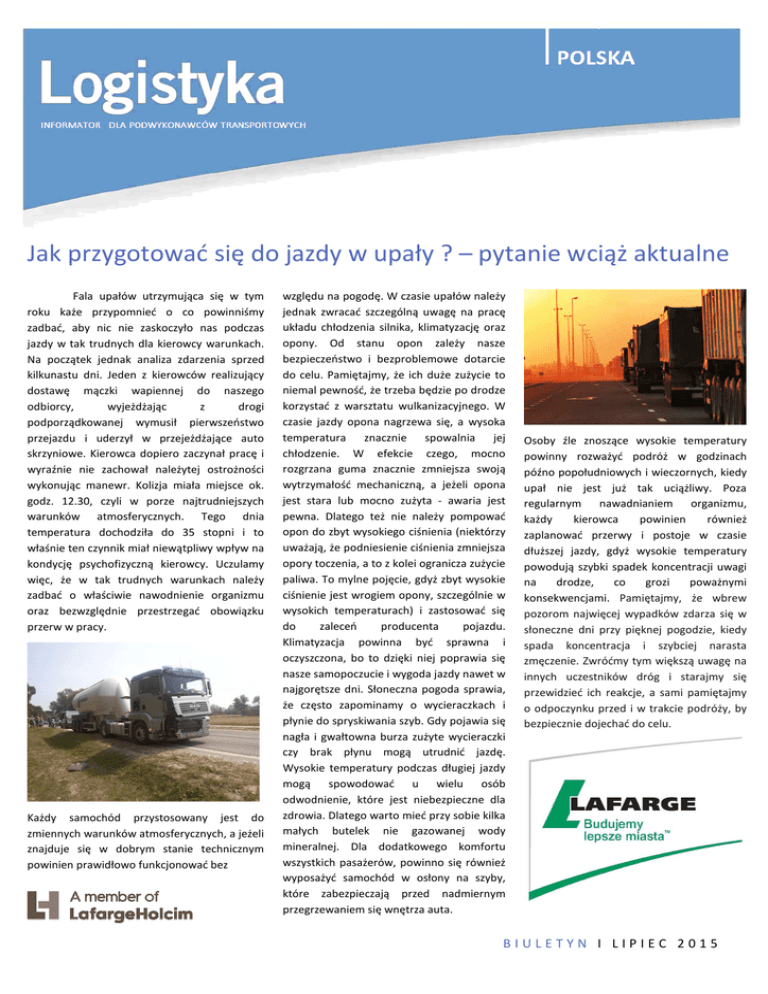 Jak przygotować się do jazdy w upały ? – pytanie wciąż aktualne Fala upałów utrzymująca się w tym roku każe przypomnieć o co powinniśmy zadbać, aby nic nie zaskoczyło nas podczas jazdy w tak trudnych dla kierowcy warunkach. Na początek jednak analiza zdarzenia sprzed kilkunastu dni. Jeden z kierowców realizujący dostawę mączki wapiennej do naszego odbiorcy, wyjeżdżając z drogi podporządkowanej wymusił pierwszeństwo przejazdu i uderzył w przejeżdżające auto skrzyniowe. Kierowca dopiero zaczynał pracę i wyraźnie nie zachował należytej ostrożności wykonując manewr. Kolizja miała miejsce ok. godz. 12.30, czyli w porze najtrudniejszych warunków atmosferycznych. Tego dnia temperatura dochodziła do 35 stopni i to właśnie ten czynnik miał niewątpliwy wpływ na kondycję psychofizyczną kierowcy. Uczulamy więc, że w tak trudnych warunkach należy zadbać o właściwie nawodnienie organizmu oraz bezwzględnie przestrzegać obowiązku przerw w pracy. Każdy samochód przystosowany jest do zmiennych warunków atmosferycznych, a jeżeli znajduje się w dobrym stanie technicznym powinien prawidłowo funkcjonować bez względu na pogodę. W czasie upałów należy jednak zwracać szczególną uwagę na pracę układu chłodzenia silnika, klimatyzację oraz opony. Od stanu opon zależy nasze bezpieczeństwo i bezproblemowe dotarcie do celu. Pamiętajmy, że ich duże zużycie to niemal pewność, że trzeba będzie po drodze korzystać z warsztatu wulkanizacyjnego. W czasie jazdy opona nagrzewa się, a wysoka temperatura znacznie spowalnia jej chłodzenie. W efekcie czego, mocno rozgrzana guma znacznie zmniejsza swoją wytrzymałość mechaniczną, a jeżeli opona jest stara lub mocno zużyta - awaria jest pewna. Dlatego też nie należy pompować opon do zbyt wysokiego ciśnienia (niektórzy uważają, że podniesienie ciśnienia zmniejsza opory toczenia, a to z kolei ogranicza zużycie paliwa. To mylne pojęcie, gdyż zbyt wysokie ciśnienie jest wrogiem opony, szczególnie w wysokich temperaturach) i zastosować się do zaleceń producenta pojazdu. Klimatyzacja powinna być sprawna i oczyszczona, bo to dzięki niej poprawia się nasze samopoczucie i wygoda jazdy nawet w najgorętsze dni. Słoneczna pogoda sprawia, że często zapominamy o wycieraczkach i płynie do spryskiwania szyb. Gdy pojawia się nagła i gwałtowna burza zużyte wycieraczki czy brak płynu mogą utrudnić jazdę. Wysokie temperatury podczas długiej jazdy mogą spowodować u wielu osób odwodnienie, które jest niebezpieczne dla zdrowia. Dlatego warto mieć przy sobie kilka małych butelek nie gazowanej wody mineralnej. Dla dodatkowego komfortu wszystkich pasażerów, powinno się również wyposażyć samochód w osłony na szyby, które zabezpieczają przed nadmiernym przegrzewaniem się wnętrza auta. Osoby źle znoszące wysokie temperatury powinny rozważyć podróż w godzinach późno popołudniowych i wieczornych, kiedy upał nie jest już tak uciążliwy. Poza regularnym nawadnianiem organizmu, każdy kierowca powinien również zaplanować przerwy i postoje w czasie dłuższej jazdy, gdyż wysokie temperatury powodują szybki spadek koncentracji uwagi na drodze, co grozi poważnymi konsekwencjami. Pamiętajmy, że wbrew pozorom najwięcej wypadków zdarza się w słoneczne dni przy pięknej pogodzie, kiedy spada koncentracja i szybciej narasta zmęczenie. Zwróćmy tym większą uwagę na innych uczestników dróg i starajmy się przewidzieć ich reakcje, a sami pamiętajmy o odpoczynku przed i w trakcie podróży, by bezpiecznie dojechać do celu. BIULETYN I LIPIEC 2015