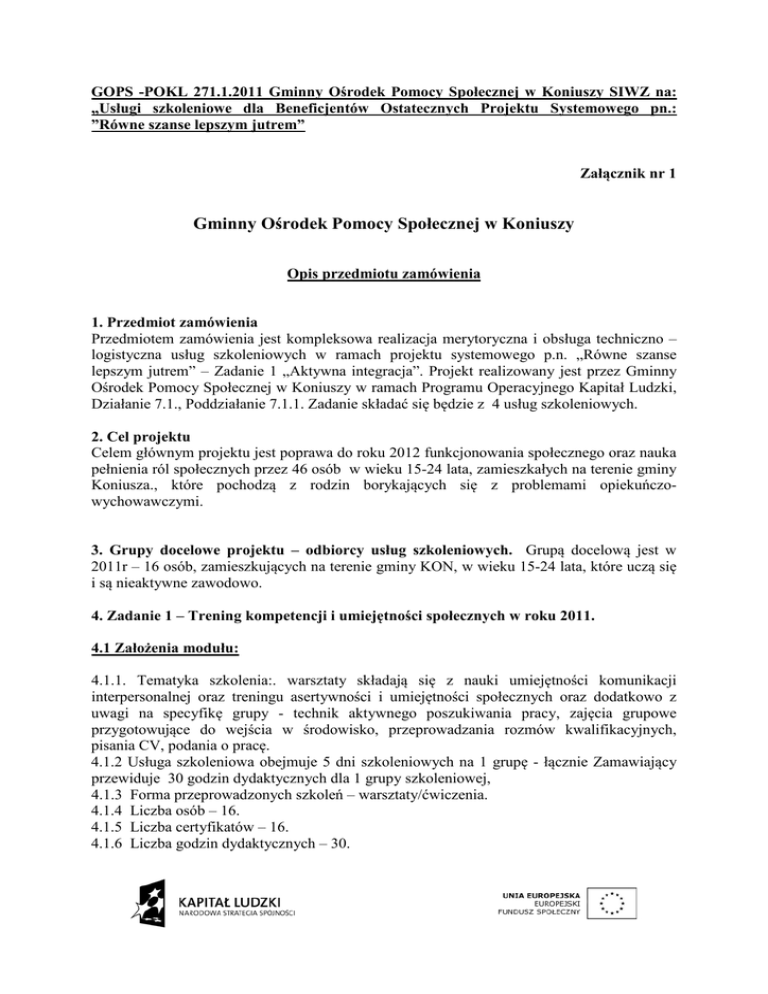 GOPS -POKL 271.1.2011 Gminny Ośrodek Pomocy Społecznej w Koniuszy SIWZ na: „Usługi szkoleniowe dla Beneficjentów Ostatecznych Projektu Systemowego pn.: ”Równe szanse lepszym jutrem” Załącznik nr 1 Gminny Ośrodek Pomocy Społecznej w Koniuszy Opis przedmiotu zamówienia 1. Przedmiot zamówienia Przedmiotem zamówienia jest kompleksowa realizacja merytoryczna i obsługa techniczno – logistyczna usług szkoleniowych w ramach projektu systemowego p.n. „Równe szanse lepszym jutrem” – Zadanie 1 „Aktywna integracja”. Projekt realizowany jest przez Gminny Ośrodek Pomocy Społecznej w Koniuszy w ramach Programu Operacyjnego Kapitał Ludzki, Działanie 7.1., Poddziałanie 7.1.1. Zadanie składać się będzie z 4 usług szkoleniowych. 2. Cel projektu Celem głównym projektu jest poprawa do roku 2012 funkcjonowania społecznego oraz nauka pełnienia ról społecznych przez 46 osób w wieku 15-24 lata, zamieszkałych na terenie gminy Koniusza., które pochodzą z rodzin borykających się z problemami opiekuńczowychowawczymi. 3. Grupy docelowe projektu – odbiorcy usług szkoleniowych. Grupą docelową jest w 2011r – 16 osób, zamieszkujących na terenie gminy KON, w wieku 15-24 lata, które uczą się i są nieaktywne zawodowo. 4. Zadanie 1 – Trening kompetencji i umiejętności społecznych w roku 2011. 4.1 Założenia modułu: 4.1.1. Tematyka szkolenia:. warsztaty składają się z nauki umiejętności komunikacji interpersonalnej oraz treningu asertywności i umiejętności społecznych oraz dodatkowo z uwagi na specyfikę grupy - technik aktywnego poszukiwania pracy, zajęcia grupowe przygotowujące do wejścia w środowisko, przeprowadzania rozmów kwalifikacyjnych, pisania CV, podania o pracę. 4.1.2 Usługa szkoleniowa obejmuje 5 dni szkoleniowych na 1 grupę - łącznie Zamawiający przewiduje 30 godzin dydaktycznych dla 1 grupy szkoleniowej, 4.1.3 Forma przeprowadzonych szkoleń – warsztaty/ćwiczenia. 4.1.4 Liczba osób – 16. 4.1.5 Liczba certyfikatów – 16. 4.1.6 Liczba godzin dydaktycznych – 30. 4.1.7 Realizacja modułu : kwiecień – czerwiec 2011 w układzie 5 dni (30 h) - szkolenie stacjonarne. 4.2 Zadania Wykonawcy: 4.2.1 Obowiązki organizacyjne: a) Zapewnienie sali szkoleniowej na terenie gminy Koniusza z wyposażeniem (rzutnik multimedialny, laptop, ekran na statywie, papier do flipczartu, flipczart). Sala powinna mieścić minimalnie 20 osób. Krzesła tapicerowane, temperatura w sali 21 – 230C – Zamawiający wymaga stosownego porozumienia dotyczącego wynajmu sali na szkolenia. b) zapewnienie jednego ciepłego posiłku dla każdego uczestnika szkolenia oraz dodatkowo serwisu kawowego z poczęstunkiem (kawa, herbata, soki owocowe suche ciastka) podczas szkoleń – 2 razy dziennie; c) oznakowanie pomieszczeń, w których będą odbywały się zajęcia zgodnie z aktualnymi wytycznymi Ministra Rozwoju Regionalnego w zakresie informacji i promocji Programu Operacyjnego Kapitał Ludzki, a także zamieszczenie znaków: logo Kapitał Ludzki Narodowa Strategia Spójności, logo Europejskiego Funduszu Społecznego, logo Unii Europejskiej, logo Projektu systemowego GOPS oraz umieszczenie informacji o współfinansowaniu szkoleń ze środków Europejskiego Funduszu Społecznego. 4.2.2. Inne obowiązki Wykonawcy: a) Wykonawca przygotuje szczegółowy program oraz harmonogramu szkolenia, prezentacje multimedialne, certyfikaty/zaświadczenia o ukończeniu szkolenia, b) Wykonawca zapewni prelegentów/trenerów z kompetencjami do prowadzenia warsztatów i ćwiczeń w przedmiotowym zakresie. c) Wykonawca dokona wpisu o szkoleniu i związanych z nim szczegółach na stronie www.inwestycjawkadry.info.pl w terminie przewidzianym w umowie z Zamawiającym. d) Wykonawca wystawi uczestnikom szkolenia zaświadczenia/certyfikaty o ukończeniu szkolenia zawierających informację o jego temacie oraz wymiarze godzin, e) Wykonawca przeprowadzi ewaluację szkolenia – dokona oceny szkolenia za pomocą ankiet ewaluacyjnych. f) Wykonawca obejmie wszystkich uczestników szkolenia ubezpieczeniem od nieszczęśliwych wypadków. g) Po zakończeniu usługi szkoleniowej Wykonawca przedstawi Zamawiającemu dokumentację szkolenia, na którą złożą się: listy obecności, listy potwierdzające odbiór materiałów – należy przedstawić wykaz materiałów, które otrzymają BO, listy potwierdzające korzystanie z posiłków, kopie certyfikatów, dziennik zajęć, informacja wykonaniu usługi szkoleniowej oraz 1 egzemplarz materiałów szkoleniowych w terminie 15 dni roboczych od daty przeprowadzenia usługi szkoleniowej. 5. Zadanie 2 - Trening kompetencji życiowych w roku 2011 – forma wyjazdowa. 5.1 Założenia modułu: 5.1.1. Tematyka szkolenia:. trening kompetencji osobistych oraz umiejętności społeczno-zawodowych (zarządzanie budżetem, zarządzanie czasem, moje prawa w urzędzie, pisma urzędowe). 5.1.2 Usługa szkoleniowa obejmuje 3 dni szkoleniowych na 1 grupę - łącznie Zamawiający przewiduje 24 godziny dydaktycznych dla 1 grupy szkoleniowej, 5.1.3 Forma przeprowadzonych szkoleń – warsztaty/ćwiczenia. 5.1.4 Liczba osób – 16. 5.1.5 Liczba certyfikatów – 16. 5.1.6 Liczba godzin dydaktycznych – 24. 5.1.7 Realizacja modułu: lipiec – sierpień 2011 w jednym cyklu 14 dni w tym 24 h szkolenia w systemie wyjazdowym. 5.2 Zadania Wykonawcy: 5.2.1. Zadania dotyczące części socjalno - wypoczynkowej Zapewnienie ośrodka szkoleniowego kolonijno-wypoczynkowego w miejscowości wypoczynkowej w regionie nadmorskim lub na Mazurach, spełniającego wymagane przepisami prawa standardy dla tego typu ośrodków zapewniającego zakwaterowanie, wyżywienie oraz sale dydaktyczne, a) zakwaterowanie z zapleczem socjalnym i sanitarnym dla wszystkich osób uczestniczących w szkoleniach. pokoje 2 – 4osobowe. Temperatura w pomieszczeniach noclegowych – min. 20 C; b) sala dydaktyczna z wyposażeniem (rzutnik multimedialny, laptop, ekran na statywie, papier 