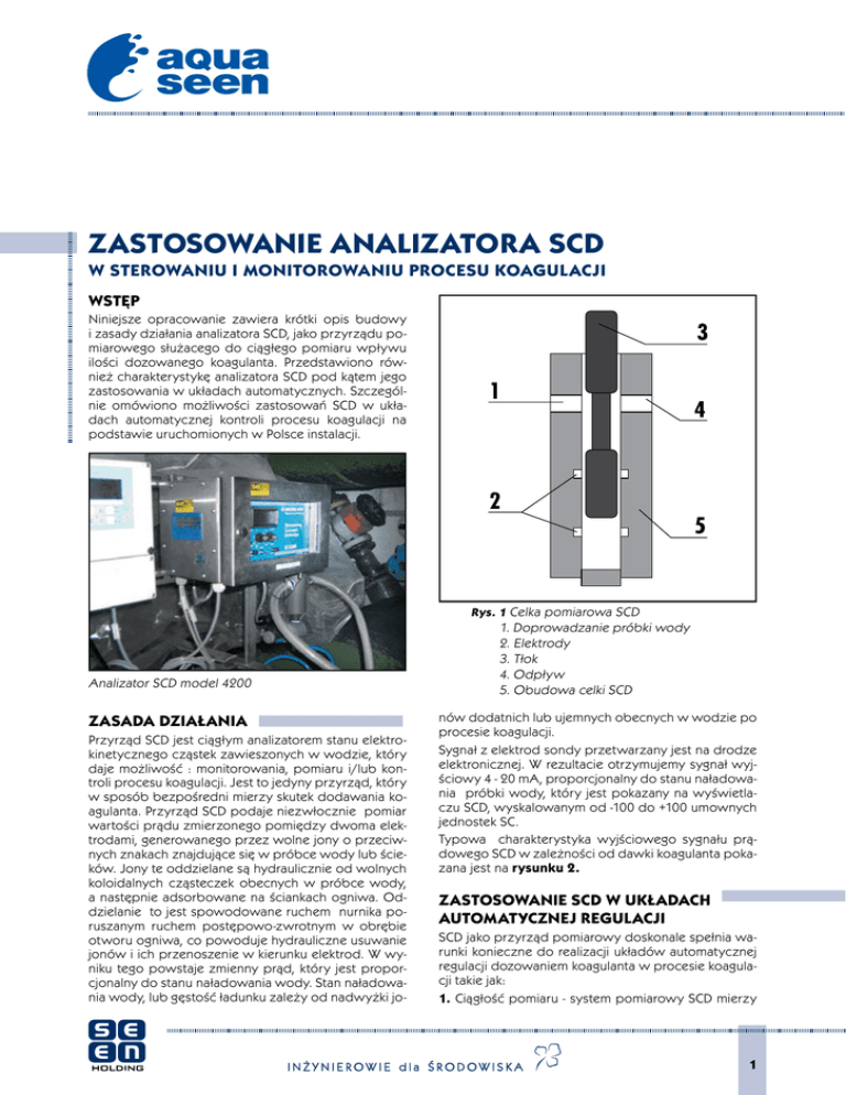 ZASTOSOWANIE ANALIZATORA SCD W STEROWANIU I MONITOROWANIU PROCESU KOAGULACJI WSTĘP Niniejsze opracowanie zawiera krótki opis budowy i zasady działania analizatora SCD, jako przyrządu pomiarowego służacego do ciągłego pomiaru wpływu ilości dozowanego koagulanta. Przedstawiono również charakterystykę analizatora SCD pod kątem jego zastosowania w układach automatycznych. Szczególnie omówiono możliwości zastosowań SCD w układach automatycznej kontroli procesu koagulacji na podstawie uruchomionych w Polsce instalacji. Rys. 1 Celka pomiarowa SCD Analizator SCD model 4200 ZASADA DZIAŁANIA Przyrząd SCD jest ciągłym analizatorem stanu elektrokinetycznego cząstek zawieszonych w wodzie, który daje możliwość : monitorowania, pomiaru i/lub kontroli procesu koagulacji. Jest to jedyny przyrząd, który w sposób bezpośredni mierzy skutek dodawania koagulanta. Przyrząd SCD podaje niezwłocznie pomiar wartości prądu zmierzonego pomiędzy dwoma elektrodami, generowanego przez wolne jony o przeciwnych znakach znajdujące się w próbce wody lub ścieków. Jony te oddzielane są hydraulicznie od wolnych koloidalnych cząsteczek obecnych w próbce wody, a następnie adsorbowane na ściankach ogniwa. Oddzielanie to jest spowodowane ruchem nurnika poruszanym ruchem postępowo-zwrotnym w obrębie otworu ogniwa, co powoduje hydrauliczne usuwanie jonów i ich przenoszenie w kierunku elektrod. W wyniku tego powstaje zmienny prąd, który jest proporcjonalny do stanu naładowania wody. Stan naładowania wody, lub gęstość ładunku zależy od nadwyżki jo- 1. Doprowadzanie próbki wody 2. Elektrody 3. Tłok 4. Odpływ 5. Obudowa celki SCD nów dodatnich lub ujemnych obecnych w wodzie po procesie koagulacji. Sygnał z elektrod sondy przetwarzany jest na drodze elektronicznej. W rezultacie otrzymujemy sygnał wyjściowy 4 - 20 mA, proporcjonalny do stanu naładowania próbki wody, który jest pokazany na wyświetlaczu SCD, wyskalowanym od -100 do +100 umownych jednostek SC. Typowa charakterystyka wyjściowego sygnału prądowego SCD w zależności od dawki koagulanta pokazana jest na rysunku 2. ZASTOSOWANIE SCD W UKŁADACH AUTOMATYCZNEJ REGULACJI SCD jako przyrząd pomiarowy doskonale spełnia warunki konieczne do realizacji układów automatycznej regulacji dozowaniem koagulanta w procesie koagulacji takie jak: 1. Ciągłość pomiaru - system pomiarowy SCD mierzy 1 Rys. 3 Układ regulacji ze sprzężeniem zwrotnym od SCD Rys. 2 Charakterystyka SCD próbkę wody 300 razy w ciągu minuty i dzięki temu reaguje nawet na chwilowe zmiany jakości wody. 2. Czas opóźnienia systemu pomiarowego - głównie zależy od zastosowanego systemu mieszania dozowanego koagulanta z uzdatnianą wodą. W układach rzeczywistych czas ten nie powinien przekraczać 3 minut, co pozwala na stosowanie układów regulacji pracujących w sprzężeniu zwrotnym według algorytmu PID. 3. Standartowy sygnał wyjściowy - SCD wyposażone jest w dwa wyjścia prądowe 4 - 20mA, które pozwalają na włączenie SCD w układ automatyki oraz rejestracji. 4. Funkcje pozwalające na dopasowanie SCD do parametrów dynamicznych dla danego obiektu - SCD posiada regulację czułości oraz filtracji pozwalające na dokładne dopasowanie się do realnych warunków dla konkretnego obiektu. 5. Dwustanowy sygnał wyjściowy - SCD wyposażone jest w dwa niezależne wyjścia dwustanowe z ustawialnymi progami zadziałania w całym zakresie pomiarowym. 6. Bezobsługowość - SCD wyposażone jest w układ automatycznego przemywania celki pomiarowej oraz układem tzw. funkcji HOLD pozwalającej na niezakłócony pomiar podczas przemywania. Układ automatycznego przemywania pozwala na zmniejszenie częstotliwości czynności obsługowych oraz na zwiększenie żywotności celki pomiarowej i elektrod. 7. INNE - SCD oferowane jest w dwóch modelach: SCD 4200 oraz SCD 5200. W obu modelach system pomiarowy jest taki sam. Model SCD 5200 wzbogacony jest w integralny mikroprocesorowy regulator PID. SCD W UKŁADACH AUTOMATYCZNEJ REGULACJI Układ podstawowy - proste sprzężenie zwrotne. Pełny zakres korzyści wynikających z zastosowania SCD osiąga się po włączeniu SCD w automatyczny układ kontroli dozowania koagulanta. Nawet surowa - jednorodna woda daje czasami mikroodchylenia, które mogą być wykryte przez SCD, na które automatyczny układ kontroli reaguje i odpowiada dokładnie i automatycznie. Podczas pojawienia się zakłóceń takich jak zaburzenia przepływu, podczas których gwałtownie wzrasta mętność wody, układ kontroli SCD reaguje natychmiast zwiększoną dawką chemikaliów w ce- 2 Rys. 4 Schemat instalacji automatycznego dozowa nia siarczanu glinu na wydziale PW1 Mokry Dwór, Wrocław Rys. 5 Schemat instalacji automatycznego dozowania koagulanta proporcjonalnie do przepływu wody surowej ze sprzężeniam zwrotnym od SCD lu utrzymania wartości zadanej. Praca operatora jest w tym przypadku ograniczona lub b.często po prostu wyeliminowana. Typowy automatyczny układ kontroli dawkowania koagulanta przedstawiono na rys. 3. Zastosowanie SCD w powyższym układzie automatycznej regulacji pozwala zrealizować następujące cele: 1. Odpowiednie dawkowanie chemikaliów w stosunku do zawartości zawiesiny w wodzie. 2. Odpowiednie dawkowanie niezależnie od fluktuacji w zawiesinie i/lub od natężenia przepływu surowej wody. Rys. 6 Instalacja w ZPW Pomorzany-Szczecin, układu automatycznej regulacji z SCD Rys. 7 Realizacja układu automatycznego dozowania koagulanta na ujeciu wody “Zwięczyca” 3. Odpowiednie dawkowanie niezależnie od zmian w koncentracji chemicznego roztworu koagulanta. Realizacja powyższego układu znajduje odzwierciedlenie przy kontroli procesu koagulacji oraz na wydziale PW1 MPWiK “Mokry Dwór” we Wrocławiu. Powyższy układ realizuje automatyczne dozowanie koagulanta tylko na podstawie pomiaru SCD, czyli wpływu dozowanego koagulanta na proces koagulacji. Układ automatycznie doregulowuje wyda