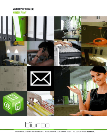 WYBIERZ OPTYMALNE MIEJSCE FIRMY OFERTA USŁUGI BIURA WIRTUALNEGO | WARSZAWA UL.OGRODOWA 31/35 | TEL. 22-620-33-33 BIURCO.PL MIEJSCE DLA FIRMY USŁUGA BIURA WIRTUALNEGO Oferujemy prosty i tani sposób na siedzibę firmy w centrum Warszawy - usługa biura wirtualnego zapewnia dobry adres dla rejestracji siedziby firmy wraz z wygodnym pakietem usług towarzyszących jak obsługa korespondencji przychodzącej, korzystanie z sal spotkań czy urządzonej przestrzeni biurowej. Dzięki niskim kosztom i elastyczności biuro wirtualne jest optymalnym rozwiązaniem dla młodych przedsiębiorstw. Warto jeszcze wiedzieć, że nasza lokalizacja podlega pod Urząd Skarbowy na Woli, który uważany jest za urząd skarbowy przyjazny przedsiębiorcom. OFERTA USŁUGI BIURA WIRTUALNEGO | WARSZAWA UL.OGRODOWA 31/35 | TEL. 22-620-33-33 BIURCO.PL BIURO WIRTUALNE PAKIETY USŁUG pakiet POST cena 100 PLN+VAT adres korespondencyjny idealny do celów marketingowych odbiór korespondencji przychodzącej powiadamianie o nadejściu korespondencji skanowanie korespondencji i wysyłka mailem zniżka na wynajem sal spotkań 10% pakiet OPTIMUM cena 200 PLN+VAT adres rejestrowy dla oficjalnej siedziby firmy umowa dająca prawo rejestracji siedziby odbiór korespondencji przychodzącej powiadamianie o nadejściu korespondencji skanowanie korespondencji i wysyłka mailem odsyłka pocztowa korespondencji na wskazany adres do 2x w miesiącu zniżka na wynajem sal spotkań 20% pakiet PREMIUM cena 300 PLN+VAT biuro wirtualne dla wymagających, wymagających usługa zawiera opcje pakietu optimum oraz: segregowanie korespondencji z odsyłką na wskazane adresy wysyłka zleconej korespondencji szafka skrytkowa na dokumentację firmową bezpłatny pakiet : 10 godzin sal spotkań lub 10 dni dostępu do przestrzeni biurowej zniżka na wynajem sal spotkań 50% ekspozycja logotypu w holu wejściowym budynku OFERTA USŁUGI BIURA WIRTUALNEGO | WARSZAWA UL.OGRODOWA 31/35 | TEL. 22-620-33-33 BIURCO.PL BIURO WIRTUALNE PROSTO OPTYMALNIE I ELASTYCZNIE umowa zawierana na czas nieokreślony tylko jeden miesiąc wypowiedzenia brak kaucji i zabezpieczeń prosta, jednostronicowa umowa minimum formalności i uruchomienie usług „od ręki” dostęp do realnej przestrzeni biurowej Opcje dodatkowe czynności rejestracyjne spółki przeprowadzone przez wspólpracująca kancelarię prawną cena od 450 PLN+VAT Urzędy pod jakie podlega nasze biuro wirtualne Urząd Skarbowy Warszawa-Wola ul. Powstańców Śląskich 2d, 01-381 Warszawa, tel: 22 533 66 00 ZUS Inspektorat Warszawa-Wola ul. Wrocławska 20, 01-493 Warszawa, tel: 22 665 55 11 Urząd Dzielnicy Wola m.st. Warszawa al. Solidarności 90, 01-003 Warszawa, tel: 22 504 83 00 (03) OFERTA USŁUGI BIURA WIRTUALNEGO | WARSZAWA UL.OGRODOWA 31/35 | TEL. 22-620-33-33 BIURCO.PL DOGODNA LOKALIZACJA PRAKTYCZNIE W CENTRUM WARSZAWY Mieścimy się w budynku tzw. Starej Drukarni w śródmieściu Warszawy przy skrzyżowaniu ulicy Ogrodowej i Żelaznej. Najbliższy przystanek komunikacji miejskiej to WOLA-RATUSZ lub CHŁODNA. Od Dworca Centralnego dzielą nas ledwie trzy przystanki. OFERTA USŁUGI BIURA WIRTUALNEGO | WARSZAWA UL.OGRODOWA 31/35 | TEL. 22-620-33-33 BIURCO.PL BIURCO JESZCZE WIĘCEJ MOŻLIWOŚCI Polecamy pozostałe nasze usługi: • elastyczny wynajem urządzonych stanowisk pracy w przestrzeni openspace • krótkoterminowy wynajem małych, wyposażonych biur • wynajem sal spotkań i sal szkoleniowych Jesteśmy największym najdłużej działającym biurem coworkingowym w Polsce! BĄDŹ PRZEDSIĘBIORCZY WYBIERZ BIURCO! zadzwoń i dowiedz się więcej napisz i zadaj nam pytania odwiedź naszą stronę internetową 22 620 33 33 [email protected] biurco.pl *Niniejsza oferta ważna jest do 30 dni od pobrania ze strony internetowej. OFERTA USŁUGI BIURA WIRTUALNEGO | WARSZAWA UL.OGRODOWA 31/35 | TEL. 22-620-33-33 BIURCO.PL
