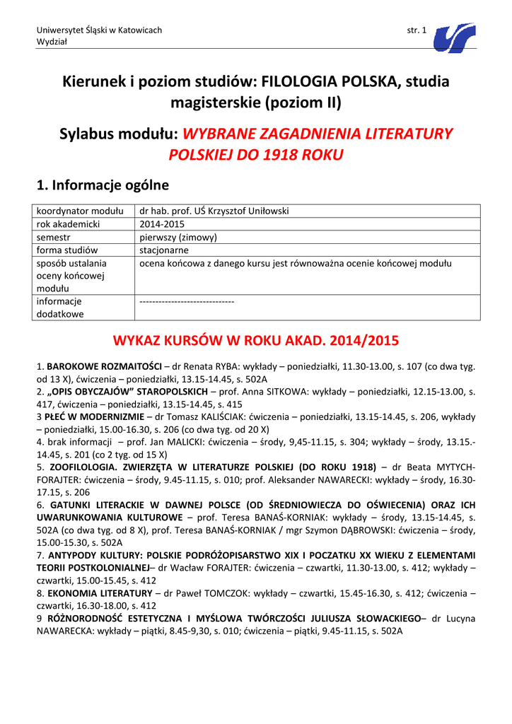 Uniwersytet Śląski w Katowicach Wydział str. 1 Kierunek i poziom studiów: FILOLOGIA POLSKA, studia magisterskie (poziom II) Sylabus modułu: WYBRANE ZAGADNIENIA LITERATURY POLSKIEJ DO 1918 ROKU 1. Informacje ogólne koordynator modułu rok akademicki semestr forma studiów sposób ustalania oceny końcowej modułu informacje dodatkowe dr hab. prof. UŚ Krzysztof Uniłowski 2014-2015 pierwszy (zimowy) stacjonarne ocena końcowa z danego kursu jest równoważna ocenie końcowej modułu ------------------------------ WYKAZ KURSÓW W ROKU AKAD. 2014/2015 1. BAROKOWE ROZMAITOŚCI – dr Renata RYBA: wykłady – poniedziałki, 11.30-13.00, s. 107 (co dwa tyg. od 13 X), ćwiczenia – poniedziałki, 13.15-14.45, s. 502A 2. „OPIS OBYCZAJÓW” STAROPOLSKICH – prof. Anna SITKOWA: wykłady – poniedziałki, 12.15-13.00, s. 417, ćwiczenia – poniedziałki, 13.15-14.45, s. 415 3 PŁEĆ W MODERNIZMIE – dr Tomasz KALIŚCIAK: ćwiczenia – poniedziałki, 13.15-14.45, s. 206, wykłady – poniedziałki, 15.00-16.30, s. 206 (co dwa tyg. od 20 X) 4. brak informacji – prof. Jan MALICKI: ćwiczenia – środy, 9,45-11.15, s. 304; wykłady – środy, 13.15.14.45, s. 201 (co 2 tyg. od 15 X) 5. ZOOFILOLOGIA. ZWIERZĘTA W LITERATURZE POLSKIEJ (DO ROKU 1918) – dr Beata MYTYCHFORAJTER: ćwiczenia – środy, 9.45-11.15, s. 010; prof. Aleksander NAWARECKI: wykłady – środy, 16.3017.15, s. 206 6. GATUNKI LITERACKIE W DAWNEJ POLSCE (OD ŚREDNIOWIECZA DO OŚWIECENIA) ORAZ ICH UWARUNKOWANIA KULTUROWE – prof. Teresa BANAŚ-KORNIAK: wykłady – środy, 13.15-14.45, s. 502A (co dwa tyg. od 8 X), prof. Teresa BANAŚ-KORNIAK / mgr Szymon DĄBROWSKI: ćwiczenia – środy, 15.00-15.30, s. 502A 7. ANTYPODY KULTURY: POLSKIE PODRÓŻOPISARSTWO XIX I POCZATKU XX WIEKU Z ELEMENTAMI TEORII POSTKOLONIALNEJ– dr Wacław FORAJTER: ćwiczenia – czwartki, 11.30-13.00, s. 412; wykłady – czwartki, 15.00-15.45, s. 412 8. EKONOMIA LITERATURY – dr Paweł TOMCZOK: wykłady – czwartki, 15.45-16.30, s. 412; ćwiczenia – czwartki, 16.30-18.00, s. 412 9 RÓŻNORODNOŚĆ ESTETYCZNA I MYŚLOWA TWÓRCZOŚCI JULIUSZA SŁOWACKIEGO– dr Lucyna NAWARECKA: wykłady – piątki, 8.45-9,30, s. 010; ćwiczenia – piątki, 9.45-11.15, s. 502A Uniwersytet Śląski w Katowicach Wydział str. 2 Nazwa wariantu modułu: Barokowe rozmaitości 2. Opis zajęć dydaktycznych i pracy studenta nazwa Barokowe rozmaitości kod -------------- prowadzący grupa(-y) treści zajęć dr Renata Ryba logowanie w systemie USOS (limit 18 osób) barokowe wizje nieba i piekła; między modą a grzechem; egzotyzm w literaturze polskiego baroku; wyobrażenia o Turkach i Tatarach w piśmiennictwie XVII wieku; w świecie egzemplów – o cudach i strachach; literatura barokowa o niewoli u Turków i Tatarów; barokowe ogrody; na pograniczu poezji i sztuki – ekfraza. metody prowadzenia zajęć 1/ wykład z wykorzystaniem prezentacji multimedialnych (15 godz.): przedstawia konteksty, historię danego zjawiska lub tendencji, ogólne założenia itp., 2/ ćwiczenia (30 godz.) dotyczą wybranych problemów z zakresu życia literackiego po 1989 oraz analizy i interpretacji dzieł ilustrujących omawiane tendencje w literaturze liczba godzin dydaktycznych (kontaktowych) liczba godzin pracy własnej studenta opis pracy własnej studenta organizacja zajęć literatura obowiązkowa 45 literatura uzupełniająca 135 Przygotowanie do zajęć, obejmujące zalecone lektury literackie i krytycznoliterackie; udział w przygotowaniu referatu Kurs obejmuje zajęcia o charakterze konwersatorium oraz dedykowany im wykład. Wymaga się udziału studenta w obu składowych kursu. M. Prejs: Egzotyzm w literaturze staropolskiej. Warszawa 1999; J. Sokolski: Staropolskie zaświaty. Wrocław 1994; D. Lichaczow: Poezja ogrodów. Warszawa 1991; M. Możdżyńska-Nowotka: O modach i strojach. Wrocław 2002. S. Twardowski: Przeważna legacyja (fragmenty); L. Ariosto: Orland szalony (fragmenty); G. Marino: Adone (fragmenty); M. Jurkowski: Historyje świeże i niezwyczajne (wybrane teksty). M. Prejs: Poezja późnego baroku; R. Ocieczek: Obleżenie Jasnej Góry Częstochowskiej. Dzieło i autor. Kraków 1993; J. Mielniczuk: Maszkara, baba, czarownica. W: Człowiek w literaturze polskiego baroku. Siedlce 2007; R. Krzywy: Od hodoeporikonu do eposu peregrynackiego. Warszawa 2001; R. Krzywy: Poezja staropolska wobec genologii retorycznej. Warszawa 2014; M. Prejs: Staropolskie kręgi inspiracji. Warszawa 2004; 3. Opis sposobów weryfikacji efektów kształcenia modułu nazwa Barokowe rozmaitości kod zajęć --------------------osoba dr Renata Ryba przeprowadzająca weryfikację grupa logowanie w systemie USOS (limit 18 osób) kod ------------------------- Uniwersytet Śląski w Katowicach Wydział wymagania merytoryczne kryteria oceny przebieg procesu weryfikacji str. 3 Test z wykładu; aktywność na zajęciach (w tym fakultatywne wystąpienia referatowe) test z wykładu (66% procent oceny końcowej) : aktywność na zajęciach (33% procent oceny końcowej) test przeprowadzony na ostatnim wykładzie: 5 pytań o charakterze opisowym; weryfikacja przygotowania studentów do ćwiczeń podczas każdych zajęć; Nazwa wariantu modułu: „Opis obyczajów” staropolskich 2. Opis zajęć dydaktycznych i pracy studenta nazwa „Opis obyczajów” staropolskich kod -------------- prowadzący grupa(-y) treści zajęć dr hab. Anna Sitkowa logowanie w systemie USOS (limit 18 osób) Zajęcia poświęcone zostaną „opisowi obyczajów” staropolskich w trzech podstawowych kontekstach. Interesować nas będą ówczesne preferencje czytelnicze, łączące się z lekturą dawnych bestsellerów (m. in. Żywotów świętych Piotra Skargi, drukowanych kalendarzy), a także herbarzy, stemmatów, genetliakonów, kazań pogrzebowych. Uwaga skupiona zostanie również na opisach obyczajów, zawartych w wybranych dziełach oddających czytelnicze gusty epoki (m.in. „pijana” facecjonistyka, książ