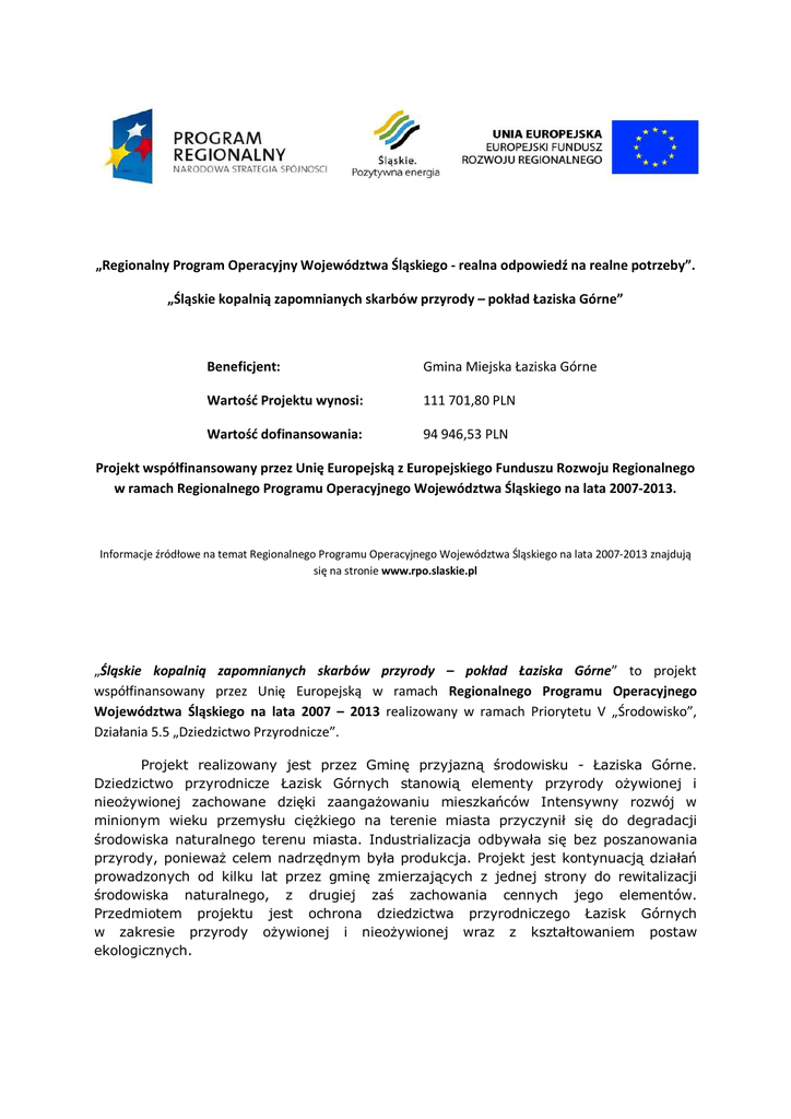 „Regionalny Program Operacyjny Województwa Śląskiego - realna odpowiedź na realne potrzeby”. „Śląskie kopalnią zapomnianych skarbów przyrody – pokład Łaziska Górne” Beneficjent: Gmina Miejska Łaziska Górne Wartość Projektu wynosi: 111 701,80 PLN Wartość dofinansowania: 94 946,53 PLN Projekt współfinansowany przez Unię Europejską z Europejskiego Funduszu Rozwoju Regionalnego w ramach Regionalnego Programu Operacyjnego Województwa Śląskiego na lata 2007-2013. Informacje źródłowe na temat Regionalnego Programu Operacyjnego Województwa Śląskiego na lata 2007-2013 znajdują się na stronie www.rpo.slaskie.pl „Śląskie kopalnią zapomnianych skarbów przyrody – pokład Łaziska Górne” to projekt współfinansowany przez Unię Europejską w ramach Regionalnego Programu Operacyjnego Województwa Śląskiego na lata 2007 – 2013 realizowany w ramach Priorytetu V „Środowisko”, Działania 5.5 „Dziedzictwo Przyrodnicze”. Projekt realizowany jest przez Gminę przyjazną środowisku - Łaziska Górne. Dziedzictwo przyrodnicze Łazisk Górnych stanowią elementy przyrody ożywionej i nieożywionej zachowane dzięki zaangażowaniu mieszkańców Intensywny rozwój w minionym wieku przemysłu ciężkiego na terenie miasta przyczynił się do degradacji środowiska naturalnego terenu miasta. Industrializacja odbywała się bez poszanowania przyrody, ponieważ celem nadrzędnym była produkcja. Projekt jest kontynuacją działań prowadzonych od kilku lat przez gminę zmierzających z jednej strony do rewitalizacji środowiska naturalnego, z drugiej zaś zachowania cennych jego elementów. Przedmiotem projektu jest ochrona dziedzictwa przyrodniczego Łazisk Górnych w zakresie przyrody ożywionej i nieożywionej wraz z kształtowaniem postaw ekologicznych. „Śląskie kopalnią zapomnianych skarbów przyrody – pokład Łaziska Górne” obejmuje dwa zasadnicze kierunki działań: 1. Kształtowanie postaw ekologicznych poprzez edukację, 2. Ochrona przyrodniczo – cennych elementów bioróżnorodności krajobrazu, W ramach pierwszego kierunku realizowane będą następujące zadania: 1.1. Wyposażenie Gimnazjum Nr 3 im. Przyjaciół Ziemi w Łaziskach Górnych w pomoce dydaktyczne, 1.2. Druk opracowanej ścieżki dydaktycznej na Kopaninie i w rejonie ul. Lasoki, W ramach drugiego kierunku realizowane będą następujące zadania: 2.1. Objecie ochroną konserwatorską i pielęgnacyjną przyrodniczo cennego drzewostanu (starodrzew, pomniki przyrody). 2.2. Objecie opieką fitosanitarną kasztanowców – akcja chrońmy kasztanowce. Projekt jest próbą wielokierunkowego połączenia działań ukierunkowanych na ukazanie wartości dziedzictwa przyrodniczego w Łaziskach Górnych. Łaziska Górne należą administracyjnie do Województwa Śląskiego - terenu bogatego pod kątem przyrodniczym, zatem bogactwo Łazisk Górnych jest bogactwem całego Województwa Śląskiego. Dlaczego tytuł projektu mówi o kopalni zapomnianych skarbów przyrody – dlatego, że niepodważalny fakt bogactwa przyrodniczego „Śląskiego” nie znajduje się w świadomości jego mieszkańców. Do ukazania walorów przyrodniczych Województwa Śląskiego służą prowadzone na szeroką skalę kampanie informacyjne i promocyjne, które pomagają „przypomnieć” mieszkańcom o zapomnianych skarbach przyrody. Świadomość życia w otoczeniu, które jest kształtowane przez wieloletnie dziedziczenie cennych przyrodniczo składników środowiska powoduje zmianę własnych relacji względem otoczenia i postrzegania otaczającej rzeczywistości. Właściwa relacja do własnego otoczenia powoduje integrację mieszkańców z miejscem zamieszkania rozbudzenie poczucia jego wartości, którą nadają nie tylko infrastruktura powstająca w wyniku działań i przekształceń antropogenicznych ale również za przyczyną trwałych elementów przyrodniczych. Działania projektu są ukierunkowane na realizację wielokierunkowej kampanii promocyjno – edukacyjnej dotyczącej przyrodniczych podstaw zrównoważonego rozwoju.
