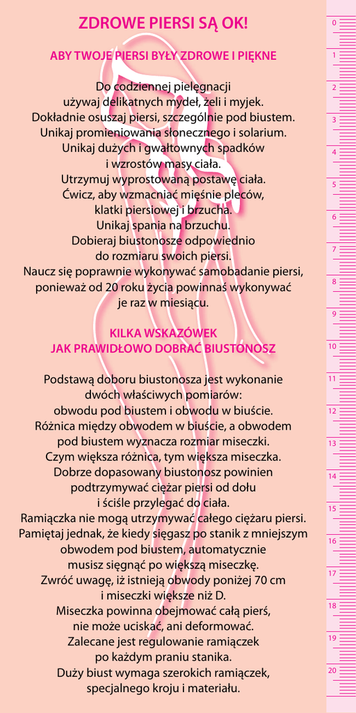 ZDROWE PIERSI SĄ OK! 0 ABY TWOJE PIERSI BYŁY ZDROWE I PIĘKNE 1 Do codziennej pielęgnacji używaj delikatnych mydeł, żeli i myjek. Dokładnie osuszaj piersi, szczególnie pod biustem. Unikaj promieniowania słonecznego i solarium. Unikaj dużych i gwałtownych spadków i wzrostów masy ciała. Utrzymuj wyprostowaną postawę ciała. Ćwicz, aby wzmacniać mięśnie pleców, klatki piersiowej i brzucha. Unikaj spania na brzuchu. Dobieraj biustonosze odpowiednio do rozmiaru swoich piersi. Naucz się poprawnie wykonywać samobadanie piersi, ponieważ od 20 roku życia powinnaś wykonywać je raz w miesiącu. 2 KILKA WSKAZÓWEK JAK PRAWIDŁOWO DOBRAĆ BIUSTONOSZ Podstawą doboru biustonosza jest wykonanie dwóch właściwych pomiarów: obwodu pod biustem i obwodu w biuście. Różnica między obwodem w biuście, a obwodem pod biustem wyznacza rozmiar miseczki. Czym większa różnica, tym większa miseczka. Dobrze dopasowany biustonosz powinien podtrzymywać ciężar piersi od dołu i ściśle przylegać do ciała. Ramiączka nie mogą utrzymywać całego ciężaru piersi. Pamiętaj jednak, że kiedy sięgasz po stanik z mniejszym obwodem pod biustem, automatycznie musisz sięgnąć po większą miseczkę. Zwróć uwagę, iż istnieją obwody poniżej 70 cm i miseczki większe niż D. Miseczka powinna obejmować całą pierś, nie może uciskać, ani deformować. Zalecane jest regulowanie ramiączek po każdym praniu stanika. Duży biust wymaga szerokich ramiączek, specjalnego kroju i materiału. 3 4 5 6 7 8 9 10 11 12 13 14 15 16 17 18 19 20 0 ZDROWE PIERSI SĄ OK! 1 PAMIĘTAJ! Nie każdy guzek jest rakiem piersi. 2 3 4 5 Każda zmiana wymaga szybkiej diagnostyki. Czym wcześniej wykryte zmiany, tym większe szanse na wyzdrowienie. Tylko systematyczne kontrolowanie piersi daje największe szanse na zachowanie zdrowia. Jeśli niepokoją Cię zmiany w piersiach, porozmawiaj o tym ze swoim lekarzem rodzinnym lub ginekologiem. CO CIĘ MOŻE NIEPOKOIĆ? zmiana kształtu piersi zmiana wyglądu skóry zmiany w obrębie otoczki brodawki wciągnięcie lub zmiana kierunku brodawki samoistny wyciek z brodawki zgrubienia lub guzki w piersi 6 7 Oddział Oświaty Zdrowotnej i Promocji Zdrowia WSSE ul. Nowogrodzka 82, 02-018 Warszawa tel. (22) 432 10 02, [email protected] Mazowiecki Kurator Oświaty Al. Jerozolimskie 32 00-024 Warszawa Materiały wydane przez Wojewódzką Stację Sanitarno – Epidemiologiczną w Warszawie w ramach wojewódzkiego programu edukacyjnego profilaktyki raka piersi.