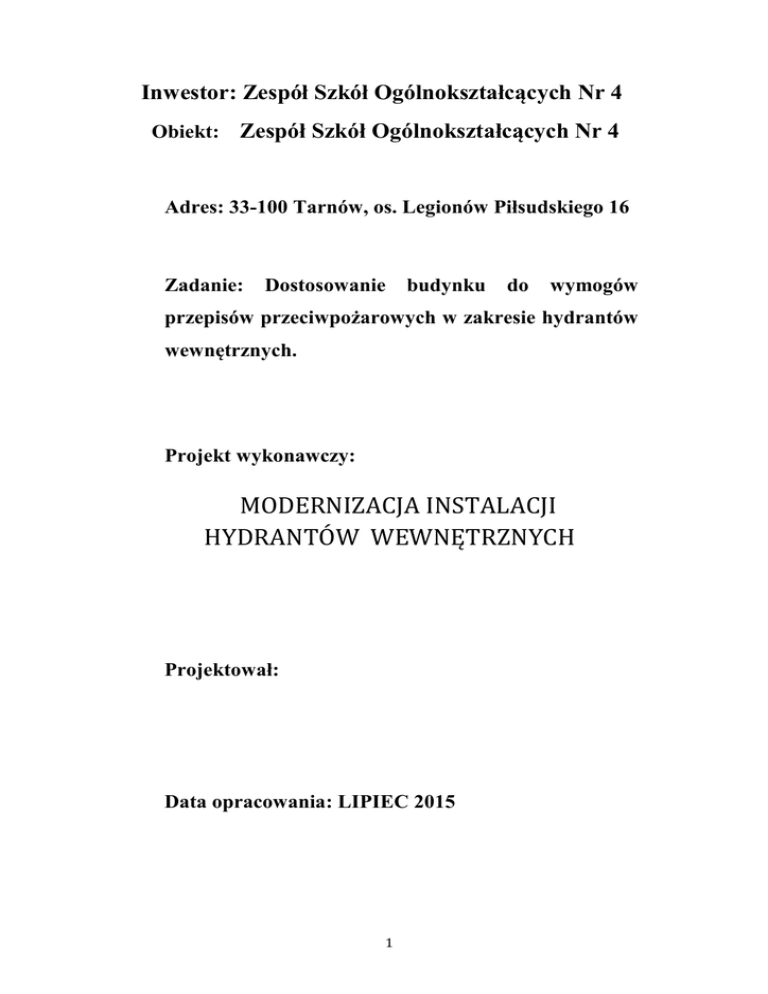Inwestor: Zespół Szkół Ogólnokształcących Nr 4 Obiekt: Zespół Szkół Ogólnokształcących Nr 4 Adres: 33-100 Tarnów, os. Legionów Piłsudskiego 16 Zadanie: Dostosowanie budynku do wymogów przepisów przeciwpożarowych w zakresie hydrantów wewnętrznych. Projekt wykonawczy: MODERNIZACJA INSTALACJI HYDRANTÓW WEWNĘTRZNYCH Projektował: Data opracowania: LIPIEC 2015 1 Spis treści OPIS DO PROJEKTU TECHNICZNEGO MODERNIZACJI INSTALACJI HYDRANTÓW WEWNĘTRZNYCH 25 Z WĘŻEM PÓŁSZTYWNYM......................................................................................... 3 1. UWAGI OGÓLNE ....................................................................................................................................................... 3 1.1. Inwestor ................................................................................................................................................................... 3 1.2. Podstawa opracowania ...................................................................................................................................... 3 1. 3. Zakres opracowania ........................................................................................................................................... 3 1.4. Ogólna charakterystyka obiektu .................................................................................................................... 4 2. Hydranty wewnętrzne z wężem półsztywnym .......................................................................................... 4 3. Zasilanie hydrantów wewnętrznych .............................................................................................................. 5 4. Rozmieszczenie elementów instalacji ............................................................................................................. 6 5. Wykonanie instalacji .............................................................................................................................................. 7 6. Zabezpieczenie przed wtórnym zanieczyszczeniem................................................................................. 7 7. Badania i próby. ........................................................................................................................................................ 8 8. Uwagi eksploatacyjne............................................................................................................................................. 8 9. Przepisy i normy związane .................................................................................................................................. 9 10. Zestawienie załączników ................................................................................................................................... 9 OŚWIADCZENIE........................................................................................................................................................... 10 INFORMACJA DOTYCZĄCA BEZPIECZEŃSTWA I OCHRONY ZDROWIA............................................. 11 2 OPIS DO PROJEKTU TECHNICZNEGO MODERNIZACJI INSTALACJI HYDRANTÓW WEWNĘTRZNYCH 25 Z WĘŻEM PÓŁSZTYWNYM 1. UWAGI OGÓLNE 1.1. INWESTOR Zespół Szkół Ogólnokształcących Nr 4 33-100 Tarnów, os. Legionów Piłsudskiego 16, 1.2. PODSTAWA OPRACOWANIA Projekt opracowano na podstawie: - zlecenia inwestora, - rzutów budowlanych z projektem architektonicznym i inwentaryzacji w obiekcie - obowiązujących norm i przepisów, katalogów i rozwiązań typowych, - danych zebranych przez projektanta. - Decyzji Komendanta Miejskiego PSP w Tarnowie znak MZ.5580.54.2014 z dnia 24 kwietnia 2014 roku: (...) 1. Wyposażyć w hydrant wewnętrzny 25 z wężem półsztywnym kondygnację podziemną w segmentach A i B budynku Zespołu Szkół Ogólnokształcących Nr 4 w Tarnowie oś. Legionów 16, w celu pełnej ochrony strefy pożarowej . Hydranty wewnętrzne jako urządzenia przeciwpożarowe należy wykonać zgodnie z projektem uzgodnionym z rzeczoznawcą ds. zabezpieczeń przeciwpożarowych, w terminie do 31 grudnia 2015 r. (...) 1. 3. ZAKRES OPRACOWANIA W projekcie zawarto instalację hydrantów wewnętrznych 25 z wężem półsztywnym w obiektach Zespołu Szkół Ogólnokształcących nr 4 w Tarnowie przy ulicy Legionów Piłsudskiego. 3 1.4. OGÓLNA CHARAKTERYSTYKA OBIEKTU Zespół budynków Zespołu Szkół Ogólnokształcących nr 4 w Tarnowie przy ulicy Legionów Piłsudskiego 4, pełni funkcję użyteczności publicznej i zalicza się do kategorii zagrożenia ludzi ZL III . Sale gimnastyczną zaliczono do kategorii zagrożenia ludzi ZL I. Kondygnacje budynku stanowią jedną strefę pożarową. Część podziemna pełni funkcje zaplecza, zawiera również szatnie, część nadziemna zawiera pomieszczenia biurowe, sanitarne i sale dydaktyczne. Obciążenie ogniowe w części podziemnej nie przekracza 500 MJ/m2. 1. Informacja o warunkach techniczno-budowlanych 1) projekt nie wprowadza zmian w uzbrojenie terenu, bilans terenu, powierzchnię zabudowy, powierzchnię użytkowa i kubaturę budynku, 2) obiekt nie jest objęty ochroną konserwatorską, 3) projektowane rozwiązania materiałowe, funkcjonalne nie wywierają ujemnego wpływu na środowisko naturalne, zdrowie użytkowników i otoczenie. 4) inwestycja nie wymaga wycinki drzew. 5) projektowana inwestycja nie wpływa i nie ogranicza interesów osób trzecich, nie wpływa na ograniczenie możliwości korzystania z istniejącej infrastruktury technicznej. 2. HYDRANTY WEWNĘTRZNE Z WĘŻEM PÓŁSZTYWNYM W budynku istnieje instalacja hydrantów wewnętrznych H25 z wężem płasko składanym. Istniejąca instalacja nie spełnia aktualnie obowiązujących wymagań w zakresie wyposażenia obiektu w hydranty wewnętrzne. Przewiduje się demontaż istniejących szafek hydrantowych z wężem płasko składanym. Do zabezpieczenia przeciwpożarowego części obiektów przewidziano instal