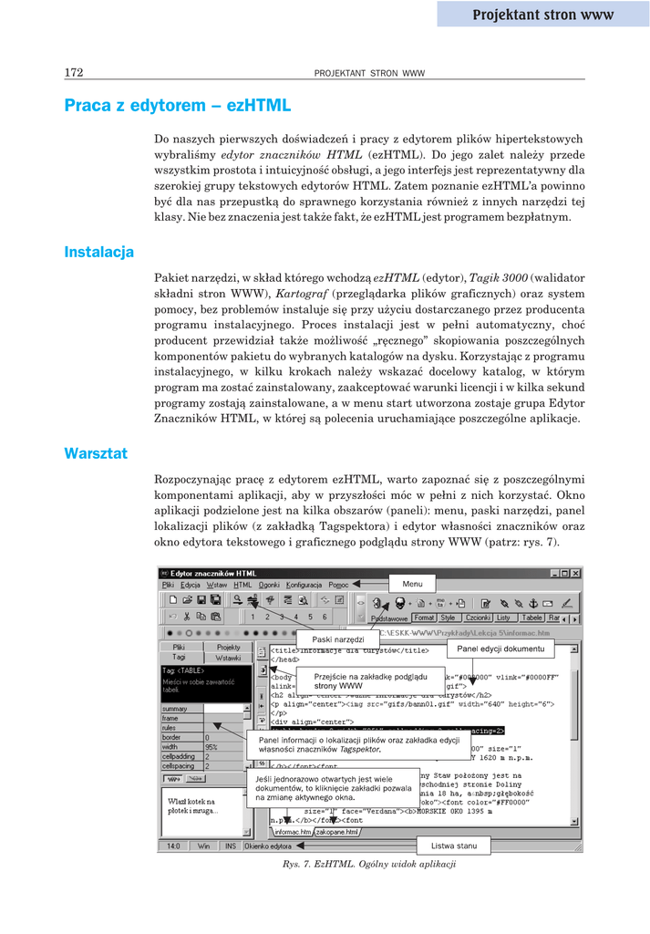Projektant stron www PROJEKTANT STRON WWW 172 Praca z edytorem – ezHTML Do naszych pierwszych doœwiadczeñ i pracy z edytorem plików hipertekstowych wybraliœmy edytor znaczników HTML (ezHTML). Do jego zalet nale¿y przede wszystkim prostota i intuicyjnoœæ obs³ugi, a jego interfejs jest reprezentatywny dla szerokiej grupy tekstowych edytorów HTML. Zatem poznanie ezHTML’a powinno byæ dla nas przepustk¹ do sprawnego korzystania równie¿ z innych narzêdzi tej klasy. Nie bez znaczenia jest tak¿e fakt, ¿e ezHTML jest programem bezp³atnym. Instalacja Pakiet narzêdzi, w sk³ad którego wchodz¹ ezHTML (edytor), Tagik 3000 (walidator sk³adni stron WWW), Kartograf (przegl¹darka plików graficznych) oraz system pomocy, bez problemów instaluje siê przy u¿yciu dostarczanego przez producenta programu instalacyjnego. Proces instalacji jest w pe³ni automatyczny, choæ producent przewidzia³ tak¿e mo¿liwoœæ „rêcznego” skopiowania poszczególnych komponentów pakietu do wybranych katalogów na dysku. Korzystaj¹c z programu instalacyjnego, w kilku krokach nale¿y wskazaæ docelowy katalog, w którym program ma zostaæ zainstalowany, zaakceptowaæ warunki licencji i w kilka sekund programy zostaj¹ zainstalowane, a w menu start utworzona zostaje grupa Edytor Znaczników HTML, w której s¹ polecenia uruchamiaj¹ce poszczególne aplikacje. Warsztat Rozpoczynaj¹c pracê z edytorem ezHTML, warto zapoznaæ siê z poszczególnymi komponentami aplikacji, aby w przysz³oœci móc w pe³ni z nich korzystaæ. Okno aplikacji podzielone jest na kilka obszarów (paneli): menu, paski narzêdzi, panel lokalizacji plików (z zak³adk¹ Tagspektora) i edytor w³asnoœci znaczników oraz okno edytora tekstowego i graficznego podgl¹du strony WWW (patrz: rys. 7). Rys. 7. EzHTML. Ogólny widok aplikacji ZESZYT 5 173 Pracê z edytorem mo¿emy rozpocz¹æ od budowy nowego dokumentu albo wczytaæ istniej¹cy dokument z dysku. Poniewa¿ w czasie naszych wczeœniejszych doœwiadczeñ utworzyliœmy ju¿ sporo plików HTML, to warto przyspieszyæ poznawanie edytora i wczytaæ gotow¹ stronê WWW. W tym celu nale¿y wybraæ z menu polecenie Plik/ Otwórz lub klikn¹æ ikonkê na pasku narzêdzi. Kolorowanie sk³adni HTML Po wczytaniu dokumentu ezHTML natychmiast koloruje sk³adniê, oznaczaj¹c odrêbnymi kolorami wyró¿nione grupy znaczników, ich parametry i treœæ dokumentu. Znakomicie u³atwia to pracê nad redagowaniem kodu HTML. Podgl¹d strony WWW Podgl¹d strony WWW w oknie przegl¹darki wymaga obecnoœci na dysku Internet Explorera i/lub Netscapa. EzHTML sam rozpoznaje obecnoœæ tych programów, udostêpniaj¹c nam mo¿liwoœæ podgl¹du edytowanego dokumentu we wbudowanych kontrolkach IE i NN. Przejœcie do trybu podgl¹du dokumentu wymaga jedynie klikniêcia ikony na zak³adce w lewym górnym rogu panelu edycji (patrz: rys. 8). Istnieje tak¿e mo¿liwoœæ wywo³ania zewnêtrznej przegl¹darki z automatycznie za³adowanym bie¿¹cym dokumentem (menu: HTML/ Podgl¹d). W pewnych okolicznoœciach równie¿ ta funkcja mo¿e siê przydaæ. Przyk³adem takiej sytuacji jest praca nad dokumentem, w którym graficzne t³o strony i jej treœæ zajmuje ca³y ekran monitora lub ca³e okno przegl¹darki. W projektach tego typu zak³ada siê bardzo czêsto, ¿e w przegl¹darce nie bêdzie potrzeby u¿ywania suwaków pionowych i poziomych. Sprawdzanie wygl¹du takiego dokumentu w okienku podgl¹du wbudowanym w edytor mo¿e nie odwzorowaæ obrazu, jaki zobaczy internauta odwiedzaj¹cy stronê WWW. W takich przypadkach warto dokument testowaæ w przegl¹darce. Rys. 8. Podgl¹d strony WWW wbudowany w edytor ezHTML