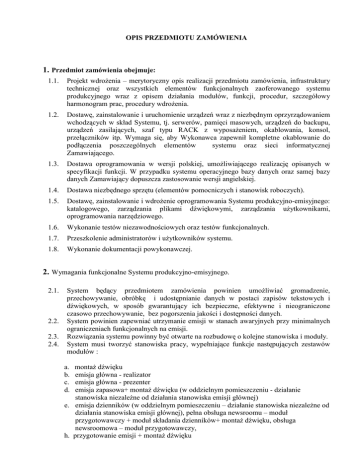 OPIS PRZEDMIOTU ZAMÓWIENIA 1. Przedmiot zamówienia obejmuje: 1.1. Projekt wdroŜenia – merytoryczny opis realizacji przedmiotu zamówienia, infrastruktury technicznej oraz wszystkich elementów funkcjonalnych zaoferowanego systemu produkcyjnego wraz z opisem działania modułów, funkcji, procedur, szczegółowy harmonogram prac, procedury wdroŜenia. 1.2. Dostawę, zainstalowanie i uruchomienie urządzeń wraz z niezbędnym oprzyrządowaniem wchodzących w skład Systemu, tj. serwerów, pamięci masowych, urządzeń do backupu, urządzeń zasilających, szaf typu RACK z wyposaŜeniem, okablowania, konsol, przełączników itp. Wymaga się, aby Wykonawca zapewnił kompletne okablowanie do podłączenia poszczególnych elementów systemu oraz sieci informatycznej Zamawiającego. 1.3. Dostawa oprogramowania w wersji polskiej, umoŜliwiającego realizację opisanych w specyfikacji funkcji. W przypadku systemu operacyjnego bazy danych oraz samej bazy danych Zamawiający dopuszcza zastosowanie wersji angielskiej. 1.4. Dostawa niezbędnego sprzętu (elementów pomocniczych i stanowisk roboczych). 1.5. Dostawę, zainstalowanie i wdroŜenie oprogramowania Systemu produkcyjno-emisyjnego: katalogowego, zarządzania plikami dźwiękowymi, zarządzania uŜytkownikami, oprogramowania narzędziowego. 1.6. Wykonanie testów niezawodnościowych oraz testów funkcjonalnych. 1.7. Przeszkolenie administratorów i uŜytkowników systemu. 1.8. Wykonanie dokumentacji powykonawczej. 2. Wymagania funkcjonalne Systemu produkcyjno-emisyjnego. 2.1. 2.2. 2.3. 2.4. System będący przedmiotem zamówienia powinien umoŜliwiać gromadzenie, przechowywanie, obróbkę i udostępnianie danych w postaci zapisów tekstowych i dźwiękowych, w sposób gwarantujący ich bezpieczne, efektywne i nieograniczone czasowo przechowywanie, bez pogorszenia jakości i dostępności danych. System powinien zapewniać utrzymanie emisji w stanach awaryjnych przy minimalnych ograniczeniach funkcjonalnych na emisji. Rozwiązania systemu powinny być otwarte na rozbudowę o kolejne stanowiska i moduły. System musi tworzyć stanowiska pracy, wypełniające funkcje następujących zestawów modułów : a. b. c. d. montaŜ dźwięku emisja główna - realizator emisja główna - prezenter emisja zapasowa+ montaŜ dźwięku (w oddzielnym pomieszczeniu - działanie stanowiska niezaleŜne od działania stanowiska emisji głównej) e. emisja dzienników (w oddzielnym pomieszczeniu – działanie stanowiska niezaleŜne od działania stanowiska emisji głównej), pełna obsługa newsroomu – moduł przygotowawczy + moduł składania dzienników+ montaŜ dźwięku, obsługa newsroomowa – moduł przygotowawczy, h. przygotowanie emisji + montaŜ dźwięku i. obsługa muzyki + rotacja muzyczna j. obsługa archiwum k. obsługa reklamy + montaŜ dźwięku l. obsługa raportów i rozliczeń m. obsługa internetowa n. obsługa administracyjna 2.5. System musi pozwalać na wykorzystywanie róŜnych typów plików dźwiękowych i tekstowych (w tym mp2, mp3 oraz liniowych wav i plików BWF wav 24 bit). Zakres częstotliwości próbkowania wczytywanych plików dźwiękowych musi obejmować co najmniej częstotliwości 44,1 kHz i 48 kHz, zakres przepływności od 32 kbit/sek. do 384 kbit/sek. 3. Wymagania dotyczące środowiska pracy uŜytkownika. Wobec przewidywanej ewolucji wymagań dotyczących pól opisowych dźwięków, musi istnieć moŜliwość dodawania nowych pól opisowych w formularzach opisu materiałów, z moŜliwością dynamicznej propagacji na istniejące materiały. Musi być to moŜliwe do wykonania systemu, przez administratora systemu z ewentualnym udziałem Wykonawcy. 4. Wymagania dotyczące budowy i funkcjonalności modułów. 4.1. • • • • • • • • • • • • • • • • • Moduł montaŜowy. Wymagane funkcje i właściwości: montaŜ musi być niedestrukcyjny, zapis musi być co najmniej 16 bitowy, 8 ścieŜkowy mono (minimum 4 ślady stereo), moŜliwość zapisu i edycji materiałów minimum 2 GB pojedynczego pliku audio, moŜliwość bezpośredniego, szybkiego wczytywania ścieŜek dźwiękowych ze standardowego CD/DVD oraz plików z pamięci wymiennych typu flash USB, moŜliwość bezpośredniego opisywania dźwięków i dołączania opisu do dźwięku, Opis powinien uwzględniać moŜliwość zadania wybranych pól jako obowiązkowych, wszystkie dane opisowe muszą być modyfikowalne na kaŜdym etapie produkcji oraz powinny pozwalać na wyszukiwanie i sortowanie wg indywidualnie tworzonych filtrów, moŜliwość dowolnego zaznaczania, wycinania, przesuwania i wstawiania bloków dźwiękowych, moŜliwość automatycznej normalizacji oraz ręcznej zmiany poziomu nagrania, moŜliwość wstawiania znaczników i przeszukiwania dźwięku wg znaczników, funkcja undo (cofnij) min. 10 kroków wstecz, moŜliwość graficznego kształtowania obwiedni narastania, wyciszania i przenikania, informowanie o czasach (czas zaznaczonego bloku, pozycja głowicy, czas sumaryczny dźwięku), moŜliwość zainstalowania i pracy modułu na stacji roboczej niepodłączonej do serwera, moŜliwość wyboru zapisu dźwięku w pamięci masowej systemu lub na dysku lokalnym stanowiska, moŜliwość zainstalowania wtyczek ( plug-in ), jako typowych efektów dźwiękowych w standardzie VST lub DirectX, przesuwanie dźwięków pomiędzy ścieŜkami na zasadzie drag & drop. Strona 2 z 8 4.2. • • • • • • Moduł przygotowania dźwięku. Funkcje modułu muszą umoŜliwiać : definiowanie co najmniej dwóch niezaleŜnych list emisyjnych na minimum 7 dni naprzód, moŜliwość oglądania i edycji list, pracę z dwóch monitorów, definiowanie wzoru ramówki poprzez tworzenie szablonów stałych pozycji programu, odtwarzanie fragmentu listy emisyjnej i ramówki, edytowanie ramówki, listy emisyjnej, pojedynczych pozycji listy wraz z ich opisami. Moduł powinien mieć wbudowany edytor o moŜliwościach co najmniej: • odsłuch z 