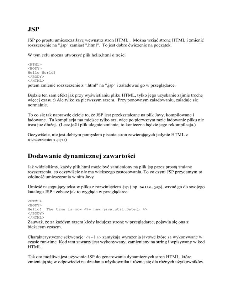 Jak widzieliśmy, kaŜdy plik.html moŜe być zamieniony na plik.jsp przez prostą zmianę