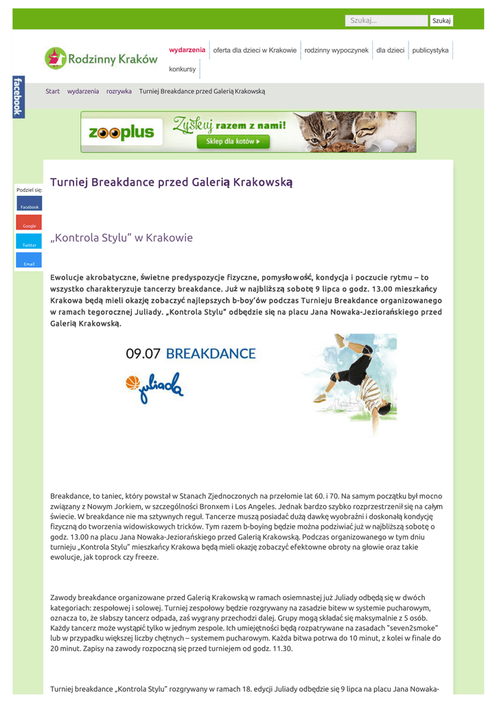 Szukaj... wydarzenia oferta dla dzieci w Krakowie rodzinny wypoczynek dla dzieci Szukaj publicystyka konkursy Start wydarzenia rozrywka Turniej Breakdance przed Galerią Krakowską Turniej Breakdance przed Galerią Krakowską Podziel się: Facebook Google Twitter „Kontrola Stylu” w Krakowie Email Ewolucje akrobatyczne, świetne predyspozycje fizyczne, pomysło w ość, kondycja i poczucie rytmu – to wszystko charakteryzuje tancerzy breakdance. Już w najbliżs zą sobotę 9 lipca o godz. 13.00 mieszkańc y Krakowa będą mieli okazję zobaczyć najlepszych b-boy’ów podczas Turnieju Breakdance organizowanego w ramach tegorocznej Juliady. „Kontrola Stylu” odbędzie się na placu Jana Nowaka-Jeziorańskiego przed Galerią Krakowską. Breakdance, to taniec, który powstał w Stanach Zjednoczonych na przełomie lat 60. i 70. Na samym początku był mocno związany z Nowym Jorkiem, w szczególności Bronxem i Los Angeles. Jednak bardzo szybko rozprzestrzenił się na całym świecie. W breakdance nie ma sztywnych reguł. Tancerze muszą posiadać dużą dawkę wyobraźni i doskonałą kondycję fizyczną do tworzenia widowiskowych tricków. Tym razem b-boying będzie można podziwiać już w najbliższą sobotę o godz. 13.00 na placu Jana Nowaka-Jeziorańskiego przed Galerią Krakowską. Podczas organizowanego w tym dniu turnieju „Kontrola Stylu” mieszkańcy Krakowa będą mieli okazję zobaczyć efektowne obroty na głowie oraz takie ewolucje, jak toprock czy freeze. Zawody breakdance organizowane przed Galerią Krakowską w ramach osiemnastej już Juliady odbędą się w dwóch kategoriach: zespołowej i solowej. Turniej zespołowy będzie rozgrywany na zasadzie bitew w systemie pucharowym, oznacza to, że słabszy tancerz odpada, zaś wygrany przechodzi dalej. Grupy mogą składać się maksymalnie z 5 osób. Każdy tancerz może wystąpić tylko w jednym zespole. Ich umiejętności będą rozpatrywane na zasadach "seven2smoke" lub w przypadku większej liczby chętnych – systemem pucharowym. Każda bitwa potrwa do 10 minut, z kolei w finale do 20 minut. Zapisy na zawody rozpoczną się przed turniejem od godz. 11.30. Turniej breakdance „Kontrola Stylu” rozgrywany w ramach 18. edycji Juliady odbędzie się 9 lipca na placu Jana Nowaka- Jeziorańskiego przed Galerią Krakowską od godz. 13.00. Juliada to impreza sportowo-rekreacyjna organizowana w Krakowie od 1999 r. Organizatorem imprezy jest Miasto Kraków oraz Stowarzyszenie SIEMACHA. Impreza skierowana jest do młodych osób, pozostających w mieście podczas wakacji (nazwa wydarzenia pochodzi od łacińskiego słowa określającego miesiąc lipiec, w którym rokrocznie odbywa się Juliada). Tegoroczna impreza wystartowała 26 czerwca i trwać będzie do 27 lipca. W trakcie JULIADY będzie promowanych dziesięć dyscyplin sportowych, w których zostaną zorganizowane zawody dla dzieci i młodzieży: STREETBALL, PIŁKA RĘCZNA, TENIS STOŁOWY, FUTSAL (PIŁKA NOŻNA HALOWA), PIŁKA NOŻNA, BADMINTON, SIATKÓWKA, SZACHY, BREAKDANCE, WSPINACZKA SPORTOWA. Zawody odbywać się będą w nowohuckim Centrum Rozwoju Com- Com Zone oraz na Placu Jana Nowaka-Jeziorańskiego w Krakowie. Uczestników Juliady zapraszamy również do bezpłatnego korzystania ze ściany wspinaczkowej, która pojawi się w dniach 16-17 lipca przed Galerią Krakowską. Utworzono: 08 lipiec 2016 zobacz także: Festiwal Kultury Koreańskiej Konkurs filmowy dla dzieci i młodzieży "Tak to... Poznaj swoje mocne strony Młodzieżowy Chór Gospel Sto lekcji o Kolekcji w MOCAK-u Bezpieczne lekcje z ekspertami TAURON Dystrybucja.... WYDARZENIA warsztaty wakacje 2016 akcje/projekty/konkursy Zaprzyjaźnij się z emocjami Największa w Polsce Wystawa Budowli z Klocków... Zostań Ambasadorem P s z c z ół i zakładaj Strefy... Klub latających podróżników. Warsztaty dla... kino kursy/szkolenia muzea muzyka rozrywka teatr/opera targi/konferencje/festiwale wystawy NEWSLETTER Z przyjemnością będziemy informować Państwa o najciekawszych wydarzeniach i ofertach dla dzieci i rodzin (nie tylko z Krakowa:)! Wystarczy zapisać s ię do naszej listy mailingowej. E-mail Zapisz się Wypisz się TAGI literatura dla dzieci recenzje zwierzęta 87 30 22 wakacje konkurs zdrowie turystyka 19 18 17 13 literatura dla młodzieży zwierzęta w domu 13 13 sport 12 © 2016 Rodzinny Kraków archiwum kontakt o nas partnerzy polityka prywatności współpraca