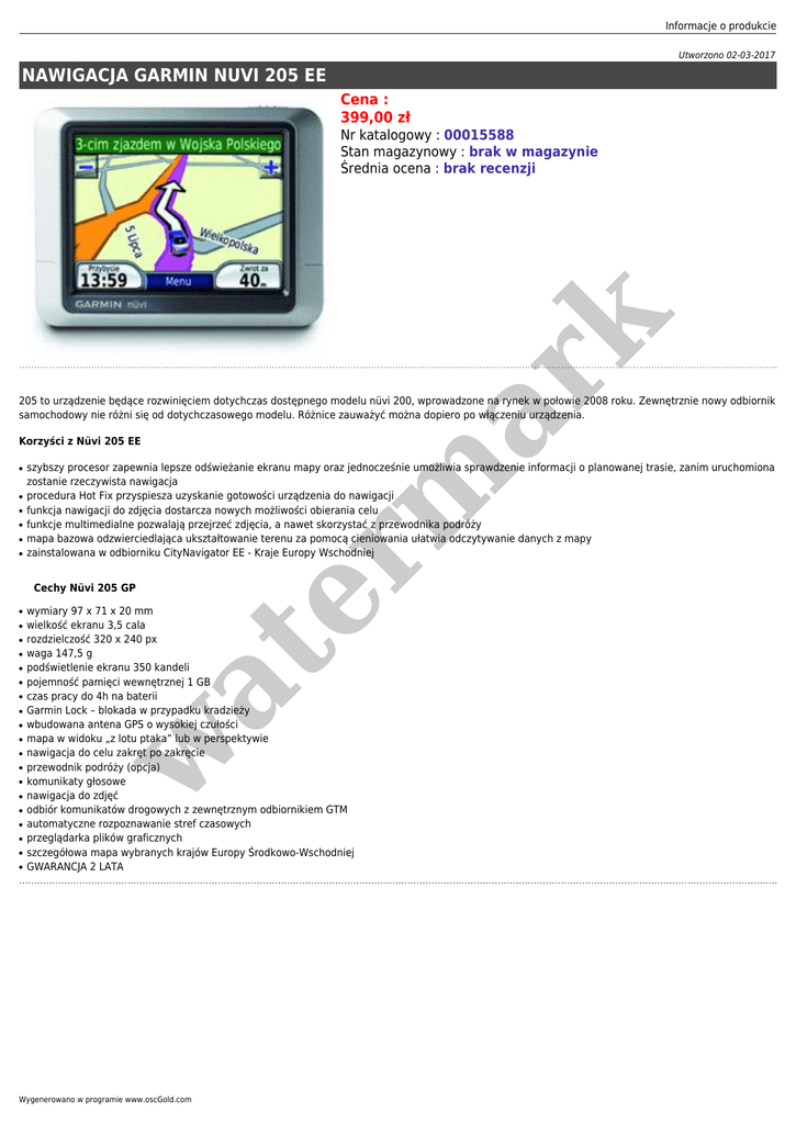 Informacje o produkcie Utworzono 02-03-2017 NAWIGACJA GARMIN NUVI 205 EE Cena : 399,00 zł er m ar k Nr katalogowy : 00015588 Stan magazynowy : brak w magazynie Średnia ocena : brak recenzji 205 to urządzenie będące rozwinięciem dotychczas dostępnego modelu nüvi 200, wprowadzone na rynek w połowie 2008 roku. Zewnętrznie nowy odbiornik samochodowy nie różni się od dotychczasowego modelu. Różnice zauważyć można dopiero po włączeniu urządzenia. Korzyści z Nüvi 205 EE ● ● ● ● ● ● szybszy procesor zapewnia lepsze odświeżanie ekranu mapy oraz jednocześnie umożliwia sprawdzenie informacji o planowanej trasie, zanim uruchomiona zostanie rzeczywista nawigacja procedura Hot Fix przyspiesza uzyskanie gotowości urządzenia do nawigacji funkcja nawigacji do zdjęcia dostarcza nowych możliwości obierania celu funkcje multimedialne pozwalają przejrzeć zdjęcia, a nawet skorzystać z przewodnika podróży mapa bazowa odzwierciedlająca ukształtowanie terenu za pomocą cieniowania ułatwia odczytywanie danych z mapy zainstalowana w odbiorniku CityNavigator EE - Kraje Europy Wschodniej Cechy Nüvi 205 GP ● ● ● ● ● ● ● ● ● ● ● ● ● ● ● ● ● wymiary 97 x 71 x 20 mm wielkość ekranu 3,5 cala rozdzielczość 320 x 240 px waga 147,5 g podświetlenie ekranu 350 kandeli pojemność pamięci wewnętrznej 1 GB czas pracy do 4h na baterii Garmin Lock – blokada w przypadku kradzieży wbudowana antena GPS o wysokiej czułości mapa w widoku „z lotu ptaka” lub w perspektywie nawigacja do celu zakręt po zakręcie przewodnik podróży (opcja) komunikaty głosowe nawigacja do zdjęć odbiór komunikatów drogowych z zewnętrznym odbiornikiem GTM automatyczne rozpoznawanie stref czasowych przeglądarka plików graficznych szczegółowa mapa wybranych krajów Europy Środkowo-Wschodniej GWARANCJA 2 LATA at ● w ● Wygenerowano w programie www.oscGold.com