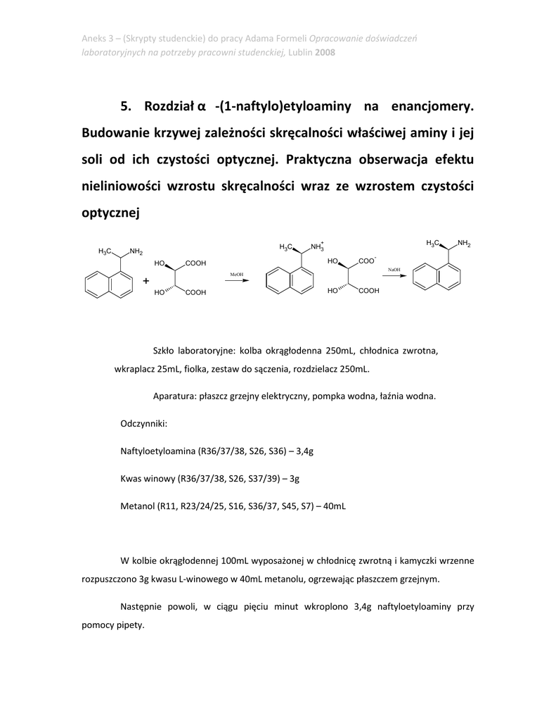Aneks 3 – (Skrypty studenckie) do pracy Adama Formeli Opracowanie doświadczeń laboratoryjnych na potrzeby pracowni studenckiej, Lublin 2008 5. Rozdział α -(1-naftylo)etyloaminy na enancjomery. Budowanie krzywej zależności skręcalności właściwej aminy i jej soli od ich czystości optycznej. Praktyczna obserwacja efektu nieliniowości wzrostu skręcalności wraz ze wzrostem czystości optycznej H3C H3C NH2 HO H3C + NH3 HO COOH COO NH2 NaOH MeOH + HO COOH HO COOH Szkło laboratoryjne: kolba okrągłodenna 250mL, chłodnica zwrotna, wkraplacz 25mL, fiolka, zestaw do sączenia, rozdzielacz 250mL. Aparatura: płaszcz grzejny elektryczny, pompka wodna, łaźnia wodna. Odczynniki: Naftyloetyloamina (R36/37/38, S26, S36) – 3,4g Kwas winowy (R36/37/38, S26, S37/39) – 3g Metanol (R11, R23/24/25, S16, S36/37, S45, S7) – 40mL W kolbie okrągłodennej 100mL wyposażonej w chłodnicę zwrotną i kamyczki wrzenne rozpuszczono 3g kwasu L-winowego w 40mL metanolu, ogrzewając płaszczem grzejnym. Następnie powoli, w ciągu pięciu minut wkroplono 3,4g naftyloetyloaminy przy pomocy pipety. Aneks 3 – (Skrypty studenckie) do pracy Adama Formeli Opracowanie doświadczeń laboratoryjnych na potrzeby pracowni studenckiej, Lublin 2008 Przeniesiono na uprzednio przygotowaną łaźnię wodną o temperaturze 50°C. Po ochłodzeniu do temperatury pokojowej zaobserwowano wzrost kryształów. Po 30 minutach krystalizacji odsączono kryształy na lejku Schotta i przemyto 10mL metanolu. Kryształy suszono za pomocą wodnej pompki próżniowej. Po wysuszeniu uzyskano 1,51g kryształów. Przesącz pozostawiono do dalszej krystalizacji. W wyniku analogicznego postępowania po drugiej krystalizacji (3 dni) uzyskano 1,95g kryształów. US Patent 2,996,545; 1961. Pytanie kontrolne: Na podstawie wyników wszystkich studentów z grupy zbuduj wykresy zależności skręcalności naftyloetyloaminy od skręcalności jej soli z kwasem winowym oraz czystości enancjomerycznej aminy od skręcalności winianu naftyloetyloaminy. Zaproponuj wytłumaczenie nieliniowości przebiegu skręcalności winianu naftyloetyloaminy od czystości optycznej wydzielanej naftyloetyloaminy.