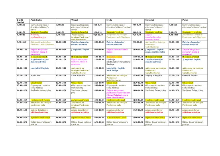 2-latki Starfish 7.00-8.30 Poniedziałek Środa Wtorek Indywidualna praca z dzieckiem/ children’s arrival Śniadanie / breakfast Warsztaty psychoedukacyjne 7.00-8.30 Indywidualna praca z dzieckiem/ children’s arrival Śniadanie/breakfast Aktywność na świeżym Powietrzu / walk/Sherborne Zajęcia edukacyjne/ didactic activities 7.00-8.30 Indywidualna praca z dzieckiem/ children’s arrival 7.00-8.30 9.00-9.20 9.20-10.20 Śniadanie/ breakfast Aktywność na świeżym Powietrzu / walk/Sherborne 9.00-9.20 9.20-9.50 9.50-10.40 Aktywność na świeżym Powietrzu / walk/Sherborne 10.00-10.20 10.20-10.40 Zajęcia edukacyjne/ didactic activities 9.50-10.40 10.40-11.00 Zajęcia muzyczno – ruchowe/ music & movement II śniadanie/ snack Zajęcia edukacyjne/ didactic activities 10.30-10.50 j. angielski / English 10.40-11.00 Zajęcia taneczne/ dance classes 10.40-11.00 11.00-11.10 11.10-11.30 II śniadanie/ snack Zajęcia muzyczno – ruchowe/ music & movement 11.00-11.10 11.10-11.30 II śniadanie/ snack Edukacja międzykulturowa/Cultural Heritage 12.00-12.20 j. angielski/ English; 11.30-12.20 11.30-11.50 12.20-12.30 Maths Fun 12.20-12.30 Aktywność na świeżym Powietrzu / walk/Sherborne Little Scientists 11.50-12.30 12.30-13.00 13.00-14.00 Obiad / lunch Odpoczynek / rest time Story Reading Swobodne zabawy/ play 12.30-13.00 13.00-14.00 Obiad / lunch Odpoczynek / rest time Story Reading Swobodne zabawy / play 12.30-13.00 13.00-14.00 14.30-14.45 14.45-15.30 I podwieczorek / snack Aktywność na świeżym powietrzu/ walk 14.30-14.45 14.45-15.30 14.30-14.45 14.45-15.30 15.30-16.00 zajęcia dodatkowe/ additional activities 15.30-16.00 podwieczorek/ snack Aktywność na świeżym Powietrzu/ walk zajęcia dodatkowe/ additional activities 16.00-16.30 II podwieczorek/ snack 16.00-16.30 16.30-18.30 Odbiór dzieci/ children’s pick up 16.30-18.30 9.00-9.30 9.30-9.50 11.00-11.10 11.20-11.40 14.00-14.30 9.00-9.30 9.30-10.00 14.00-14.30 Piątek Czwartek Indywidualna praca z dzieckiem/ children’s arrival Śniadanie/ breakfast Zajęcia teatralne/literackoteatralne/ drama Aktywność na świeżym Powietrzu / walk/Sherborne j. angielski / English/ zajęcia multimedialne 7.00-8.30 Indywidualna praca z dzieckiem/ children’s arrival 9.00-9.30 9.30-10.00 Śniadanie / breakfast Aktywność na świeżym Powietrzu / walk/Sherborne 10.00-10.20 Zajęcia edukacyjne/ didactic activities 10.40-11.00 11.00-11.10 11.10-11.30 II śniadanie/ snack Zajęcia edukacyjne/ didactic activities 11.00-11.10 11.20-11.40 Zajęcia muzyczno – ruchowe/ music & movement II śniadanie/ snack j. angielski/ English; j. angielski / English/ Art& Design 11.30-12.20 12.00-12.20 Aktywność na świeżym Powietrzu / walk/Sherborne Obiad/ lunch Odpoczynek / rest time Story Reading Zajęcia muzyczno – plastyczne / music and art. Classes/Zaj.plastyczne z elem. Historii sztuki I podwieczorek/ snack Aktywność na świeżym Powietrzu/ walk 12.20-12.30 Aktywność na świeżym Powietrzu / walk/Sherborne Singing in English Obiad /lunch Odpoczynek / rest time Story Reading Swobodne Zabawy/ play 12.30-13.00 13.00-14.00 14.30-14.45 14.45-15.30 I podwieczorek/ snack Aktywność na świeżym Powietrzu/ walk 14.30-14.45 14.45-15.30 I podwieczorek/ snack Aktywność na świeżym Powietrzu/ walk 15.30-16.00 zajęcia dodatkowe/ additional activities 15.30-16.00 zajęcia dodatkowe/ additional activities 15.30-16.00 zajęcia dodatkowe/ additional activities II podwieczorek/ snack 16.00-16.30 II podwieczorek/ snack 16.00-16.30 II podwieczorek/ snack 16.00-16.30 II podwieczorek/ snack Odbiór dzieci/ children’ s pick up 16.30-18.30 Odbiór dzieci/ children’ s pick up 16.30-18.30 Odbiór dzieci/ children’s pick up 16.30-18.30 Odbiór dzieci/ children’s pick up 14.00-14.30 12.30-13.00 13.00-14.00 14.00-14.30 12.20-12.30 14.00-14.30 Aktywność na świeżym Powietrzu / walk/Sherborne Games& Puzzles Obiad /lunch Odpoczynek / rest time Story Reading Swobodne Zabawy/ play