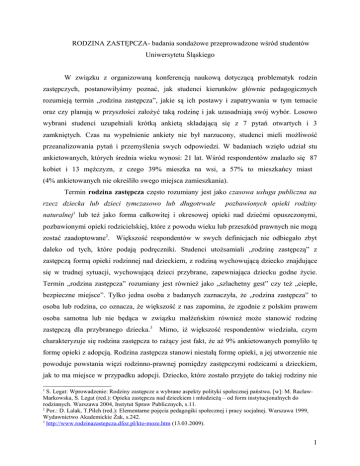 RODZINA ZASTĘPCZA- badania sondażowe przeprowadzone wśród studentów Uniwersytetu Śląskiego W związku z organizowaną konferencją naukową dotyczącą problematyk rodzin zastępczych, postanowiłyśmy poznać, jak studenci kierunków głównie pedagogicznych rozumieją termin „rodzina zastępcza”, jakie są ich postawy i zapatrywania w tym temacie oraz czy planują w przyszłości założyć taką rodzinę i jak uzasadniają swój wybór. Losowo wybrani studenci uzupełniali krótką ankietą składającą się z 7 pytań otwartych i 3 zamkniętych. Czas na wypełnienie ankiety nie był narzucony, studenci mieli możliwość przeanalizowania pytań i przemyślenia swych odpowiedzi. W badaniach wzięło udział stu ankietowanych, których średnia wieku wynosi: 21 lat. Wśród respondentów znalazło się 87 kobiet i 13 mężczyzn, z czego 39% mieszka na wsi, a 57% to mieszkańcy miast (4% ankietowanych nie określiło swego miejsca zamieszkania). Termin rodzina zastępcza często rozumiany jest jako czasowa usługa publiczna na rzecz dziecka lub dzieci tymczasowo lub długotrwale pozbawionych opieki rodziny naturalnej1 lub też jako forma całkowitej i okresowej opieki nad dziećmi opuszczonymi, pozbawionymi opieki rodzicielskiej, które z powodu wieku lub przeszkód prawnych nie mogą zostać zaadoptowane2. Większość respondentów w swych definicjach nie odbiegało zbyt daleko od tych, które podają podręczniki. Studenci utożsamiali „rodzinę zastępczą” z zastępczą formą opieki rodzinnej nad dzieckiem, z rodziną wychowującą dziecko znajdujące się w trudnej sytuacji, wychowującą dzieci przybrane, zapewniająca dziecku godne życie. Termin „rodzina zastępcza” rozumiany jest również jako „szlachetny gest” czy też „ciepłe, bezpieczne miejsce”. Tylko jedna osoba z badanych zaznaczyła, że „rodzina zastępcza” to osoba lub rodzina, co oznacza, że większość z nas zapomina, że zgodnie z polskim prawem osoba samotna lub nie będąca w związku małżeńskim również może stanowić rodzinę zastępczą dla przybranego dziecka.3 Mimo, iż większość respondentów wiedziała, czym charakteryzuje się rodzina zastępcza to rażący jest fakt, że aż 9% ankietowanych pomyliło tę formę opieki z adopcją. Rodzina zastępcza stanowi niestałą formę opieki, a jej utworzenie nie powoduje powstania więzi rodzinno-prawnej pomiędzy zastępczymi rodzicami a dzieckiem, jak to ma miejsce w przypadku adopcji. Dziecko, które zostało przyjęte do takiej rodziny nie 1 S. Legat: Wprowadzenie: Rodziny zastępcze a wybrane aspekty polityki społecznej państwa. [w]: M. RacławMarkowska, S. Legat (red.): Opieka zastępcza nad dzieckiem i młodzieżą – od form instytucjonalnych do rodzinnych. Warszawa 2004, Instytut Spraw Publicznych, s.11. 2 Por.: D. Lalak, T.Pilch (red.): Elementarne pojęcia pedagogiki społecznej i pracy socjalnej. Warszawa 1999, Wydawnictwo Akademickie Żak, s.242. 3 http://www.rodzinazastepcza.dfoz.pl/kto-moze.htm (13.03.2009). 1 zmienia swojego nazwiska ani też nie powstają pomiędzy nim a rodzicami zastępczymi obowiązki alimentacyjne. Rodzice zastępczy nie przejmują też pełnej władzy między przyjętymi do siebie dziećmi. Kiedy poprosiłyśmy ankietowanych o wypisanie pięciu skojarzeń z terminem „rodzina zastępcza” otrzymałyśmy tak wiele różnorodnych określeń, że wymienienie ich wszystkich zajęłoby sporo czasu. Były jednak terminy, które powtarzały się częściej niż inne m.in. opieka (aż 41 skojarzeń), serial i Piotr Fronczewski (19 skojarzeń), miłość oraz dom (po 16 skojarzeń), mama, tata, pomoc, bezpieczeństwo (po 14 skojarzeń). Inne skojarzenia wynikające być może z braku wiedzy to np. adopcja czy też skojarzenie z rodziną posiadającą dużo dzieci (w Polsce, poza niektórymi wyjątkami, w rodzinie zastępczej może być umieszczonych w tym samym czasie nie więcej niż troje dzieci.). Przekonałyśmy się, że ile ludzi tyle skojarzeń. Poza skojarzeniami o charakterze pozytywnym tj. szczęście, życzliwość, poczucie bliskości, akceptacja itp. pojawiły się również te o wydźwięku negatywnym m.in. patologia, pieniądze, alkoholizm, obcy, rodzina niepełna, mało miejsca i inne. Ciekawe jest to, że 6% ankietowanych kojarzy rodzinę zastępczą z „czymś nowym” np. nowy dom dla dzieci, nowa miłość, nowa sytuacja, nowe życie, nowy początek. Nowy zaś kojarzy nam się z czymś lepszym, sprawnym, dobrze działającym, taka właśnie powinna być ta „nowa rodzina”. Kiedy w ankiecie zapytałyśmy naszych respondentów czy chcieliby w przyszłości założyć rodzinę zastępcza większość z nich (73%) odpowiedziała, że tego na dzień dzisiejszy nie są w stanie jednoznacznie stwierdzić. Odpowiedź taka była z reguły uzasadniana brakiem znajomości swojego przyszłego życia. Respondenci napisali, że nie wiedzą czy chcieliby w przyszłości założyć rodzinę zastępczą, gdyż nie wiedzą co na to ich partner, nie wiedzą czy będą mieli odpowiednie do tego warunki, pracę, zdrowie, swoje własne dzieci. 12% badanych stwierdziło, że zdecydowanie nie chce założyć rodziny zastępczej, 15% ankietowanych ma takie plany w przyszłości z czego (co wynikło z dalszych pytań) tylko 1/3 z nich wie, gdzie należy się zgłosić, aby móc się ubiegać o takie prawa. Tylko 31% respondentów napisało, że należy skierować się do Powiatowego Centrum Pomocy Rodzinie, ośrodka adopcyjno-opiekuńczego lub ośrodka pomocy społecznej. Wiele osób odpowiada, że po prostu nie wie, bądź wypisuje inne instytucje lub placówki. Studenci podeszli bardzo rygorystycznie, co do ustalania warunków i zasad, na jakich wybrane osoby mogłyby się starać o miano rodziny zastępczej. Łączna liczba kryteriów, jaką uzyskaliśmy, a jaką powinna spełniać rodzina zastępcza, aby opiekować się dzieckiem wyniosła 77. To bardzo dużo i o wiele więcej niż 