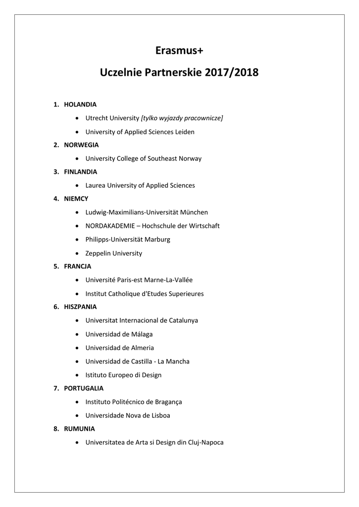 Erasmus+ Uczelnie Partnerskie 2017/2018 1. HOLANDIA Utrecht University [tylko wyjazdy pracownicze] University of Applied Sciences Leiden 2. NORWEGIA University College of Southeast Norway 3. FINLANDIA Laurea University of Applied Sciences 4. NIEMCY Ludwig-Maximilians-Universität München NORDAKADEMIE – Hochschule der Wirtschaft Philipps-Universität Marburg Zeppelin University 5. FRANCJA Université Paris-est Marne-La-Vallée Institut Catholique d'Etudes Superieures 6. HISZPANIA Universitat Internacional de Catalunya Universidad de Málaga Universidad de Almeria Universidad de Castilla - La Mancha Istituto Europeo di Design 7. PORTUGALIA Instituto Politécnico de Bragança Universidade Nova de Lisboa 8. RUMUNIA Universitatea de Arta si Design din Cluj-Napoca 9. WŁOCHY Università degli Studi di Modena e Reggio Emilia Università degli Studi Roma Tre Scuola Superiore per Mediatori Linguistici Verbum Accademia di Belle Arti di Bari 10. WĘGRY Kodolányi János Főiskola 11. SŁOWACJA Univerzita Mateja Bela v Banskej Bystrici 12. LITWA Vilnius Business College 13. TURCJA Marmara Üniversitesi Kastamonu Universitesi Istanbul Gelişim Űniversitesi Mehmet Akif Ersoy University POZA ERASMUSEM+ 14. SZWAJCARIA University of Fribourg 15. USA Benedictine College University of Texas Rio Grande Valley 16. CHINY Dalian Nationalities University Guangxi University Hebei University North University of China Shijiazhuang University Suzhou University Yuncheng University