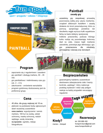 Paintball zasady gry sport • przygoda • zabawa • integracja » » PAINTBALL » uczestnicy gry zespołowej prowadzą pozorowaną walkę przy użyciu markerów, urządzeń zbliżonych kształtem i zasadą działania do broni pneumatycznej, która za pomocą sprężonego powietrza lub dwutlenku węgla wyrzuca kulki wypełnione farbą na bazie żelatyny spożywczej trafienie przeciwnika, podczas którego kulka rozbija się pozostawiając kolorowy ślad na ciele, masce bądź markerze zawodnika, powoduje jego eliminację z gry gra przeznaczona dla młodzieży gimnazjalnej i starszej oraz dorosłych Program » » » » zapoznanie się z regulaminem i zasadami gry paintball i obsługą markera, 30 – 45 min. gra paintballowa / nielimitowany czas gry (ok. 2 – 4 h) zakończenie - omówienie warsztatów program godzinowy dostosowany jest do preferencji grupy Bezpieczeństwo » » » gwarantujemy każdemu uczestnikowi atestowane zabezpieczenia ciała i twarzy kontrola „sędziego”, który nadzoruje przebieg wydarzeń i widzi cały poligon reakcja na każdy przypadek naruszający regulamin Cena » » » » » 45 zł/os. dla grupy większej niż 10 os. płatność na podstawie liczby zgłoszonych dzień wcześniej uczestników cena zawiera: wypożyczenie i serwis markera, 100 kul na osobę, odzież ochronną, maskę ochronną, nadzór sędziego, wodę mineralną na życzenie: ognisko, relacja fotograficzna dodatkowe 100 kul – 15 zł myślenie strategiczne sprawność fizyczna zdrowa rywalizacja współpraca uważność Kiedy? marzec – listopad Rezerwacja tel. 530 888 430 [email protected] www.funsportlublin.pl