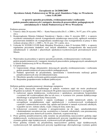 Zarządzenie nr 26/2008/2009 Dyrektora Szkoły Podstawowej nr 90 im. prof. Stanisława Tołpy we Wrocławiu z dnia 31.08.2009 w sprawie sposobu przydziału, ewidencjonowania i rozliczania godzin ponadwymiarowych i zastępstw doraźnych pracowników pedagogicznych zatrudnionych w Szkole Podstawowej nr 90 we Wrocławiu Podstawa prawna: 1. Ustawa z dnia 26 stycznia 1982 r. – Karta Nauczyciela (Dz.U. z 2006 r., Nr 97, poz. 674 z późn. zm.), 2. Rozporządzenie Ministra Edukacji Narodowej i Sportu z dnia 31 stycznia 2005 r. w sprawie wysokości minimalnych stawek wynagrodzenia zasadniczego nauczycieli, ogólnych warunków przyznawania dodatków do wynagrodzenia zasadniczego oraz wynagrodzenia za pracę w dniu wolnym od pracy (Dz.U. z 2005 r., Nr 22, poz. 181 z późn. zm.), 3. Uchwała Nr XXXIII/1125/09 Rady Miejskiej Wrocławia z dnia 23 kwietnia 2009 r. w sprawie regulaminu przyznania dodatków oraz innych składników wynagrodzenia dla nauczycieli zatrudnionych w szkołach i placówkach opiekuńczo-wychowawczych prowadzonych przez Miasto. §1 1. Wprowadza się procedurę w sprawie sposobu przydziału, ewidencjonowania i rozliczania godzin ponadwymiarowych i zastępstw doraźnych pracowników pedagogicznych zatrudnionych w Szkole Podstawowej nr 90 we Wrocławiu. 2. Cel procedury 1) Usprawnienie obiegu dokumentów dotyczących sposobu ewidencjonowania i rozliczania godzin ponadwymiarowych pracowników pedagogicznych. 2) Nadanie uprawnień do przydzielania, sprawdzania i kontrolowania realizacji godzin ponadwymiarowych oraz ich dokumentowania. 3) Określenie sposobu rozliczania godzin ponadwymiarowych. 4) Racjonalne gospodarowanie środkami publicznymi. §2 Definicja godziny ponadwymiarowej i doraźnego zastępstwa 1. Czas pracy nauczyciela zatrudnionego w pełnym wymiarze zajęć nie może przekraczać 40 godzin na tydzień. W ramach wskazanych 40 godzin nauczyciel powinien w szczególności: 1) realizować zajęcia dydaktyczne, wychowawcze i opiekuńcze, prowadzone bezpośrednio z uczniami lub wychowankami albo na ich rzecz, w wymiarze tzw. pensum dydaktycznego określonego w przepisach Karty Nauczyciela, 2) wykonywać inne czynności i zajęcia wynikające z zadań statutowych szkoły, ze szczególnym uwzględnieniem zajęć opiekuńczych i wychowawczych wynikających z potrzeb i zainteresowań uczniów (np. opieka nad dziećmi w ramach wycieczek szkolnych, wyjazdów na tzw. zielone szkoły, wyjść z klasą do kina, teatru itp.), 3) wykonywać czynności związane z przygotowaniem się do zajęć, samokształceniem i doskonaleniem zawodowym (np. uczestnictwo w kursach, szkoleniach, czas przeznaczony na sprawdzanie prac domowych uczniów, klasówek, wypracowań itp.). 2. Przez godzinę ponadwymiarową stałą rozumie się przydzieloną nauczycielowi godzinę zajęć dydaktycznych, wychowawczych lub opiekuńczych powyżej tygodniowego obowiązkowego wymiaru godzin zajęć dydaktycznych, wychowawczych lub opiekuńczych. 3. Przez godzinę rozumie się przydzieloną nauczycielowi godzinę zajęć dydaktycznych, wychowawczych lub opiekuńczych powyżej tygodniowego obowiązkowego wymiaru godzin 1 zajęć dydaktycznych, wychowawczych lub opiekuńczych, której realizacja następuje w zastępstwie nieobecnego nauczyciela. §3 Wynagrodzenie za godzinę ponadwymiarową i godzinę zastępstwa doraźnego 1. Wynagrodzenie za godziny ponadwymiarowe i za godziny doraźnych zastępstw wypłaca się według stawki osobistego zaszeregowania nauczyciela, z uwzględnieniem dodatku za warunki pracy. 2. Wysokość stawki wynagrodzenia zasadniczego za jedną godzinę przeliczeniową dla nauczycieli realizujących tygodniowy obowiązkowy wymiar godzin, o którym mowa w art. 42 ust. 4a Karty Nauczyciela, oblicza się dzieląc przyznaną nauczycielowi stawkę wynagrodzenia zasadniczego wynikającą z tabeli zaszeregowania, przez miesięczną liczbę godzin będącą wynikiem pomnożenia tygodniowego obowiązkowego wymiaru godzin (pensum) przez 4,16 – z zaokrągleniem do pełnych godzin, w ten sposób, że czas zajęć do 0,5 godziny pomija się, a co najmniej 0,5 godziny liczy się za pełną godzinę. 3. Jeżeli praca nauczyciela następuje w warunkach trudnych, wówczas do stawki wynagrodzenia zasadniczego dolicza się dodatek za warunki pracy. 4. Wynagrodzenie za godziny ponadwymiarowe przydzielone w planie organizacyjnym nie przysługuje za dni, w których nauczyciel nie realizuje zajęć z powodu przerw przewidzianych przepisami o organizacji roku szkolnego, rozpoczynania lub kończenia zajęć w środku tygodnia oraz za dni nieobecności w pracy. 5. W tygodniach, w których przypadają dni usprawiedliwionej nieobecności w pracy nauczyciela lub dni ustawowo wolne od pracy, oraz w tygodniach, w których zajęcia rozpoczynają się lub kończą w środku tygodnia – dla ustalenia wynagrodzenia za godziny ponadwymiarowe za podstawę obliczenia liczby godzin ponadwymiarowych przyjmuje się wówczas tygodniowy obowiązkowy wymiar zajęć określony w przepisach Karty Nauczyciela pomniejszony o 1/5 tego wymiaru (lub 1/4, gdy dla nauczyciela ustalono czterodniowy tydzień pracy) za każdy dzień usprawiedliwionej nieobecności w pracy lub dzień ustawowo wolny od pracy. 6. Liczba godzin ponadwymiarowych, o których mowa w § 3, ust. 5, nie może być większa niż liczba godzin przydzielonych w planie organizacyjnym. 7. Wynagrodzenie za godziny ponadwymiarowe i godziny doraźnych zastępstw przysługuje za faktycznie zrealizowane. 8. Wynagrodzenie za godziny ponadwymiarowe, dotyczące obowiązkowych zajęć dydaktycznych, przysługują nauczycielowi, który nie mógł ich zrealizować z przyczyn leżących po stronie pracodawcy, w szczególności w związku z: 1) zawieszeniem zajęć z powodu epidemii, mrozów lub klęski żywiołowej, 2) uczestnictwem w szkoleniach i doskonaleniu zawodowym – na podstawie skierowania dyrektora szkoły, 3) sprawowaniem, za zgodą pracodawcy, opieki nad dziećmi w czasie wyci