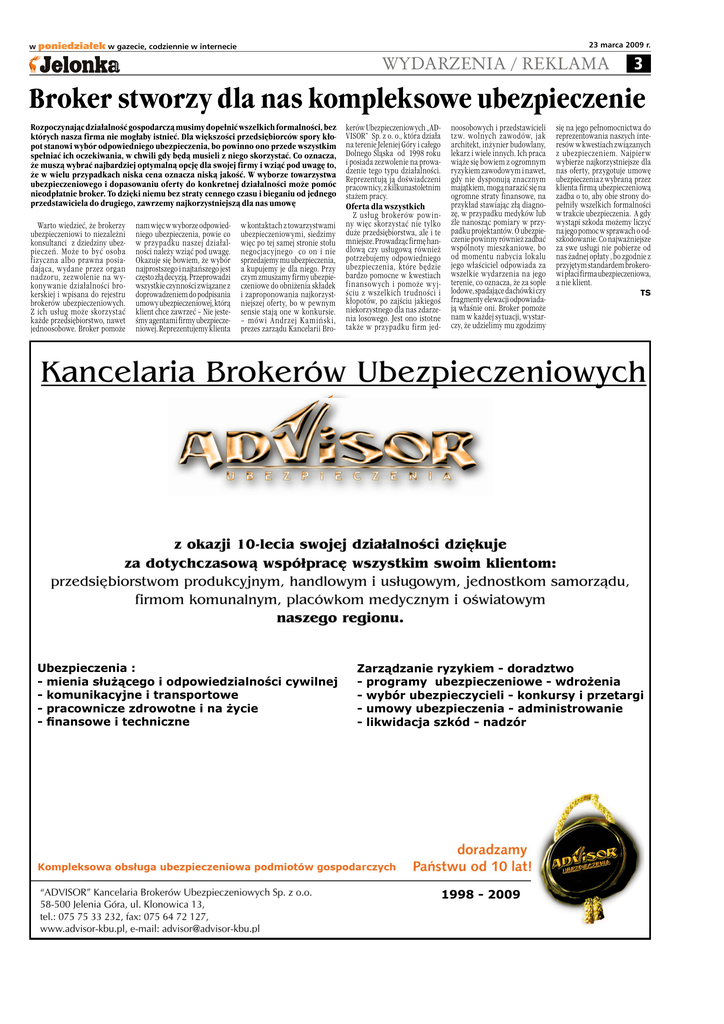 w poniedzia³ek w gazecie, codziennie w internecie 23 marca 2009 r. WYDARZENIA / REKLAMA Broker stworzy dla nas kompleksowe ubezpieczenie Rozpoczynając działalność gospodarczą musimy dopełnić wszelkich formalności, bez których nasza firma nie mogłaby istnieć. Dla większości przedsiębiorców spory kłopot stanowi wybór odpowiedniego ubezpieczenia, bo powinno ono przede wszystkim spełniać ich oczekiwania, w chwili gdy będą musieli z niego skorzystać. Co oznacza, że muszą wybrać najbardziej optymalną opcję dla swojej firmy i wziąć pod uwagę to, że w wielu przypadkach niska cena oznacza niską jakość. W wyborze towarzystwa ubezpieczeniowego i dopasowaniu oferty do konkretnej działalności może pomóc nieodpłatnie broker. To dzięki niemu bez straty cennego czasu i bieganiu od jednego przedstawiciela do drugiego, zawrzemy najkorzystniejszą dla nas umowę Warto wiedzieć, że brokerzy ubezpieczeniowi to niezależni konsultanci z dziedziny ubezpieczeń. Może to być osoba fizyczna albo prawna posiadająca, wydane przez organ nadzoru, zezwolenie na wykonywanie działalności brokerskiej i wpisana do rejestru brokerów ubezpieczeniowych. Z ich usług może skorzystać każde przedsiębiorstwo, nawet jednoosobowe. Broker pomoże nam więc w wyborze odpowiedniego ubezpieczenia, powie co w przypadku naszej działalności należy wziąć pod uwagę. Okazuje się bowiem, że wybór najprostszego i najtańszego jest często złą decyzją. Przeprowadzi wszystkie czynności związane z doprowadzeniem do podpisania umowy ubezpieczeniowej, którą klient chce zawrzeć – Nie jesteśmy agentami firmy ubezpieczeniowej. Reprezentujemy klienta w kontaktach z towarzystwami ubezpieczeniowymi, siedzimy więc po tej samej stronie stołu negocjacyjnego co on i nie sprzedajemy mu ubezpieczenia, a kupujemy je dla niego. Przy czym zmuszamy firmy ubezpieczeniowe do obniżenia składek i zaproponowania najkorzystniejszej oferty, bo w pewnym sensie stają one w konkursie. – mówi Andrzej Kamiński, prezes zarządu Kancelarii Bro- Ubezpieczenia : - mienia służącego i odpowiedzialności cywilnej - komunikacyjne i transportowe - pracownicze zdrowotne i na życie - finansowe i techniczne kerów Ubezpieczeniowych „ADVISOR” Sp. z o. o., która działa na terenie Jeleniej Góry i całego Dolnego Śląska od 1998 roku i posiada zezwolenie na prowadzenie tego typu działalności. Reprezentują ją doświadczeni pracownicy, z kilkunastoletnim stażem pracy. Oferta dla wszystkich Z usług brokerów powinny więc skorzystać nie tylko duże przedsiębiorstwa, ale i te mniejsze. Prowadząc firmę handlową czy usługową również potrzebujemy odpowiedniego ubezpieczenia, które będzie bardzo pomocne w kwestiach finansowych i pomoże wyjściu z wszelkich trudności i kłopotów, po zajściu jakiegoś niekorzystnego dla nas zdarzenia losowego. Jest ono istotne także w przypadku firm jed- noosobowych i przedstawicieli tzw. wolnych zawodów, jak architekt, inżynier budowlany, lekarz i wiele innych. Ich praca wiąże się bowiem z ogromnym ryzykiem zawodowym i nawet, gdy nie dysponują znacznym majątkiem, mogą narazić się na ogromne straty finansowe, na przykład stawiając złą diagnozę, w przypadku medyków lub źle nanosząc pomiary w przypadku projektantów. O ubezpieczenie powinny również zadbać wspólnoty mieszkaniowe, bo od momentu nabycia lokalu jego właściciel odpowiada za wszelkie wydarzenia na jego terenie, co oznacza, że za sople lodowe, spadające dachówki czy fragmenty elewacji odpowiadają właśnie oni. Broker pomoże nam w każdej sytuacji, wystarczy, że udzielimy mu zgodzimy się na jego pełnomocnictwa do reprezentowania naszych interesów w kwestiach związanych z ubezpieczeniem. Najpierw wybierze najkorzystniejsze dla nas oferty, przygotuje umowę ubezpieczenia z wybraną przez klienta firmą ubezpieczeniową zadba o to, aby obie strony dopełniły wszelkich formalności w trakcie ubezpieczenia. A gdy wystąpi szkoda możemy liczyć na jego pomoc w sprawach o odszkodowanie. Co najważniejsze za swe usługi nie pobierze od nas żadnej opłaty , bo zgodnie z przyjętym standardem brokerowi płaci firma ubezpieczeniowa, a nie klient. TS Zarządzanie ryzykiem - doradztwo - programy ubezpieczeniowe - wdrożenia - wybór ubezpieczycieli - konkursy i przetargi - umowy ubezpieczenia - administrowanie - likwidacja szkód - nadzór 1998 - 2009