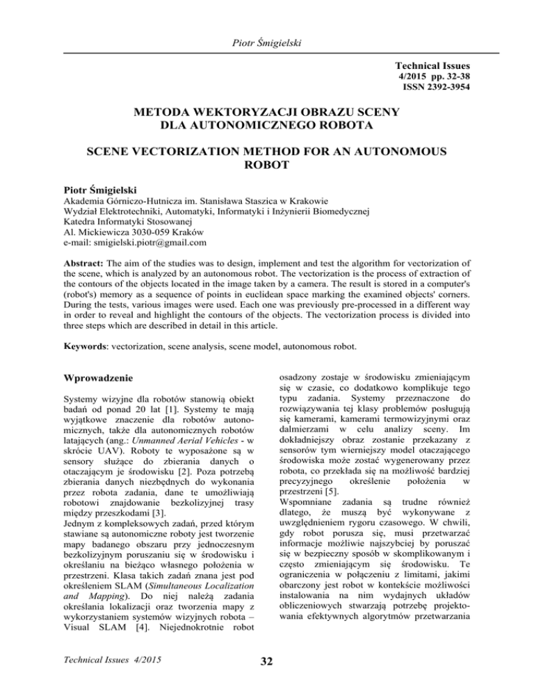 Piotr Śmigielski Technical Issues 4/2015 pp. 32-38 ISSN 2392-3954 METODA WEKTORYZACJI OBRAZU SCENY DLA AUTONOMICZNEGO ROBOTA SCENE VECTORIZATION METHOD FOR AN AUTONOMOUS ROBOT Piotr Śmigielski Akademia Górniczo-Hutnicza im. Stanisława Staszica w Krakowie Wydział Elektrotechniki, Automatyki, Informatyki i Inżynierii Biomedycznej Katedra Informatyki Stosowanej Al. Mickiewicza 3030-059 Kraków e-mail: [email protected] Abstract: The aim of the studies was to design, implement and test the algorithm for vectorization of the scene, which is analyzed by an autonomous robot. The vectorization is the process of extraction of the contours of the objects located in the image taken by a camera. The result is stored in a computer's (robot's) memory as a sequence of points in euclidean space marking the examined objects' corners. During the tests, various images were used. Each one was previously pre-processed in a different way in order to reveal and highlight the contours of the objects. The vectorization process is divided into three steps which are described in detail in this article. Keywords: vectorization, scene analysis, scene model, autonomous robot. osadzony zostaje w środowisku zmieniającym się w czasie, co dodatkowo komplikuje tego typu zadania. Systemy przeznaczone do rozwiązywania tej klasy problemów posługują się kamerami, kamerami termowizyjnymi oraz dalmierzami w celu analizy sceny. Im dokładniejszy obraz zostanie przekazany z sensorów tym wierniejszy model otaczającego środowiska może zostać wygenerowany przez robota, co przekłada się na możliwość bardziej precyzyjnego określenie położenia w przestrzeni [5]. Wspomniane zadania są trudne również dlatego, że muszą być wykonywane z uwzględnieniem rygoru czasowego. W chwili, gdy robot porusza się, musi przetwarzać informacje możliwie najszybciej by poruszać się w bezpieczny sposób w skomplikowanym i często zmieniającym się środowisku. Te ograniczenia w połączeniu z limitami, jakimi obarczony jest robot w kontekście możliwości instalowania na nim wydajnych układów obliczeniowych stwarzają potrzebę projektowania efektywnych algorytmów przetwarzania Wprowadzenie Systemy wizyjne dla robotów stanowią obiekt badań od ponad 20 lat [1]. Systemy te mają wyjątkowe znaczenie dla robotów autonomicznych, także dla autonomicznych robotów latających (ang.: Unmanned Aerial Vehicles - w skrócie UAV). Roboty te wyposażone są w sensory służące do zbierania danych o otaczającym je środowisku [2]. Poza potrzebą zbierania danych niezbędnych do wykonania przez robota zadania, dane te umożliwiają robotowi znajdowanie bezkolizyjnej trasy między przeszkodami [3]. Jednym z kompleksowych zadań, przed którym stawiane są autonomiczne roboty jest tworzenie mapy badanego obszaru przy jednoczesnym bezkolizyjnym poruszaniu się w środowisku i określaniu na bieżąco własnego położenia w przestrzeni. Klasa takich zadań znana jest pod określeniem SLAM (Simultaneous Localization and Mapping). Do niej należą zadania określania lokalizacji oraz tworzenia mapy z wykorzystaniem systemów wizyjnych robota – Visual SLAM [4]. Niejednokrotnie robot Technical Issues 4/2015 32 METODA WEKTORYZACJI OBRAZU SCENY DLA AUTONOMICZNEGO ROBOTA euklidesowej. Ostateczny wynik wektoryzacji danego zdjęcia niesie ze sobą informacje o kształcie, wielkości, skomplikowaniu poszczególnych brył oraz o relacjach przestrzennych między nimi. danych, oraz oszczędnych pamięciowo reprezentacji danych przestrzennych. Proces wektoryzacji jest jednym z pierwszych etapów analizy sceny [6]. Prowadzi on do wyodrębnienia kształtów i cech obiektów znajdujących się w otoczeniu robota. Im dokładniejszy model wektorowy obiektów zostanie wygenerowany tym lepsze Oszajcowanie pozycji w przestrzeni jest możliwe. Jednocześnie dokładniejszy modelu (mapa) sceny może zostać stworzona przez robota. Przedmiotem badań opisanych w niniejszej publikacji było stworzenie algorytmu wektoryzacji obrazu, dedykowanego dla autonomicznego robota poruszającego się w trzech wymiarach – latającego lub nurkującego. Celem było stworzenie wydajnej obliczeniowo metody dającej oszczędną pamięciowo reprezentację, która może stanowić bezpośrednie wejście do dalszych etapów przetwarzania obrazu przez robota. Model wektorowy w ujęciu prezentowanym w poniższych rozdziałach składa się z reprezentacji poszczególnych obiektów obserwowanych przez kamerę robota. Każdy z obiektów reprezentowany jest przez ciąg punktów wyznaczających położenie kolejnych narożników bryły. Każdy taki ciąg definiuje łamaną zamkniętą na płaszczyźnie Opis zagadnienia - opis algorytmu Zaproponowana metoda przetwarza obraz w kilku etapach: 1 - wyodrębnienie krawędzi bryły na zdjęciu; 2 - iteracyjne wyznaczenie kolejnych, gęsto rozmieszczonych punktów na obrysie bryły; 3 - usunięcie zbędnych punktów, które leżą na wspólnej prostej i przybliżenie punktami miejsc, gdzie znajdują się narożniki bryły; 4 - przybliżenie lokalizacji narożników bryły poprzez post-processing otrzymanej w poprzednich etapach wektorowej reprezentacji. Na dane wejściowe dla zaproponowanej metody nie są nałożone szczególne warunki. Niemniej jednak dla najbardziej zadowalających wyników zalecane jest wykorzystanie zdjęć poddanych pre-processingowi poprawiającego widoczność i kontrastowość brył, których kształt chcemy poddać wektoryzacji. Przykłady wyniku pre-processingu zaprezentowane zostały na rys. 1. Rys. 1. Przykładowe zdjęcia po pre-processingu uwydatniającym kontury obiektów. koloru określa tło sceny a piksel innego koloru miejsce krawędzi bryły. Bazuje ona na wyszukiwaniu najbardziej kontrastowych przejść barw na zdjęciu. W dalszym etapie działania algorytmu wykorzystana zostaje bitmapa uzyskana w wyniku krawędziowania bądź silnego preprocessingu dającego w efekcie dwukolorową bitmapę. W 