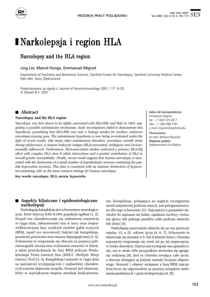 PRZEDRUK PRACY POGLĄDOWEJ ISSN 1641–6007 Sen 2003, Tom 3, Nr 3, 103–115 SEN Narkolepsja i region HLA Narcolepsy and the HLA region Ling Lin, Marcel Hungs, Emmanuel Mignot Department of Psychiatry and Behavioral Sciences, Stanford Center for Narcolepsy, Stanford University Medical Center, Palo Alto, Stany Zjednoczone Przedrukowano za zgodą z: Journal of Neuroimmunology 2001; 117: 9–20 © Elsevier B.V. 2001 t Abstract Narcolepsy and the HLA region Narcolepsy was first shown to be tightly associated with HLA-DR2 and DQ1 in 1983, suggesting a possible autoimmune mechanism. Early investigations failed to demonstrate this hypothesis, postulating that HLA-DR2 was only a linkage marker for another, unknown narcolepsy-causing gene. The autoimmune hypothesis is now being re-evaluated under the light of recent results. Like many other autoimmune disorders, narcolepsy usually starts during adolescence, is human leukocyte antigen (HLA)-associated, multigenic and environmentally influenced. Furthermore, HLA-association studies indicated a primary HLA-DQ effect with complex HLA class II allele interactions and a partial contribution of HLA to overall genetic susceptibility. Finally, recent result suggests that human narcolepsy is associated with the destruction of a small number of hypothalamic neurons containing the peptide hypocretins (orexins). This data is consistent with an immune destruction of hypocretin-containing cells as the most common etiology for human narcolepsy. Adres do korespondencji: Emmanuel Mignot tel.: +1 650 725 6517 faks: +1 650 498 7761 e-mail: [email protected] Tłumaczenie: dr med. Barbara Wysocka Wydanie polskie: Wydawnictwo Via Medica Key words: narcolepsy, HLA, orexin, hypocretin t Aspekty kliniczne i epidemiologiczne narkolepsji Narkolepsja-katapleksja jest schorzeniem neurologicznym, które dotyczy 0,02–0,18% populacji ogólnej [1, 2]. Zespół ten charakteryzuje się nadmierną sennością w ciągu dnia, zaburzeniami snu w nocy oraz nieprawidłowościami fazy szybkich ruchów gałek ocznych (REM, rapid eye movement) (takimi jak katapleksja, porażenie przysenne oraz omamy hipnagogiczne) [3, 4]. Schorzenie to rozpoznaje się obecnie za pomocą polisomnografii nocnej oraz wykazania senności w dzień, a także przechodzenia do fazy REM podczas Wielokrotnego Testu Latencji Snu (MSLT, Multiple Sleep Latency Test) [3, 4]. Katapleksja i senność w ciągu dnia są najczęściej występującymi i najbardziej charakterystycznymi objawami zespołu. Senność jest objawem, który w największym stopniu utrudnia funkcjonowa- nie. Katapleksja, polegająca na nagłym wystąpieniu atonii mięśniowej podczas emocji, jest patognomoniczna dla tego schorzenia [5]. Najczęściej u pacjentów dochodzi do uginania się kolan, opadania żuchwy, zwisania głowy lub pełnego paraliżu ciała podczas śmiechu lub złości [5]. Narkolepsja przeważnie objawia się po raz pierwszy między 15. a 25. rokiem życia [4, 6, 7]. Schorzenie to obserwuje się również u 5- lub 6-letnich dzieci. Chorobę najczęściej rozpoznaje się wiele lat po jej rozpoczęciu, w wieku dorosłym. Zazwyczaj występuje ona sporadycznie, zaś w około 10% przypadków stwierdza się agregację rodzinną [8]. Jest to choroba trwająca całe życie, a obecnie dostępne są jedynie metody leczenia objawowego. Senność i objawy związane z fazą REM najczęściej leczy się odpowiednio za pomocą związków amfetaminopodobnych i przeciwdepresyjnych [9]. www.sen.viamedica.pl 103 2003, Tom 3, Nr 3 Struktura i funkcja kompleksu HLA Geny głównego kompleksu zgodności tkankowej (MHC, Major Histocompatibility Complex) odgrywają kluczową rolę w rozpoznawaniu i przetwarzaniu obcych antygenów przez układ immunologiczny. Ludzki układ MHC nazywano również antygenem ludzkich leukocytów (HLA, human leukocyte antigen) na podstawie ich początkowego opisu w odniesieniu do przeszczepiania tkanek. Kompleks genów HLA jest zlokalizowany w chromosomie 6 (6p21.31); dzieli się na 3 podregiony: MHC klasy I, II i III (ryc. 1). Wiele genów w regionach klasy I i II jest zaangażowanych w przetwarzanie antygenów i ich prezentację limfocytom T [10–12]. W pobliżu centromeru klasa II zawiera geny kodujące łańcuchy a i b HLA-DR, DQ i DP. Geny przetwarzające antygeny, takie jak: TAP1, TAP2, LMP2, LMP7, DMA i DMB, również występują w tym regionie. Blisko końca kompleksu znajdującego się od strony telomeru region klasy I zawiera HLA-A, B i C. W regionie tym występuje również kilka innych genów, takich jak: HLA-G, E i F. Klasa III HLA jest położona między klasą I a klasą II (ryc. 1). Region klasy III zawiera funkcjonalnie różnorodne geny kodujące składowe dopełniacza, 21-hydroksylazę, czynnik B oraz czynnik martwicy nowotworu (TNF, tumor necrosis factor) [11, 12] (ryc. 1). W analizie sekwencji wykazano, że 4 miliony par zasad zawartych w kompleksie HLA tworzy ponad 200 genów [13, 14]. Cząsteczki HLA są wysoce polimorficznymi glikoproteinami, które ulegają ekspresji przede wszystkim na powierzchni komórek układu immunologicznego [12]. Peptydy związane z cząsteczkami MHC aktywują populacje komórek T posiadających odpowiedni receptor komórek T t HLA-DR2 i narkolepsja-katapleksja We wczesnych badaniach nad polimorfizmem HLA wykorzystywano techniki serologiczne typowania HLA DP TAP1 DMB DMA TAP2 DQB3 DQB2 DQB1 DRB1 DQA1 CYP21 TNFA C B Hcrtr2 X E J H A F G HLA i w ten sposób są mediatorami swoistej dla antygenu odpowiedzi immunologicznej. Allele i haplotypy HLA różnią się znacząco na poziomie molekularnym. Polimorfizmy te są pierwotnymi czynnikami odpowiedzi alloreaktywnej. Przeszczep tkankowy między jednostkami niezgodnymi pod względem HLA powoduje silną odpowiedź limfocytarną [12, 15]. Związek różnych chorób z MHC opisywano od lat 60. XX wieku [15]. Najbardziej powtarzalne skojarzenie obserwowano w przypadku chorób autoimmunologicznych, takich jak: zesztywniające zapalenie sta