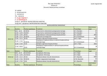 Plan zajęć 2016/2017 Semestr III Kierunek: Bezpieczeństwo narodowe studia magisterskie W- wykład K - konwersatorium S - seminarium Ćw. - ćwiczenia Z - ul. gen. Zajączka 7 F - ul. Felińskiego 15 Grupa A - specjalność: BEZPIECZEŃSTWO PAŃSTWA Grupy B+D - specjalność: BEZPIECZEŃSTWO PUBLICZNE BEZPIECZEŃSTWO NARODOWE Data 08.10.16 Godzina 8.00 - 10.15 10.30 - 12.45 10.30 - 12.45 13.00 - 15.15 13.00 - 15.15 Prowadzący dr K. Stanejko dr K. Stanejko dr C. Sochala dr R. Chmielewski prof. J. Pięta K (D) Przedmiot Prawo karne z elementami postępowania karnego Prawo karne z elementami postępowania karnego Regionalizacja i instytucjonalizacja bezpieczeństwa Zwalczanie przestępczości Globalne zagrożenia bezpieczeństwa Współpraca międzynarodowa w zakresie bezpieczeństwa wewnętrznego Globalne zagrożenia bezpieczeństwa Współpraca międznarodowa w zakresie bezpieczeństwa wewnętrznego Godzina 8.00 - 10.15 10.30 - 12.45 13.00 - 15.15 Rodzaj zajęć/grupa W (A+B+D) K (A+B+D) Przedmiot Zarządzanie informacją Zarządzanie informacją Prowadzący dr D. Mąka dr D. Mąka W (A) Międzynarodowe stosunki ekonomiczne dr K. Bojarska 15.30 - 17.45 W (B+D) System reagowania kryzysowego dr M. Wojciszko 15.30 - 17.45 S (A) Międzynarodowe stosunki ekonomiczne dr K. Bojarska Godzina Rodzaj zajęć/grupa Przedmiot Prowadzący 15.30 - 17.45 15.30 - 17.45 17.50 - 20.05 Data 09.10.16 Data Rodzaj zajęć/grupa W (B+D) K (B+D) W (A) W (B+D) W (A) W (B+D) K (A) dr R. Chmielewski prof. J. Pięta dr R. Chmielewski Sala/miejsce zajęć 9F 9F 308 Z 9F 308 Z 9F 308 Z 9F Sala/miejsce zajęć 9F 9F 308 Z 9F 308 Z sala/miejsce zajęć Plan zajęć 2016/2017 Semestr III Kierunek: Bezpieczeństwo narodowe 22.10.16 8.00 - 10.15 W (B+D) Współpraca międzynarodowa w zakresie bezpieczeństwa wewnętrznego dr R. Chmielewski 8.00 - 10.15 S (A) Regionalizacja i instytucjonalizacja bezpieczeństwa dr C. Sochala 10.30 - 12.45 W (B+D) dr R. Chmielewski 13.00 - 15.15 13.00 - 15.15 13.00 - 15.15 K (B) S (D) W (A) 15.30 - 17.45 15.30 - 17.45 K (D) S (B) S (A) Zwalczanie przestępczości Współpraca międzynarodowa w zakresie bezpieczeństwa wewnętrznego Zwalczanie przestępczości Międzynarodowe stosunki polityczno-wojskowe Współpraca międzynarodowa w zakresie bezpieczeństwa wewnętrznego Zwalczanie przestępczości Międzynarodowe stosunki polityczno-wojskowe Godzina 8.00 - 10.15 8.00 - 10.15 10.30 - 12.45 10.30 - 12.45 13.00 - 15.15 13.00 - 15.15 15.30 - 17.45 Rodzaj zajęć/grupa W (B+D) W (A) Ćw. (D) S (A) Ćw. (B) W (A) S (A) Przedmiot System reagowania kryzysowego Międzynarodowe stosunki polityczno-wojskowe System reagowania kryzysowego Międzynarodowe stosunki polityczno-wojskowe System reagowania kryzysowego Regionalizacja i instytucjonalizacja bezpieczeństwa Regionalizacja i instytucjonalizacja bezpieczeństwa Prowadzący dr M. Wojciszko dr W. Zieliński dr M. Wojciszko dr W. Zieliński dr M. Wojciszko dr C. Sochala dr C. Sochala Godzina 8.00 - 10.15 10.30 - 12.45 13.00 - 15.15 13.00 - 15.15 Rodzaj zajęć/grupa W (A+B+D) Ćw. (A+B+D) W (B+D) W (A) Przedmiot Techniki negocjacji i mediacji Techniki negocjacji i mediacji Zwalczanie przestępczości Globalne zagrożenia bezpieczeństwa Współpraca międzynarodowa w zakresie bezpieczeństwa wewnętrznego Globalne zagrożenia bezpieczeństwa Prowadzący mgr A. Kapkowski mgr A. Kapkowski dr R. Chmielewski prof. J. Pięta 15.30 - 17.45 Data 23.10.16 Data 12.11.16 studia magisterskie 15.30 - 17.45 15.30 - 17.45 W (B+D) K (A) dr R. Chmielewski mgr T. Watras dr W. Zieliński dr R. Chmielewski mgr T. Watras dr W. Zieliński dr R. Chmielewski prof. J. Pięta 9F 308 Z 9F 9F 320 Z 312 Z 9F 320 Z 312 Z sala/miejsce zajęć 9F 312 Z 9F 312 Z 9F 312 Z 312 Z sala/miejsce zajęć 9F 9F 9F 329 Z 9F 329 Z Plan zajęć 2016/2017 Semestr III Kierunek: Bezpieczeństwo narodowe 12.11.16 Data 13.11.16 Data 26.11.16 17.50 - 20.05 K (B) Współpraca międzynarodowa w zakresie bezpieczeństwa wewnętrznego Godzina 8.00 - 10.15 8.00 - 10.15 10.30 - 12.45 10.30 - 12.45 13.00 - 15.15 13.00 - 15.15 15.30 - 17.45 15.30 - 17.45 17.50 - 20.05 Rodzaj zajęć/grupa S (D) W (A) S (B) S (A) W (B+D) W (A) Ćw. (D)* S (A) Ćw. (B) Przedmiot Zwalczanie przestępczości Międzynarodowe stosunki ekonomiczne Zwalczanie przestępczości Międzynarodowe stosunki ekonomiczne System reagowania kryzysowego Regionalizacja i instytucjonalizacja bezpieczeństwa System reagowania kryzysowego Regionalizacja i instytucjonalizacja bezpieczeństwa System reagowania kryzysowego Prowadzący mgr T. Watras dr K. Bojarska mgr T. Watras dr K. Bojarska dr M. Wojciszko dr C. Sochala dr M. Wojciszko dr C. Sochala dr M. Wojciszko Godzina 8.00 - 10.15 8.00 - 10.15 10.30 - 12.45 10.30 - 12.45 Rodzaj zajęć/grupa W (B+D) W (A) K (B+D) S (A) Prowadzący dr K. Stanejko dr W. Zieliński dr K. Stanejko dr W. Zieliński 13.00 - 15.15 13.00 - 15.15 15.30 - 17.45 15.30 - 17.45 W (B+D) W (A) W (B+D) K (A) Przedmiot Prawo karne z elementami postępowania karnego Międzynarodowe stosunki polityczno-wojskowe Prawo karne z elementami postępowania karnego Międzynarodowe stosunki polityczno-wojskowe Współpraca międzynarodowa w zakresie bezpieczeństwa wewnętrznego Globalne zagrożenia bezpieczeństwa Zwalczanie przestępczości Globalne zagrożenia bezpieczeństwa Współpraca międzynarodowa w zakresie bezpieczeństwa wewnętrznego 17.50 - 20.05 Data 27.11.16 studia magisterskie Godzina 8.00 - 10.15 10.30 - 12.45 13.00 - 15.15 K (D) Rodzaj zajęć/grupa W (A+B+D) Ćw. (A+B+D) W (A+B+D) Przedmiot Techniki negocjacji i mediacji Techniki negocjacji i mediacji Zarządzanie informacją dr R. Chmielewski dr R. Chmielewski prof. J. Pięta dr R. Chmielewski prof. J. Pięta dr R. Chmielewski Prowadzący mgr A. Kapkowski mgr A. Kapkowski dr D. Mąka 9F sala/miejsce zajęć 320 Z 308 Z 320 Z 308 Z 9F 312 Z 9F 312 Z 9F sala/miejsce zajęć 9F 329 Z 9F 329 Z 9F 329 Z 9F 329 Z 9F sala/miejsce zajęć 9F 9F 9F Plan zajęć 2016/2017 
