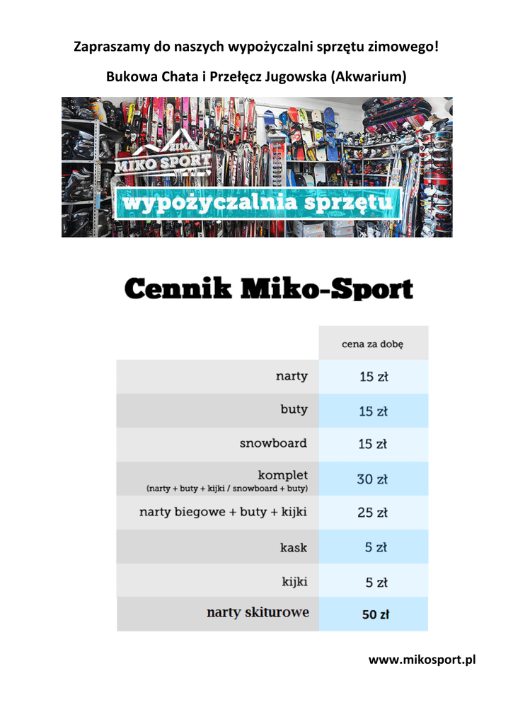 Zapraszamy do naszych wypożyczalni sprzętu zimowego! Bukowa Chata i Przełęcz Jugowska (Akwarium) www.mikosport.pl