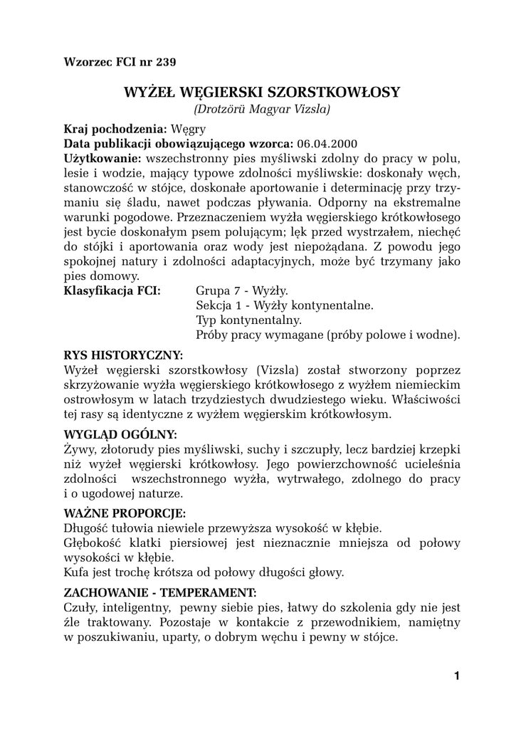 Wzorzec FCI nr 239 WYŻEŁ WĘGIERSKI SZORSTKOWŁOSY (Drotzörü Magyar Vizsla) Kraj pochodzenia: Węgry Data publikacji obowiązującego wzorca: 06.04.2000 Użytkowanie: wszechstronny pies myśliwski zdolny do pracy w polu, lesie i wodzie, mający typowe zdolności myśliwskie: doskonały węch, stanowczość w stójce, doskonałe aportowanie i determinację przy trzymaniu się śladu, nawet podczas pływania. Odporny na ekstremalne warunki pogodowe. Przeznaczeniem wyżła węgierskiego krótkowłosego jest bycie doskonałym psem polującym; lęk przed wystrzałem, niechęć do stójki i aportowania oraz wody jest niepożądana. Z powodu jego spokojnej natury i zdolności adaptacyjnych, może być trzymany jako pies domowy. Klasyfikacja FCI: Grupa 7 - Wyżły. Sekcja 1 - Wyżły kontynentalne. Typ kontynentalny. Próby pracy wymagane (próby polowe i wodne). RYS HISTORYCZNY: Wyżeł węgierski szorstkowłosy (Vizsla) został stworzony poprzez skrzyżowanie wyżła węgierskiego krótkowłosego z wyżłem niemieckim ostrowłosym w latach trzydziestych dwudziestego wieku. Właściwości tej rasy są identyczne z wyżłem węgierskim krótkowłosym. WYGLĄD OGÓLNY: Żywy, złotorudy pies myśliwski, suchy i szczupły, lecz bardziej krzepki niż wyżeł węgierski krótkowłosy. Jego powierzchowność ucieleśnia zdolności wszechstronnego wyżła, wytrwałego, zdolnego do pracy i o ugodowej naturze. WAŻNE PROPORCJE: Długość tułowia niewiele przewyższa wysokość w kłębie. Głębokość klatki piersiowej jest nieznacznie mniejsza od połowy wysokości w kłębie. Kufa jest trochę krótsza od połowy długości głowy. ZACHOWANIE - TEMPERAMENT: Czuły, inteligentny, pewny siebie pies, łatwy do szkolenia gdy nie jest źle traktowany. Pozostaje w kontakcie z przewodnikiem, namiętny w poszukiwaniu, uparty, o dobrym węchu i pewny w stójce. 1 GŁOWA: Mózgoczaszka: Lekko wysklepiona o średniej szerokości z niezbyt głęboką bruzdą sięgającą od umiarkowanie rozwiniętego guza potylicznego do czoła. Łuki brwiowe umiarkowanie rozwinięte. Przełom czołowo-nosowy (stop): umiarkowany. Trzewioczaszka: Nos: dobrze rozwinięty i szeroki, z nozdrzami tak rozwartymi jak to tylko możliwe. Kolor wierzchołka nosa harmonizuje w odcieniu z kolorem szaty. Kufa: stępiona, nie spiczasta, z silnymi szczękami, silnie umięśniona. Grzbiet nosa prosty. Fafle: ciasno przylegające, wargi nie zwisające. Uzębienie: potężne szczęki z doskonałym, regularnym i kompletnym zgryzem nożycowym, górna szczęka dokładnie pokrywa się z żuchwą tworząc kwadrat, 42 zęby Policzki: silne, dobrze umięśnione. Oczy: lekko owalnego kształtu, średniej wielkości, z dobrze przylegającymi powiekami. Brązowe oko harmonizuje z umaszczeniem szaty, preferowane tak ciemne jak to możliwe, o inteligentnym i żywym wyrazie. Uszy: osadzone niezbyt wysoko i nieco w tyle głowy. Cienkie płaty o kształcie zaokrąglonego V wiszą blisko policzków. Nieznacznie krótsze niż u wyżłów węgierskich krótkowłosych. Szyja: średniej długości, harmonizującej z wyglądem ogólnym. Kark bardzo umięśniony i lekko wygięty. Ciasno przylegająca skóra na podgardlu. TUŁÓW: Kłąb: wyraźny i umięśniony. Grzbiet: solidny, silny, dobrze umięśniony, napięty i prosty. Kręgi powinny być dobrze osłonięte mięśniem i niedostrzegalne. Lędźwie: krótkie i szerokie, proste lub lekko łukowate. Odcinek od grzbietu do lędźwi dobrze związany. Zad: szeroki, dobrze umięśniony i dostatecznie długi, lekko ścięty, nachylający się nieznacznie do ogona. Klatka piersiowa: głęboka i obszerna o dobrze rozwiniętej muskulaturze i umiarkowanie łukowatym przedpiersiem; mostek zachodzący do tyłu tak daleko, jak to możliwe. Mostek i łokieć powinien być na tej samej wysokości. Żebra umiarkowanie wysklepione, ostatnie wygięte do tyłu. 2 Linia podbrzusza: elegancka, napięta, wygięta w łuk ku tyłowi, brzuch nieznacznie podkasany. OGON: Osadzony nieco nisko, silny u nasady, zwężający się ku końcowi, dobrze pokryty gęstą szatą. W krajach, gdzie kopiowanie jest dozwolone, ogon może być skracany do 1/4 naturalnej długości, by uniknąć wypadków w czasie polowania. Jeśli kopiowanie nie jest dozwolone, ogon sięga aż do stawu skokowego i jest sierpowato wygięty w górę. W czasie ruchu noszony poziomo. KOŃCZYNY: Kończyny przednie: o mocnym kośćcu, silnie umięśnione. Widziane od przodu są proste i równoległe. Widziane z profilu są pionowe i dobrze ustawione pod tułowiem. Barki: długie, pochyłe i płaskie; elastyczne, o silnej i suchej muskulaturze. Dobre kątowanie pomiędzy łopatką a ramieniem; łopatka dobrze związana. Łokcie: przylegające do tułowia, jednakże nie wygięte ani do wewnątrz ani na zewnątrz. Dobre kątowanie pomiędzy ramieniem a przedramieniem. Przedramię: długie, proste, wystarczająco umięśnione, o silnym, lecz nie grubym kośćcu. Staw skokowy: suchy, muskularny. Nadgarstki: krótkie, nieznacznie pochyłe. Przednie łapy: koloru ciemnobrązowego, lekko owalne, wystarczająco wygięte, o silnych palcach i mocnych pazurach. Opuszki twarde, jędrne, ciemnoszare. Łapy paralelne w czasie ruchu i w pozycji statycznej. Kończyny tylne: dobrze ukątowane o silnym kośćcu; widziane od przodu są proste i równoległe. Udo: długie, dobrze umięśnione. Dobre kątowanie pomiędzy miednicą, a udem. Staw kolanowy: dobrze ukątowany. Podudzie: długie, suche, o silnie rozwiniętej muskulaturze, długości niemal równej długości ud. Dobre kątowanie pomiędzy podudziem a śródstopiem. Stawy skokowe: silne, suche i umięśnione, dobrze opuszczone. Śródstopia: pionowe, krótkie i suche. Tylne łapy: podobne do przednich. 3 CHODY: Typowy chód to ożywiony, energiczny i lekko kryjący ziemię kłus, elegancki i o dużym zasięgu. W czasie pracy w polu porusza się niewyczerpującym galopem. Grzbiet i linia podbrzusza są ustabilizowane i pozostają w p