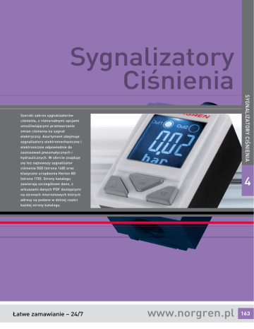 Sygnalizatory Ciśnienia SYGNALIZATORY CIśNIENIA Szeroki zakres sygnalizatorów ciśnienia, z różnorodnymi opcjami umożliwiającymi przetwarzanie zmian ciśnienia na sygnał elektryczny. Asortyment obejmuje sygnalizatory elektromechaniczne i elektroniczne odpowiednie do zastosowań pneumatycznych i hydraulicznych. W ofercie znajduje się też najnowszy sygnalizator ciśnienia 50D (strona 168) oraz klasyczne urządzenia Herion 8D (strona 170). Strony katalogu zawierają szczegółowe dane, z arkuszami danych PDF dostępnymi na stronach internetowych których adresy są podane w dolnej części każdej strony katalogu. Łatwe zamawianie – 24/7 4 www.norgren.pl 163 Szybkie wyszukiwanie ELEKTRO-MECHANICZNE SYGNALIZATORY CIŚNIENIA SYGNALIZATORY CIśNIENIA 4 18D Pneumatyczny 18D Hydraulika 20D –1 … 30 bar 5 … 420 bar Niskie ciśnienie/wszystkie media/ATEX -0,025 … 100 bar Strona 165 Strona 166 Strona 167 ELEKTRONICZNY SYGNALIZATOR CIśNIENIA 50D Pneumatyczny 0 … 10 bar, 0 … 6 bar, –1 … 0 bar, –1 … 1 bar 33D Pneumatyka/Wszystkie Media –1 … 400 bar Strona 168 Strona 169 Produkty klasyczne 8D Pneumatyka i Hydraulika Strona 170 164 www.norgren.pl/ webstore NORGREN EXPRESS – Dostawa www.norgren.pl/webstore Elektro-mechaniczny sygnalizator ciśnienia 18D Pneumatyka –1 … 30 bar Styki pokryte złotem Duża żywotność Odporny na wibracje do 15 g Mikrowyłącznik zgodny z UL i CSA Do zastosowań w obwodach iskrobezpiecznych Możliwość bezpośredniego montażu na zespołach przygotowania powietrza Excelon Medium: Neutralne gazy i ciecze 30 30 Działanie: Membrana 5,3 72 Temperatura otoczenia: –10°C … +80°C 15,5 15 Przy temperaturach poniżej +2°C zwróć uwagę na wilgotność powietrza Powtarzalność: 20 ± 3%, w pełnym zakresie Modele Standardowy Model Akcesoria Zakres Przyłącze Przyłącze Histereza nastaw medium elektryczne (bar) 0880100000000000 0880110000000000 0880200000000000 0880300000000000 0880400000000000 0880600000000000 0880620000000000 -1 … 0 -1 … 1 0,2 … 2 0,5 … 8 1 … 16 1 … 30 1 … 30 Maks. Wtyczka nadciśnienie (bar) SYGNALIZATORY CIśNIENIA DANE TECHNICZNE Złącze elektryczne M12 x 1 Proste 90° x 2 m dług x 2 m dług 4 G1/4 G1/4 G1/4 G1/4 G1/4 G1/4 1/4 NPT DIN EN 175301-803 Form A DIN EN 175301-803 Form A DIN EN 175301-803 Form A DIN EN 175301-803 Form A DIN EN 175301-803 Form A DIN EN 175301-803 Form A DIN EN 175301-803 Form A 0,15 … 0,18 0,25 … 0,35 0,20 … 0,35 0,35 … 0,85 0,40 … 1,20 1,00 … 5,00 1,00 … 5,00 80 80 80 80 80 80 80 – – – – – – – – – – – – – – – – – – – – – 0880226000000000* 0,2 … 4 0880326000000000* 0,5 … 8 0880426000000000* 1 … 16 G1/4 G1/4 G1/4 DIN EN 175301-803 Form A DIN EN 175301-803 Form A DIN EN 175301-803 Form A 0,20 … 0,35 0,35 … 0,85 0,40 … 1,20 80 80 80 0570110000000000 – 0570110000000000 – 0570110000000000 – – – – 0881100000000000 0881200000000000 0881300000000000 0881400000000000 -1 … 0 0,2 … 2 0,5 … 8 1 … 16 Płytowe Płytowe Płytowe Płytowe DIN EN 175301-803 Form A DIN EN 175301-803 Form A DIN EN 175301-803 Form A DIN EN 175301-803 Form A 0,15 … 0,18 0,20 … 0,35 0,35 … 0,85 0,40 … 1,20 80 80 80 80 – – – – – – – – – – – – 0880160000000000* 0880260000000000* 0880360000000000* 0880460000000000* -1 … 0 0,2 … 2 0,5 … 8 1 … 16 G1/4 G1/4 G1/4 G1/4 M12 x 1 M12 x 1 M12 x 1 M12 x 1 0,15 … 0,18 0,20 … 0,35 0,35 … 0,85 0,40 … 1,20 80 80 80 80 – – – – 0523057000000000 0523057000000000 0523057000000000 0523057000000000 0523058000000000 0523058000000000 0523058000000000 0523058000000000 DIN EN 175301-803 Form A 0,35 … 0,85 80 – – – DIN EN 175301-803 Form A DIN EN 175301-803 Form A DIN EN 175301-803 Form A 0,20 … 0,35 0,35 … 0,85 0,40 … 1,20 80 80 80 – – – – – – – – – WERSJA DLA ZASTOSOWANIA DO WODY 0880323000000000 0,5 … 8 G1/4 Wersje ATEX - strefa 2 i 22 (Ex ii 3G/D) 0880280000000000 0880380000000000 0880480000000000 0,2 … 2 0,5 … 8 1 … 16 G1/4 G1/4 G1/4 * Wyłącznik nie zawiera LABS, wtyczkę należy zamawiać odzielnie Szybka dostawa - zamów już dziś www.norgren.pl 165 Elektro-mechaniczny sygnalizator ciśnienia 18D Hydraulika 5 … 420 bar Mikrowyłącznik z pozłacanymi stykami Duża ilośc cykli łączeniowych Odporność na drgania do 15g Mikrowyłącznik zatwierdzony przez UL i CSA “Do zastosowań w obwodach iskrobezpiecznych” DANE TECHNICZNE Dla mediów neutralnych, samosmarownych, np. olejów hydraulicznych, smarowych, lekkich olejów napędowych Działanie: Tłoczkowy układ czujnikowy Temperatura: 30 Medium/Otoczenie –10°C … +80°C 20 30 G1/4 Przy temperaturach poniżej +2°C zwróć uwagę na wilgotność powietrza 2 1 5,3 Do 1000 mm2/s Powtarzalność: 72 Lepkość robocza: 3 3%, w pełnym zakresie 7,5 15 27 2 MATERIAŁY Obudowa: 30 aluminium/stal, odlew cynkowy /uszczelnienie z mosiądzu Uszczelnienie: 3 15 5,3 Kołnierz 2 1 Teflon, perbunan, delrin 30 72 SYGNALIZATORY CIśNIENIA 4 Medium: 1 20 Modele Model Zakres Przyłącze Przyłącze Histereza nastaw (bar) medium elektryczne (bar) Maks. nadciśnienie (bar) 0882100000000000 0882200000000000 0882300000000000 0882400000000000 5 … 70 10 … 160 25 … 250 40 … 420 G1/4 G1/4 G1/4 G1/4 DIN EN 175301-803 Form A DIN EN 175301-803 Form A DIN EN 175301-803 Form A DIN EN 175301-803 Form A 10,5 … 15 11 … 17 11 … 17 17 … 38 400 400 400 400 0883100000000000 0883200000000000 0883300000000000 0883400000000000 5 … 70 10 … 160 25 … 250 40 … 420 Płytowe Płytowe Płytowe Płytowe DIN EN 175301-803 Form A DIN EN 175301-803 Form A DIN EN 175301-803 Form A DIN EN 175301-803 Form A 10,5 … 15 11 … 17 11 … 17 17 … 38 400 400 400 600 Uwaga: wtyczka w zakresie dostawy 166 www.norgren.pl/ webstore NORGREN EXPRESS – Serwis www.norgren.pl/webstore Elektro-mechaniczny sygnalizator ciśnienia Seria 20 D 20D ATEX Wszystkia media : –1 … 1