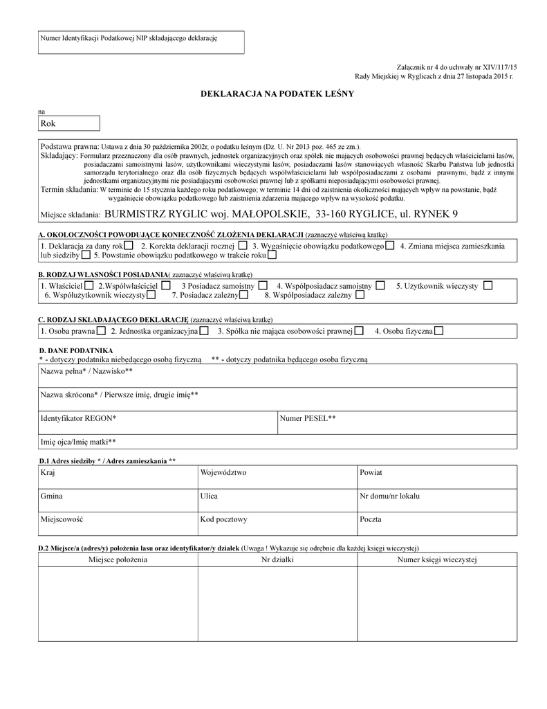 Numer Identyfikacji Podatkowej NIP składającego deklarację Załącznik nr 4 do uchwały nr XIV/117/15 Rady Miejskiej w Ryglicach z dnia 27 listopada 2015 r. DEKLARACJA NA PODATEK LEŚNY na Rok Podstawa prawna: Ustawa z dnia 30 października 2002r, o podatku leśnym (Dz. U. Nr 2013 poz. 465 ze zm.). Składający: Formularz przeznaczony dla osób prawnych, jednostek organizacyjnych oraz spółek nie mających osobowości prawnej będących właścicielami lasów, posiadaczami samoistnymi lasów, użytkownikami wieczystymi lasów, posiadaczami lasów stanowiących własność Skarbu Państwa lub jednostki samorządu terytorialnego oraz dla osób fizycznych będących współwłaścicielami lub współposiadaczami z osobami prawnymi, bądź z innymi jednostkami organizacyjnymi nie posiadającymi osobowości prawnej lub z spółkami nieposiadającymi osobowości prawnej. Termin składania: W terminie do 15 stycznia każdego roku podatkowego; w terminie 14 dni od zaistnienia okoliczności mających wpływ na powstanie, bądź wygaśnięcie obowiązku podatkowego lub zaistnienia zdarzenia mającego wpływ na wysokość podatku. Miejsce składania: BURMISTRZ RYGLIC woj. MAŁOPOLSKIE, 33-160 RYGLICE, ul. RYNEK 9 A. OKOLOCZNOŚCI POWODUJĄCE KONIECZNOŚĆ ZŁOŻENIA DEKLARACJI (zaznaczyć właściwą kratkę) 1. Deklaracja za dany rok 2. Korekta deklaracji rocznej 3. Wygaśnięcie obowiązku podatkowego lub siedziby 5. Powstanie obowiązku podatkowego w trakcie roku 4. Zmiana miejsca zamieszkania B. RODZAJ WŁASNOŚCI POSIADANIA( zaznaczyć właściwą kratkę) 1. Właściciel 2.Współwłaściciel 6. Współużytkownik wieczysty 3 Posiadacz samoistny 7. Posiadacz zależny 4. Współposiadacz samoistny 8. Współposiadacz zależny 5. Użytkownik wieczysty C. RODZAJ SKŁADAJĄCEGO DEKLARACJĘ (zaznaczyć właściwą kratkę) 1. Osoba prawna 2. Jednostka organizacyjna 3. Spółka nie mająca osobowości prawnej 4. Osoba fizyczna D. DANE PODATNIKA * - dotyczy podatnika niebędącego osobą fizyczną Nazwa pełna* / Nazwisko** ** - dotyczy podatnika będącego osoba fizyczną Nazwa skrócona* / Pierwsze imię, drugie imię** Identyfikator REGON* Numer PESEL** Imię ojca/Imię matki** D.1 Adres siedziby * / Adres zamieszkania ** Kraj Województwo Powiat Gmina Ulica Nr domu/nr lokalu Miejscowość Kod pocztowy Poczta D.2 Miejsce/a (adres/y) położenia lasu oraz identyfikator/y działek (Uwaga ! Wykazuje się odrębnie dla każdej księgi wieczystej) Miejsce położenia Nr działki Numer księgi wieczystej E. DANE DOTYCZĄCE PRZEDMIOTÓW OPODATKOWANIA PODATKIEM LEŚNYM (z wyjątkiem zwolnionych) Wyszczególnienie Stawka podatku leśnego w zł, gr (0,220m3 drewna x cena drewna) Powierzchnia lasów w hektarach fizycznych Kwota podatku leśnego w zł, gr 1) Lasy wchodzące w skład rezerwatów przyrody i parków narodowych 2) Lasy pozostałe (nie wymienione w pkt.1) Lasy – razem (w.1-2) F. INFORMACJE O PRZEDMIOTACH ZWOLNIONYCH Na podstawie art.7 ustawy z dnia 30 października 2002 r. o podatku leśnym (t.j. Dz.U. z 2013r. poz. 465) zwolnieniu od podatku leśnego podlegają: Powierzchnia w ha fizycznych Wyszczególnienie 1. Lasy z drzewostanem w wieku do 40 lat 2. Lasy wpisane indywidualnie do rejestru zbytków 3. Użytki ekologiczne 4. Inne Razem G. ŁĄCZNA KWOTA PODATKU (należy zaokrąglić do pełnych złotych) H. OŚWIADCZENIE I PODPIS SKŁADAJĄCEGO/OSOBY REPREZENTUJĄCEJ SKŁADAJĄCEGO Nazwisko Imię Data wypełnienie (dzień-miesiąc-rok) Podpis i pieczęć składającego/osoby reprezentującej składającego Numer telefonu osoby upoważnionej do kontaktu (informacja nieobowiązkowa) I. ADNOTACJE ORGANU PODATKOWEGO Uwagi organu podatkowego Identyfikator przyjmującego formularz Data i podpis przyjmującego formularz Pouczenie: Podatek leśny od 1 ha za rok podatkowy wynosi równowartość pieniężną 0,220 m3 drewna, obliczoną wg średniej ceny sprzedaży drewna uzyskanej przez nadleśnictwa za pierwsze trzy kwartały roku poprzedzającego rok podatkowy, z wyjątkiem lasów wchodzących w skład rezerwatów przyrody i parków narodowych, dla których stawka ulega obniżeniu o 50 %. Obliczony w deklaracji podatek leśny należy wpłacać – bez wezwania, za poszczególne miesiące – w terminie do dnia 15 każdego miesiąca na rachunek Urzędu Miejskiego w Ryglicach nr 55 8589 0006 0050 0000 0550 0001 Zgodnie z art. 6 ust. 7a ustawy o podatku leśnym w przypadku, gdy kwota podatku nie przekracza 100 zł, podatek jest płatny jednorazowo w terminie płatności pierwszej raty. Obowiązek składania deklaracji na podatek leśny dotyczy również podatników korzystających ze zwolnień od podatku leśnego na mocy przepisów ustawy o podatku leśnym (art. 5 ust. 6 ustawy z dnia 30.10.2002r. o podatku leśnym Dz. U. z 2013r. poz. 465) W przypadku niewpłacenia w określonych ustawowo terminach i ratach kwoty podatku lub wpłacenia jej w niepełnej wysokości, niniejsza deklaracja stanowi podstawę do wystawienia tytułu wykonawczego, zgodnie z art. 3 a ustawy z dnia 17 czerwca 1966r. o postępowaniu egzekucyjnym w administracji (t.j. Dz. U. z 2014r. poz. 1619 ze zm.)