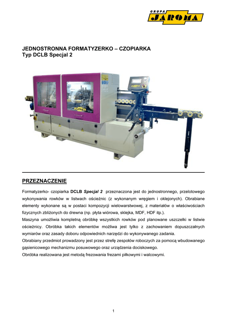 JEDNOSTRONNA FORMATYZERKO – CZOPIARKA Typ DCLB Specjal 2 PRZEZNACZENIE Formatyzerko- czopiarka DCLB Specjal 2 przeznaczona jest do jednostronnego, przelotowego wykonywania rowków w listwach ościeżnic (z wykonanym wręgiem i oklejonych). Obrabiane elementy wykonane są w postaci kompozycji wielowarstwowej, z materiałów o właściwościach fizycznych zbliżonych do drewna (np. płyta wiórowa, sklejka, MDF, HDF itp.). Maszyna umożliwia kompletną obróbkę wszystkich rowków pod planowane uszczelki w listwie ościeżnicy. Obróbka takich elementów możliwa jest tylko z zachowaniem dopuszczalnych wymiarów oraz zasady doboru odpowiednich narzędzi do wykonywanego zadania. Obrabiany przedmiot prowadzony jest przez strefę zespołów roboczych za pomocą wbudowanego gąsienicowego mechanizmu posuwowego oraz urządzenia dociskowego. Obróbka realizowana jest metodą frezowania frezami piłkowymi i walcowymi. 1 Realizowane metody obróbki: CYKL I A1 - frezowanie frezem piłkowym rowka pod listwę osłonową A2 - frezowanie frezem piłkowym rowka pod uszczelkę p.poż. A3 - frezowanie frezem walcowym zataczanym rowka pod uszczelkę szeroką. CYKL II B1 - ręczny nawrót materiału i obrócenie go o 180º - wycinanie rowka pod listwę osłonową po przeciwnej stronie materiału – analogicznie do operacji A1. CYKL I CYKL II A1 A3 B1 A2 DANE TECHNICZNE Parametr Jednostka Wymiar Minimalna szerokość obrabianych elementów mm 100 Maksymalna szerokość obrabianych elementów mm 500 Minimalna długość obrabianych elementów mm 500 Maksymalna długość obrabianych elementów mm 2800 Minimalna grubość obrabianych elementów mm 40 Maksymalna grubość obrabianych elementów mm 80 Dopuszczalna odchyłka grubości obrabianego elementu mm ± 1,5 Maksymalne wielkość wręgu listwy mm 20 x 55 Maksymalna średnica narzędzia w agregacie frezarskim I (A1) mm ø160 Maksymalna średnica narzędzia w agregacie frezarskim II (B1) mm ø160 Maksymalna średnica narzędzia w agregacie frezarskim III (A2) mm ø200 Maksymalna średnica narzędzia w agregacie frezarskim IV (A3) mm ø125x10(do x16) Zakres prędkości posuwu (bezstopniowy) m/min 4,2 ÷ 13 Prędkość obrotowa wrzecion (z możliwością płynnej regulacji z pulpitu operatora) obr/min ~ 7000 ÷ 12000 2 Parametr Jednostka Wymiar Znamionowa moc silników agregatów obróbczych A2 i A3 kW 2,2 Znamionowa moc silników agregatów obróbczych A1 i B1 kW 2,2 lub 4,5 Znamionowa moc silnika posuwu kW 1,5 Maksymalna ilość jednocześnie pracujących wrzecion szt. 3z4 Zapotrzebowanie mocy (w zależności od zastosowanych silników) kW ~8,2 do 13,8 A ~24 do 40,8 Napięcie zasilania VAC 3x400 ±10%, 50Hz Napięcie sterowania VDC 24 Prędkość powietrza w instalacji odciągowej m/s 22 Średnica króćców odciągowych mm 2 x120 Zapotrzebowanie powietrza instalacji odciągowej (natężenie przepływu) m3/h 1800 mm ~4740x1090x1544 Wymiary transportowe (z zamontowanymi płozami): długość x szerokość x wysokość mm ~4740x1200x1594 Masa obrabiarki (z kabinami) kg ~2200 Znamionowy prąd obciążenia (w zależności od zastosowanych silników) Wymiary gabarytowe (maksymalne): długość x szerokość x wysokość (maksymalna szerokość maszyny z otwartymi kabinami wynosi – 1660 mm) 3 KRÓTKI OPIS WYROBU Maszyna zbudowana jest na bazie stabilnego, spawanego korpusu, stanowiącego konstrukcję nośną zarówno dla urządzeń roboczych jak i pomocniczych. Wprowadzanie materiału realizowane jest wzdłuż nastawnej prowadnicy wyznaczającej bazową linię prowadzenia materiału (linię obróbki). Dla ułatwienia wprowadzania i odbioru obrabiarka zaopatrzona jest w odpowiednie prowadnice na wejściu i wyjściu. Transport obrabianego materiału, wzdłuż linii obróbki realizowany jest poprzez zespół transportera – dolnego oraz górnej strefy nacisku. Transporter dolny posiadający specjalny łańcuch z nakładkami gumowymi posiada napęd i powoduje przemieszczanie materiału. Napęd posuwu realizowany jest w sposób płynny bezstopniowy, którego zmianę prędkości wprowadza się na wyświetlaczu zamontowanym na pulpicie operatora. Urządzenie naciskowe (transporter górny), zaopatrzone w ogumowane rolki dociskowe, wywiera nacisk pionowy i pozwala na prawidłowe utrzymanie materiału podczas jego przemieszczania. Dla ułatwienia obróbki szerszych elementów, z prawej strony korpusu maszyny zastosowana została nastawna podpora wysuwna. Agregaty obróbcze zbudowane są na bazie elektrowrzecion z zamontowanymi silnikami wysokoobrotowymi, z możliwością płynnej regulacji prędkości obrotowej w określonym jej zakresie. Budowa poszczególnych agregatów pozwala na odpowiednią ich regulację pionową, poziomą oraz w razie potrzeby wycofania poza strefę obróbki. Nastawy poszczególnych agregatów i urządzeń realizowane są ręcznie, przy pomocy mechanizmów śrubowych zaopatrzonych w cyfrowe liczniki ułatwiające korektę tych nastaw. Agregaty posiadają możliwość zamontowania frezów walcowych mocowanych na otworze, a w szczególności frezów piłkowych. Ponadto maszyna wyposażona jest w kabiny osłonowe, zwiększające bezpieczeństwo i ograniczające emisję hałasu. Kabiny wyposażone są w oświetlenie wewnętrzne. 4 AGREGAT FREZARSKI (A1) Agregat frezarski pionowy sztywny (A1) przeznaczony jest do frezowania rowka pod listwę osłonową w ościeżnicy. Agregat wyposażony jest w silnik specjalny wysokoobrotowy o mocy 2,2 lub 4,5 kW zasilany z przetwornicy częstotliwości. Układ umożliwia regulację prędkości obrotowej w zakresie od 7500 do 12000 obr/min. A1 AGREGAT FREZARSKI (A2) Agregat frezarski przeznaczony jest pionowy do sztywny frezowania rowka (A2) pod uszczelkę p. poż. w ościeżnicy. Agregat wyposażony jest w silnik specjalny wysokoobrotowy o mocy 2,2 kW zasilany z przetwornicy częstotliwości. Układ umożliwia regulację prędkości obrotowej w zakresie od 7500 do 12000 obr/min. A2 5 AGREGAT FREZARSKI (A3) Agregat
