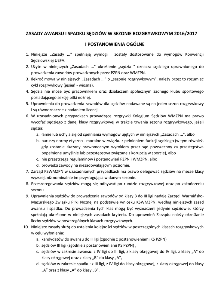 ZASADY AWANSU I SPADKU SĘDZIÓW W SEZONIE ROZGRYWKOWYM 2016/2017 I POSTANOWIENIA OGÓLNE 1. Niniejsze „Zasady ..." spełniają wymogi i zostały dostosowane do wymogów Konwencji Sędziowskiej UEFA. 2. Użyte w niniejszych „Zasadach ..." określenie „sędzia " oznacza sędziego uprawnionego do prowadzenia zawodów prowadzonych przez PZPN oraz WMZPN. 3. Ilekroć mowa w niniejszych „Zasadach ..." o „sezonie rozgrywkowym", należy przez to rozumieć cykl rozgrywkowy (jesień - wiosna). 4. Sędzia nie może być pracownikiem oraz działaczem społecznym żadnego klubu sportowego posiadającego sekcję piłki nożnej. 5. Uprawnienia do prowadzenia zawodów dla sędziów nadawane są na jeden sezon rozgrywkowy i są równoznaczne z nadaniem licencji. 6. W uzasadnionych przypadkach prowadzące rozgrywki Kolegium Sędziów WMZPN ma prawo wycofać sędziego z danej klasy rozgrywkowej w trakcie trwania sezonu rozgrywkowego, jeżeli sędzia: a. łamie lub uchyla się od spełniania wymogów ujętych w niniejszych „Zasadach ...", albo b. naruszy normy etyczno - moralne w związku z pełnieniem funkcji sędziego (w tym również, gdy zostanie skazany prawomocnym wyrokiem przez sąd powszechny za przestępstwa popełnione umyślnie lub przestępstwa związane z korupcją w sporcie), albo c. nie przestrzega regulaminów i postanowień PZPN i WMZPN, albo d. prowadzi zawody na niezadowalającym poziomie. 7. Zarząd KSWMZPN w uzasadnionych przypadkach ma prawo delegować sędziów na mecze klasy wyższej, niż nominalnie im przysługująca w danym sezonie. 8. Przeszeregowania sędziów mogą się odbywać po rundzie rozgrywkowej oraz po zakończeniu sezonu. 9. Uprawnienia sędziów do prowadzenia zawodów od klasy B do III ligi nadaje Zarząd WarmińskoMazurskiego Związku Piłki Nożnej na podstawie wniosku KSWMZPN, według niniejszych zasad awansu i spadku. Do prowadzenia tych klas mogą być wyznaczeni jedynie sędziowie, którzy spełniają określone w niniejszych zasadach kryteria. Do uprawnień Zarządu należy określanie liczby sędziów w poszczególnych klasach rozgrywkowych. 10. Niniejsze zasady służą do ustalenia kolejności sędziów w poszczególnych klasach rozgrywkowych w celu wyłonienia: a. kandydatów do awansu do II ligi (zgodnie z postanowieniami KS PZPN) b. sędziów III ligi (zgodnie z postanowieniami KS PZPN) , c. sędziów w zakresie awansu: z IV ligi do III ligi, z klasy okręgowej do IV ligi, z klasy „A” do klasy okręgowej oraz z klasy „B” do klasy „A”, d. sędziów w zakresie spadku: z III ligi, z IV ligi do klasy okręgowej, z klasy okręgowej do klasy „A” oraz z klasy „A” do klasy „B”. II ZASADY OGÓLNE DOTYCZĄCE SĘDZIÓW 1. Sędzia ubiegający się o awans do wyższej klasy rozgrywkowej powinien: a. odznaczać się nienaganną postawą etyczno - moralną, b. osiągać pozytywne oceny z przeprowadzonych zawodów, c. uzyskiwać wyróżniające oceny z egzaminów pisemnych, szkoleń oraz sprawdzianów kondycyjnych, d. posiadać sportową sylwetkę i wysoką sprawność fizyczną, e. działać aktywnie w organizacji sędziowskiej i brać czynny udział we wszystkich formach szkolenia, f.spełniać odpowiednie kryteria wiekowe, g. zaliczyć egzaminy w pierwszym terminie, h. posiadać przynajmniej wykształcenie średnie, i. wykazywać właściwą dyspozycyjność do prowadzenia zawodów, j. być sędzią rzeczywistym ( nie dotyczy awansu do klasy A). 2. Sędzia czynnie prowadzący zawody musi w terminie do dnia 1 sierpnia każdego roku przedstawić Zarządowi KS W-MZPN aktualne badanie lekarskie zezwalające na sędziowanie, które jest ważne na cały sezon rozgrywkowy. 3. Sędziom w poszczególnych klasach określa się następujące granice wieku: a. sędziowie III ligi do 42 lat, b. sędziowie IV ligi do 45 lat, c. sędziowie Klasy Okręgowej do 48 lat, d. sędziowie klasy „A" i „B" do 55 lat, e. sędziowie asystenci - odpowiednio do wieku danej klasy rozgrywkowej, f. sędziowie zgłoszeni po raz pierwszy do awansu w III i IV lidze do 40 lat, g. sędziowie zgłoszeni po raz pierwszy do awansu w Klasie Okręgowej i A do 45 lat. 4. Zarząd KS W-MZPN na wniosek sędziego klasy „B” albo sędziego asystenta, który ukończył granicę wieku dla swojej klasy, może podjąć decyzję o wydłużeniu dla niego granicy wieku biorąc pod uwagę wyniki egzaminów oraz aktywność szkoleniową danego sędziego. 5. Jako miarodajny w danym sezonie rozgrywkowym przyjmuje się wiek jaki osiąga sędzia w danym roku kalendarzowym. 6. Liczba sędziów Ekstraklasy, I, II, i III ligi oraz sędziów asystentów wynika z uzyskanych uprawnień według postanowień Kolegium Sędziów PZPN 7. Liczba sędziów w pozostałych klasach rozgrywkowych ustalona jest przez Zarząd KS W-MZPN przed sezonem rozgrywkowym. W trakcie rozgrywek mogą nastąpić zmiany ilościowe sędziów w poszczególnych klasach związane z awansami i spadkami. III EGZAMINY SĘDZIOWSKIE A. Egzamin praktyczny (obserwacje) 1. Na zawodach mistrzowskich i pucharowych sędziowie poddani będą egzaminom praktycznym, przez uprawnionych do tego obserwatorów. 2. Oceny (noty) wystawiane będą w skali od 1 do 10 punktów i stopniowane co 0,1 pkt. zgodnie z instrukcją dla obserwatorów. 3. Sędzia, który w danym sezonie rozgrywkowym będzie otrzymywał oceny na poziomie poniżej oczekiwań, rozczarowującym lub bardzo słabym z egzaminu praktycznego może zostać wycofany z danej klasy rozgrywkowej. 4. Minimalna liczba obserwacji potrzebna do sklasyfikowania sędziego w sezonie wynosi: IV liga - 4 mecze, Klasa Okręgowa - 2 mecze, klasa A - 1 mecz. Jeżeli sędzia nie uzyska minimalnej liczby obserwacji o dalszym losie sędziego decyzję podejmie Zarząd KS W-MZPN . 5. Sędziowie klasy „B", którzy wyróżniają się zaangażowaniem i wynikami w szkoleniu, będą poddawani obserwacjom na boisku na zawodach Ligi Wojewódzkiej Juniorów. 6. Sędziowie wyróżniający się mogą zostać 