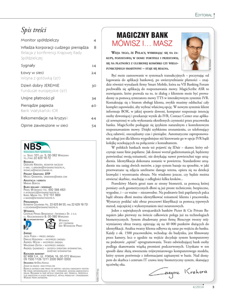 EDYTORIAL Spis treści 4 Władza korporacji cudzego pieniądza Relacja z konferencji Krajowej Rady Spółdzielczej 8 Sygnały 14 Łowy w sieci Wojna z gotówką (97) 24 Dzień dobry JEREMIE Fundusze europejskie (97) 30 Unijne płatności.pl 34 Pieniądze papieża Bank Watykański IOR 40 Rekomendacje na kryzysk 44 Opinie zawieszone w sieci 54 UL. SOLEC 101 LOK. 5; 00-382 TEL./FAKS 22 629 18 72 MAGICZNY BANK MÓWISZ I… MASZ WIZJA TEGO, ŻE POLACY, WYBIERAJĄC SIĘ NA ZAKUPY, POZOSTAWIĄ W DOMU PORTFELE I PRZESTAWIĄ SIĘ NA PŁATNOŚCI Z ULUBIONEJ KOMÓRKI CZY WIELOFUNKCYJNEGO SMARTFONU – STAJE SIĘ REALNA. Być może zastosowanie w systemach transakcyjnych – poczynając od logowania do aplikacji bankowej, po uwierzytelnianie płatności – znajdzie również wynalazek firmy Smart Mobile, która na VII Banking Forum pochwaliła się aplikacją do rozpoznawania mowy. MagicScribe ASR to rozwiązanie, które pozwala na to, że dialog z klientem może być prowadzony za pomocą syntezatora mowy TTS w interaktywnym systemie IVR. Kontaktując się z biurem obsługi klienta, zwykle musimy odsłuchać cały komplet zapowiedzi, aby wybrać właściwą opcję. W nowym systemie klient informuje BOK, w jakiej sprawie dzwoni, komputer rozpoznaje intencję osoby dzwoniącej i przekazuje wynik do IVR, Contact Center oraz aplikacji zewnętrznej w celu wykonania określonych czynności przez pracownika banku. MagicScribe posługuje się językiem naturalnym z kontekstowym rozpoznawaniem mowy. Dzięki szybkiemu zrozumieniu, co telefonujący chcą załatwić, oszczędzamy czas i pieniądze. Automatyczne zaproponowanie usługi jest dla klienta wygodniejsze niż kierowanie go w opcje IVR bądź kolejkę oczekujących na połączenie z konsultantem. W polskich bankach może też pojawić się IDair – skaner, który odczytuje nasze linie papilarne. Jak donosi wortal gadżetomania.pl, będziemy potwierdzać swoją tożsamość, nie dotykając nawet powierzchni tego urządzenia. Identyfikacja dokonana zostanie w powietrzu. Standardowe urządzenie ma zasięg dwóch metrów, a jego system bazuje na sposobie, w jaki przetwarzane są zdjęcia satelitarne danego terenu, opiera się na detekcji krawędzi i wyostrzaniu obrazu. Nie wiadomo jeszcze, czy będzie można otwierać skarbiec, machając z odległości kilku kroków... Prawdziwy Matrix grozi nam ze strony biometrii, za pomocą której pomiary cech geometrycznych dłoni są już proste technicznie, bezpieczne, wygodne, i – co ważne – niezawodne. Na podstawie linii papilarnych palca bądź obrazu dłoni można identyfikować tożsamość klienta i pracownika. Wystarczy poddać taki obraz procesowi klasyfikacji za pomocą typowych metod, najczęściej z wykorzystaniem sieci neuronowych. Jeden z największych szwajcarskich banków Pictet & Cie Private Banquiers jako pierwszy na świecie całkowicie polega już na technologiach biometrycznych. System zbudowany przez firmę Bioscrypt tworzy trójwymiarowy obraz twarzy, opierając się na 40 000 punktów służących do identyfikacji. Analiza twarzy klienta odbywa się zaraz po wejściu do banku. Każdy z ok. 1500 pracowników, wchodząc do budynku, jest filmowany przez kamery, lecz o zgodzie na wejście decyduje system komputerowy na podstawie „opinii” oprogramowania. Twarz odwiedzającej bank osoby podlega skanowaniu wiązką promieni podczerwonych. Uzyskane w ten sposób dane służą stworzeniu trójwymiarowego komputerowego modelu, który system porównuje z informacjami zapisanymi w bazie. Nad dostępem do skarbca i centrum IT czuwa inny biometryczny system, skanujący tęczówkę oka. WARSZAWA REDAKCJA GRZEGORZ KREKORA, REDAKTOR NACZELNY E-MAIL: [email protected], [email protected] PROJEKT GRAFICZNY, DTP MACIEJ GRABOWSKI, [email protected] ADIUSTACJA I KOREKTA MARIAN BORYCKI BIURO REKLAMY I SPRZEDAŻY PAWEŁ WYŻKIEWICZ (TEL. 692 388 492) [email protected] KAROL MAZAN (TEL. 512 151 989) [email protected] PRENUMERATA KATARZYNA CECHOWSKA (TEL. 22 623 84 53, FAKS 22 629 18 72) [email protected] WYDAWCA CENTRUM PRAWA BANKOWEGO I INFORMACJI SP. Z O.O. UL. KRUCZKOWSKIEGO 8; 00-380 WARSZAWA WYDAWCA JEST CZŁONKIEM IZBY WYDAWCÓW PRASY ZARZĄD: JACEK FURGA – PREZES ZARZĄDU DARIUSZ KOZŁOWSKI – WICEPREZES ZARZĄDU ANDRZEJ WOLSKI – WICEPREZES ZARZĄDU WALDEMAR ZBYTEK – WICEPREZES ZARZĄDU ANDRZEJ LAZAROWICZ – ZASTĘPCA DYREKTORA WYDAWNICTWA, SEKRETARZ WYDAWNICTWA Nakład 2500 egz. RACHUNEK BANKOWY BZ WBK S.A., UL. FOKSAL 16, 00-372 WARSZAWA 09 1500 1126 1211 2000 9691 0000 DRUKARNIA ARTDRUK KOBYŁKA ZDJĘCIE NA OKŁADCE: WWW.FOTOLIA.COM REDAKCJA ZASTRZEGA SOBIE PRAWO DO SKRÓTÓW I ADIUSTACJI NADESŁANYCH TEKSTÓW. NIE PONOSI ODPOWIEDZIALNOŚCI ZA TREŚĆ I POPRAWNOŚĆ JĘZYKOWĄ ZAMIESZCZONYCH REKLAM. REKLAMAMI SĄ TAKŻE ARTYKUŁY OZNACZONE JAKO: PROMOCJA, PREZENTACJA (LUB UMIESZCZONE W LAYOCIE PREZENTACJI), ARTYKUŁ PROMOCYJNY I SPONSOROWANY. WSZELKIE PRAWA ZASTRZEŻONE. Fot. Archiwum Monitor spółdzielczy 4/2014 3