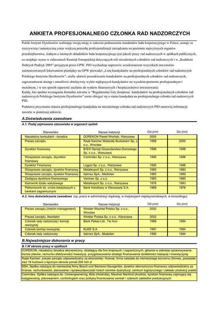 ANKIETA PROFESJONALNEGO CZŁONKA RAD NADZORCZYCH Polski Instytut Dyrektorów realizując swoją misję w zakresie podnoszenia standardów ładu korporacyjnego w Polsce, uznaje za rzeczywistą i autentyczną coraz większą potrzebę profesjonalizacji zarządzania na poziomie najwyŜszych organów przedsiębiorstwa. Jednym z istotnych składników ładu korporacyjnego jest jakość pracy rad nadzorczych w spółkach publicznych, co znajduje wyraz w zaleceniach Komisji Europejskiej dotyczących roli niezaleŜnych członków rad nadzorczych i w „Kodeksie Dobrych Praktyk 2005” przyjętym przez GPW. PID wychodząc naprzeciw oczekiwaniom wszystkich inwestorów zainteresowanych lokowaniem pieniędzy na GPW prowadzi „Listę kandydatów na profesjonalnych członków rad nadzorczych Polskiego Instytutu Dyrektorów”, aŜeby ułatwić poszukiwanie kandydatów na profesjonalnych członków rad nadzorczych, zagwarantować dostęp i umoŜliwić obiektywny wybór najlepszych kandydatów na wysokim poziomie profesjonalnym i moralnym, i w ten sposób zapewnić zaufanie do rynków finansowych i bezpieczeństwo inwestowania. KaŜdy, kto spełnia wymagania formalne zawarte w "Regulaminie listy (korpusu) kandydatów na profesjonalnych członków rad nadzorczych Polskiego Instytutu Dyrektorów" moŜe ubiegać się o status kandydata na profesjonalnego członka rad nadzorczych PID. Podstawę przyznania statusu profesjonalnego kandydata na niezaleŜnego członka rad nadzorczych PID stanowią informacje zawarte w poniŜszej ankiecie. A.Doświadczenia zawodowe A.1. Podaj zajmowane stanowiska w organach spółek Od (rrrr) Do (rrrr) Stanowisko NiezaleŜny konsultant - doradca Nazwa instytucji DOREKON Paweł Wroński, Warszawa Prezes zarządu Raab Karcher Materiały Budowlanr Sp. z o.o., Wrocław B/S/H Sprzęt Gospodarstwa Domowego Sp. z o.o., Warszawa Comindex Sp. z o.o., Warszawa 1998 2000 1996 1998 1995 1996 Dyrektor finansowy Wiceprezes zarządu, dsyrektor finansowy Dyrektor Finansowy 2000 Logpol Sp. z o.o., Warszawa 1995 1996 Wizeprezes zarządu, dyrektor finansowy Metalexport Sp. z o.o., Warszawa 1990 1993 Wizeprezes zarządu, dyrektor finansowy Italmex SpA., Mediolan 1985 1990 Zastępca dyrektora finansowego Varimex Sp. z o.o. 1983 1985 Kierownik działu walutowego Metalexport Sp. z o.o., Warszawa 1976 1983 Pełnomocnik ds. umów kredytowych z bankami zagranicznymi Bank Handlowy w Warszawie S.A. 1969 1976 A.2. Inne doświadczenia zawodowe (np. praca w administracji rządowej, w instytucjach międzynarodowych, w konsultingu) Stanowisko Prezes zarządu (interim management) Prezes zarządu, likwidator Nazwa instytucji Winkler Wachtel Polska Sp. z o.o., Wrocław Winkler Polska Sp. z o.o., Warszawa Od (rrrr) Do (rrrr) 2002 2002 Członek rady nadzorczej i komisji rewizyjnej Członek komisji rewizyjnej Bank Pekao Ltd., Tel Aviv 1989 1994 KUKE S.A. 1991 1994 Członek rady nadzorczej Italmex SpA., Mediolan 1990 1994 B.NajwaŜniejsze dokonania w pracy B.1.W okresie pracy w spółkach DOREKON, niezaleŜny doradca ekonomiczny, działający dla firm krajowych i zagranicznych, głównie w zakresie opracowywania biznes planów, rachunku efektywności inwestycji, przygotowywania strategii finansowania działalności bieŜącej i inwestycyjnej Raab Karcher, prezes zarządu odpowiedzialny za ekonomikę i finanse, firma naleŜała do niemieckiego koncernu Stinnes, posiadała sieć 19 hurtowni o łącznym obrocie ponad 200 mln zł BSH, Spółka naleŜąca do niemieckiej firmy Bosch und Siemens Hausgeräte, dyrektor ekonomiczno-finansowy odpowiiedzialny za finanse, rachunkowość, planowanie i sprawozdawczość trzech centrów dystrybucji, centrum logistycznego i zakładu produkcji pralek Comindex, Spółka naleŜąca do: Comengeenering, Bols (Holandia), Mautner Markhof (Austria), dyrektor finansowy zajmujący się księgowością, planowaniem, controlingiem oraz polityką finansowania centrali i czterech zakładów produkcyjnych Metalexport, I zastępca prezesa i dyrektor finansowy przedsiębiorstwa handlu zagranicznego, odpowiedzialny za finanse tej firmy, jej sześciu afiliacji zagranicznych (Niemcy, Włochy, Anglia, USA, Kanada i Wenezuela) i kilkunastu krajowych B.2.W innej pracy zawodowej (np. w administracji rzadowej, w instytucjach międzynarodowych, w konsultingu , w dydaktyczno naukowej) Winkler Wachtel, na zlecenie niemickiej firmy Wachtel GmbH & Co, (producent wysokiej jakości urządzeń dla przemysłu spoŜywczego) prowdzę sprawy ich firm w Polsce na zasadzie interim management. Pekao, Tel Aviv, Bank Pekao w roku 1989 został przekształcony z oddziału Banku Pekao w ParyŜu w samodzielny Bank w formie spółki akcyjnej z dominującym udziałem Banku Pekao w Warszawie. Do Rady wybrany zostałem jako członek niezaleŜny, reprezentujący głównego klienta Banku. KUKE, Korporacja Ubezpieczeń Kredytów Eksportowych S.A. powstała w 1991 z inicjatywy Ministerstwa Finansów (główny akcjonariusz), BRE Bank i kilku przedsiębiorstw handlu zagranicznego. Do Komisji Rewizyjnej wybrany zostałem z rekomendacji Metalexportu Italmex SpA., jest polsko-włoską spółką, po zakończeniu pracy jako wizeprezes zarządu wybrany zostałem do Rady Nadzorczej jako przedstawiciel polskiego akcjonariusza. C.Profesjonalne zainteresowania zawodowe (dziedzina zarządzania, sektor - branŜa gospodarki) preferencje kandydata przy obsadzie rad nadzorczych Zarządzanie finansami, strategie finansowania inwestycji, przedsiębiorstwa handlowe i przemysłowe D.Wykształcenie D.1.Wykształcenie formalne Tytuł naukowy dyplomowany ekonomista Nazwa szkoły wyŜszej SGPiS Nazwa wydziału (kierunku) Wydział Handlu Zagranicznego, Kierunek Finanse Międzynarodowe Rok ukończenia (rrrr) 1974 D.2.Inne uprawnienia zawodowe (np. radca prawny, rzeczoznawca majatkowy, biegły rewident, makler gieldowy itp.) Rok ukończenia (rrrr) Tytuł / nazwa D.3.Studia podyplomowe i specjalistyczne Nazwa Podyplomowe Studium Finansowania Operacji Handlu Zagrani