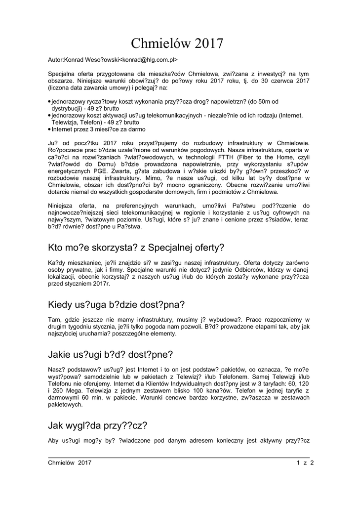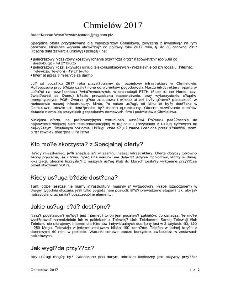 Chmielów 2017 Autor:Konrad Weso?owski<[email protected]> Specjalna oferta przygotowana dla mieszka?ców Chmielowa, zwi?zana z inwestycj? na tym obszarze. Niniejsze warunki obowi?zuj? do po?owy roku 2017 roku, tj. do 30 czerwca 2017 (liczona data zawarcia umowy) i polegaj? na: jednorazowy rycza?towy koszt wykonania przy??cza drog? napowietrzn? (do 50m od dystrybucji) - 49 z? brutto jednorazowy koszt aktywacji us?ug telekomunikacyjnych - niezale?nie od ich rodzaju (Internet, Telewizja, Telefon) - 49 z? brutto Internet przez 3 miesi?ce za darmo Ju? od pocz?tku 2017 roku przyst?pujemy do rozbudowy infrastruktury w Chmielowie. Ro?poczecie prac b?dzie uzale?nione od warunków pogodowych. Nasza infrastruktura, oparta w ca?o?ci na rozwi?zaniach ?wiat?owodowych, w technologii FTTH (Fiber to the Home, czyli ?wiat?owód do Domu) b?dzie prowadzona napowietrznie, przy wykorzystaniu s?upów energetycznych PGE. Zwarta, g?sta zabudowa i w?skie uliczki by?y g?ówn? przeszkod? w rozbudowie naszej infrastruktury. Mimo, ?e nasze us?ugi, od kilku lat by?y dost?pne w Chmielowie, obszar ich dost?pno?ci by? mocno ograniczony. Obecne rozwi?zanie umo?liwi dotarcie niemal do wszystkich gospodarstw domowych, firm i podmiotów z Chmielowa. Niniejsza oferta, na preferencyjnych warunkach, umo?liwi Pa?stwu pod??czenie do najnowocze?niejszej sieci telekomunikacyjnej w regionie i korzystanie z us?ug cyfrowych na najwy?szym, ?wiatowym poziomie. Us?ugi, które s? ju? znane i cenione przez s?siadów, teraz b?d? równie? dost?pne u Pa?stwa. Kto mo?e skorzysta? z Specjalnej oferty? Ka?dy mieszkaniec, je?li znajdzie si? w zasi?gu naszej infrastruktury. Oferta dotyczy zarówno osoby prywatne, jak i firmy. Specjalne warunki nie dotycz? jedynie Odbiorców, którzy w danej lokalizacji, obecnie korzystaj? z naszych us?ug i/lub do których zosta?y wykonane przy??cza przed styczniem 2017r. Kiedy us?uga b?dzie dost?pna? Tam, gdzie jeszcze nie mamy infrastruktury, musimy j? wybudowa?. Prace rozpoczniemy w drugim tygodniu stycznia, je?li tylko pogoda nam pozwoli. B?d? prowadzone etapami tak, aby jak najszybciej uruchamia? poszczególne elementy. Jakie us?ugi b?d? dost?pne? Nasz? podstawow? us?ug? jest Internet i to on jest podstaw? pakietów, co oznacza, ?e mo?e wyst?powa? samodzielnie lub w pakietach z Telewizj? i/lub Telefonem. Samej Telewizji i/lub Telefonu nie oferujemy. Internet dla Klientów Indywidualnych dost?pny jest w 3 taryfach: 60, 120 i 250 Mega. Telewizja z jednym zestawem blisko 100 kana?ów. Telefon w jednej taryfie z darmowymi 60 min. w pakiecie. Warunki cenowe bardzo korzystne, zw?aszcza w zestawach pakietowych. Jak wygl?da przy??cz? Aby us?ugi mog?y by? ?wiadczone pod danym adresem konieczny jest aktywny przy??cz Chmielów 2017 1 z 2 ?wiat?owodowy, który zako?czony jest gniazdem. Standardowy, oferowany przy??cz obejmuje napowietrzn? lini? ze s?upa energetycznego, którego d?ugo?? nie przekracza 50m od s?upa. Istnieje mo?liwo?? wykonania przy??cza droga doziemn? lub przekraczaj?cego 50m, jednak wymaga to odr?bnej, indywidualnej wyceny. Ka?dy przy??cz wykonujemy oddzielnie, na nowym okablowaniu (nie mo?na wykorzysta? istniej?cych kabli innych operatorów). Co nale?y zrobi?, aby si? pod??czy?? Je?li ju? istnieje w pobli?u infrastruktura, wystarczy jeden telefon do naszego biura. Zapiszemy Pa?stwa dane i umówimy si? na wizje lokaln? lub od razu na przy??cz. Czas oczekiwania staramy si?, aby nie przekroczy? 14 dni. Ile kosztuj? us?ugi? Pomijaj?c pocz?tkowe trzy miesi?c, Internet , Telewizja i Telefon oferowany jest na standardowych warunkach, które s? bardzo korzystne, zw?aszcza w po??czeniu pakietowym. Dodatkowo sam Internet przez pierwsze 3 miesi?ce jest bez ?adnych op?at. Istotne Informacje Ka?demu Klientowi, przy aktywacji us?ugi, zostaje za darmo u?yczony (na ca?y okres umowy) wysokiej klasy ONU/ONT, który ??czy w sobie terminal ?wiat?owodowy, router dla sieci domowej, prze??cznik 4-portowy, bramk? telefoniczn? i bezprzewodowy punkt dost?powy dla sieci wi-fi. ONU wymaga zasilania elektrycznego, wi?c powinien zosta? ulokowany niedaleko gniazda 230V. Ponadto nale?y pami?ta?, ?e lokalizacja ONU ma znaczenie dla zasi?gu sieci bezprzewodowej, a tak?e korzystania z Telewizji HLG (do ONU kablowo musz? by? pod??czone dekodery). Router umo?liwia jednoczesne korzystanie z sieci przez 13 lub 29 urz?dze? (w zale?no?ci od taryfy) Jakie s? ograniczenia? Nie blokujemy portów i nie ma limitów w ilo?ciach ?ci?ganych lub wysy?anych danych. Istnieje mo?liwo?? przydzielenia sta?ego publicznego adresu IP (opcja p?atna). Nie wyra?amy natomiast zgody na rozdzielanie us?ug na kilka domów i pod??czanie kolejnych routerów. Stawiamy na uczciwe, partnerskie zasady i tego równie? oczekujemy od naszych kontrahentów. Chmielów 2017 2z2