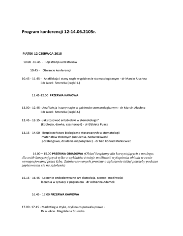 Program konferencji 12-14.06.2105r. PIĄTEK 12 CZERWCA 2015 10.00 -10.45 - Rejestracja uczestników 10.45 - Otwarcie konferencji 10.45 - 11.45 - Anafilaksja i stany nagłe w gabinecie stomatologicznym - dr Marcin Aluchna i dr Jacek Smereka (część 1.) 11.45-12.00 PRZERWA KAWOWA 12.00 - 12.45 - Anafilaksja i stany nagłe w gabinecie stomatologicznym - dr Marcin Aluchna i dr Jacek Smereka (część 2.) 12.45 - 13.15 - Jak stosować antybiotyki w stomatologii? (Etiologia, dawka, czas terapii) - dr Elżbieta Puacz 13.15 - 14.00 - Bezpieczeństwo biologiczne stosowanych w stomatologii materiałów złożonych (uczulenia, nadwrażliwość pozabiegowa, działania niepożądane) - dr hab Konrad Małkiewicz 14.00 – 15.00 PRZERWA OBIADOWA (Obiad bezpłatny dla korzystających z noclegu; dla osób korzystających tylko z wykładów istnieje możliwość wykupienia obiadu w cenie wynegocjowanej przez Izbę. Zainteresowanych prosimy o zgłoszenie takiej potrzeby podczas zapisywania się na szkolenie) 15.15 - 16.45 - Leczenie endodontyczne czy ekstrakcja, szanse i możliwości leczenia w sytuacji z pogranicza - dr Adrianna Adamek 16.45 - 17.00 PRZERWA KAWOWA 17.00 -17.45 - Marketing a etyka, czyli na co pozwala prawo Dr n. ekon. Magdalena Szumska 17.45 - 18.30 - Potęga wizerunku: znaczenie wyglądu lekarza i gabinetu, spójność wizerunku. Dr Marcin Szumski 20.30. UROCZYSTA KOLACJA (NIESPODZIANKA WIECZORU NR 1) SOBOTA 13 CZERWCA 2015 9.00 - 9.45 - Żywienie a zdrowie jamy ustnej pacjentów w wieku rozwojowym prof. dr hab. Dorota Olczak-Kowalczyk 9.45 - 10.45 - Okluzja statyczna i dynamiczna w leczeniu stomatologicznym dr Andrzej Bożyk 10.45 - 10.50 PRZERWA KAWOWA 10.55 - 11.40 - Wirus HPV jako jeden z czynników powstawania raka jamy ustnej. Metody wizualizacji rozpoznawaniu zmian nowotworowych lek. dent. Karolina Szaniawska , lek. dent. Tomasz Kamiński 11.40 -12.10 - Współczesna trendy w leczeniu próchnicy ubytkowej dr hab. Agnieszka Mielczarek 12.10 - 12.40 - Wykonywanie procedur minimalnie inwazyjnych w korekcie estetyki uzębienia – lek. dent. Karolina Kowalczyk 12.40 - 12.50 PRZERWA KAWOWA 12.50 - 13.30 – Trzeci wymiar w chirurgii stomatologicznej i implantologiimożliwości rozwiazywania problemów diagnostycznych w trudnych przypadkach klinicznych - dr hab. R. Koszowski 13.30 - 14.00 - zabiegi kriochirurgiczne w schorzeniach jamy ustnej - dr J. Waskowska 14.00-15.00 PRZERWA OBIADOWA (Obiad bezpłatny dla korzystających z noclegu; dla osób korzystających tylko z wykładów istnieje możliwość wykupienia obiadu w cenie wynegocjowanej przez Izbę. Zainteresowanych prosimy o zgłoszenie takiej potrzeby podczas zapisywania się na szkolenie) 15.15 - 16.15 - Zadbajmy o własne zdrowie. Kinesiology Tape w medycynie, w tym w stomatologii oraz dla lekarzy stomatologów jako pacjentów - dr Z. Hamerlak 16.15-16.30 PRZERWA KAWOWA 16.30 - 18.00 - Prawo medyczne – personel medyczny działający w zespole praktyczne aspekty odpowiedzialności prawnej - mec. P. Strzelec 20.00 KOLACJA BUFETOWA (NIESPODZIANKA WIECZORU NR 2)