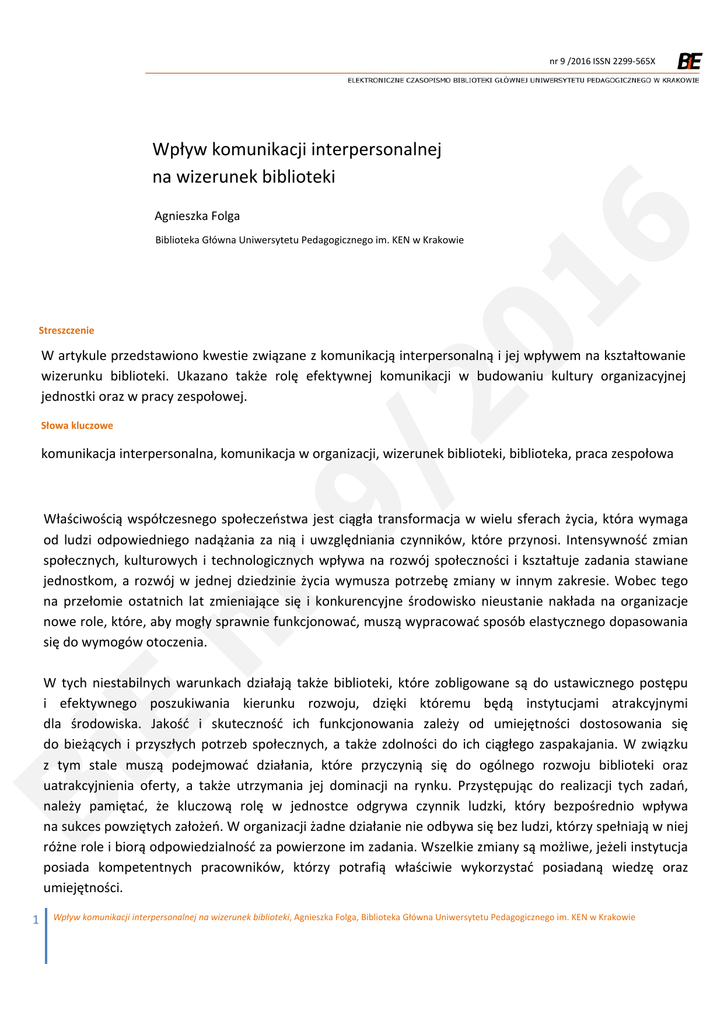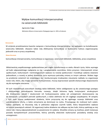 nr 9 /2016 ISSN 2299‐565X Wpływ komunikacji interpersonalnej na wizerunek biblioteki 16 Agnieszka Folga Streszczenie 20 Biblioteka Główna Uniwersytetu Pedagogicznego im. KEN w Krakowie W artykule przedstawiono kwestie związane z komunikacją interpersonalną i jej wpływem na kształtowanie wizerunku biblioteki. Ukazano także rolę efektywnej komunikacji w budowaniu kultury organizacyjnej jednostki oraz w pracy zespołowej. Słowa kluczowe 9/ komunikacja interpersonalna, komunikacja w organizacji, wizerunek biblioteki, biblioteka, praca zespołowa Bi E nr Właściwością współczesnego społeczeństwa jest ciągła transformacja w wielu sferach życia, która wymaga od ludzi odpowiedniego nadążania za nią i uwzględniania czynników, które przynosi. Intensywność zmian społecznych, kulturowych i technologicznych wpływa na rozwój społeczności i kształtuje zadania stawiane jednostkom, a rozwój w jednej dziedzinie życia wymusza potrzebę zmiany w innym zakresie. Wobec tego na przełomie ostatnich lat zmieniające się i konkurencyjne środowisko nieustanie nakłada na organizacje nowe role, które, aby mogły sprawnie funkcjonować, muszą wypracować sposób elastycznego dopasowania się do wymogów otoczenia. W tych niestabilnych warunkach działają także biblioteki, które zobligowane są do ustawicznego postępu i efektywnego poszukiwania kierunku rozwoju, dzięki któremu będą instytucjami atrakcyjnymi dla środowiska. Jakość i skuteczność ich funkcjonowania zależy od umiejętności dostosowania się do bieżących i przyszłych potrzeb społecznych, a także zdolności do ich ciągłego zaspakajania. W związku z tym stale muszą podejmować działania, które przyczynią się do ogólnego rozwoju biblioteki oraz uatrakcyjnienia oferty, a także utrzymania jej dominacji na rynku. Przystępując do realizacji tych zadań, należy pamiętać, że kluczową rolę w jednostce odgrywa czynnik ludzki, który bezpośrednio wpływa na sukces powziętych założeń. W organizacji żadne działanie nie odbywa się bez ludzi, którzy spełniają w niej różne role i biorą odpowiedzialność za powierzone im zadania. Wszelkie zmiany są możliwe, jeżeli instytucja posiada kompetentnych pracowników, którzy potrafią właściwie wykorzystać posiadaną wiedzę oraz umiejętności. 1 Wpływ komunikacji interpersonalnej na wizerunek biblioteki, Agnieszka Folga, Biblioteka Główna Uniwersytetu Pedagogicznego im. KEN w Krakowie Bi E nr 9/ 20 16 W celu zwiększenia efektywności pracy podmioty powołują zespoły składające się z pracowników mających zrealizować powierzone im projekty. Coraz większy nacisk kładzie się na pracę zespołową, gdyż zatrudnieni poprzez kolektywne działania zastępują osobiste priorytety wspólnymi koncepcjami. Przez zespół rozumie się dwie lub więcej osób, współdziałających i wzajemnie oddziałujących na siebie w dążeniu do wspólnego celu [1]. Intencją tworzenia zespołów jest rozwiązywanie problemów zbyt czasochłonnych bądź niemożliwych do wykonania przez jedną osobę. Dodatkowo wydajność zespołów jest lepsza niż pojedynczych osób, ponieważ w ich skład wchodzą jednostki o różnych kompetencjach, zapatrywaniach oraz zawodowych doświadczeniach, a także odmiennej osobowości. Przedsiębiorstwa, tworząc zespoły, chcą osiągnąć dwa główne cele: lepszą efektywność pracy pracowników oraz polepszenie sytuacji pracy, tak aby umiejętności pracowników i ich wiedza jak najlepiej odpowiadały zadaniom, które mają do wykonania oraz by umożliwiały rozwój każdego pracownika [2]. Jeżeli przeniesiemy zagadnienia pracy zespołowej oraz komunikacji interpersonalnej na obszar biblioteki to musimy pamiętać, że stworzenie dobrego zespołu, który efektywnie spełnia założone cele jednostki, jest procesem długofalowym i trudnym oraz zależy od wielu czynników. Między innymi właściwa wymiana informacji jest nieodzownym elementem każdego zespołu i jest niezbędna podczas współpracy. Komunikacja jest procesem organizowania wiadomości i środków przekazu w celu tworzenia znaczenia [3]. Natomiast komunikacja interpersonalna określana jest jako proces kierowania komunikatami oraz środkami przekazu w celu tworzenia znaczenia w interakcjach między ludźmi w kontakcie osobistym lub społecznym [4]. Kultura organizacyjna biblioteki związana jest z komunikacją, która przyczynia się do właściwego funkcjonowania, a także umożliwia realizację jej zadań. Dzięki niej można zwiększyć skuteczność działań, stworzyć zgrany zespół, zapewnić odpowiednią atmosferę, a także zbudować wizerunek. Właściwa komunikacja jest ważnym elementem w budowaniu porozumienia pomiędzy ludźmi i powinny o nią dbać osoby reprezentujące kadrę zarządzającą. Każda biblioteka posiada własny sposób komunikacji, który został przez nią wybrany, uwzględniając swoje założenia. Dobra komunikacja ma podłoże wewnątrz organizacji, a jej rola jest nieoceniona, ponieważ wpływa na motywację oraz wyniki pracy. W celu wykreowania właściwego wizerunku biblioteki nie wystarczy stosować się tylko do odpowiednich działań marketingowych. Należy pamiętać, że w jednostce kluczową rolę odgrywa efektywna komunikacja, która wpływa na kulturę organizacyjną, tworząc korzystną atmosferę. Zadowolony bibliotekarz będzie identyfikował się z miejscem pracy, a tym samym będzie je reklamował na zewnątrz, kreując w ten sposób korzystny jej wizerunek. W związku z tym, że największy wpływ na obraz biblioteki mają pracownicy, muszą być oni informowani o procesach, które w niej zachodzą, aby nie wykonywali pracy mniej efektywnie, a ich gotowość do realizowania zadań nie była obniżona. Istotne jest, aby otrzymywali informacje w odpowiednim czasie, gdyż dbałość o skuteczną komunikację wewnątrz zespołu pracowniczego jest dobrym sposobem na poprawę jakości pra
