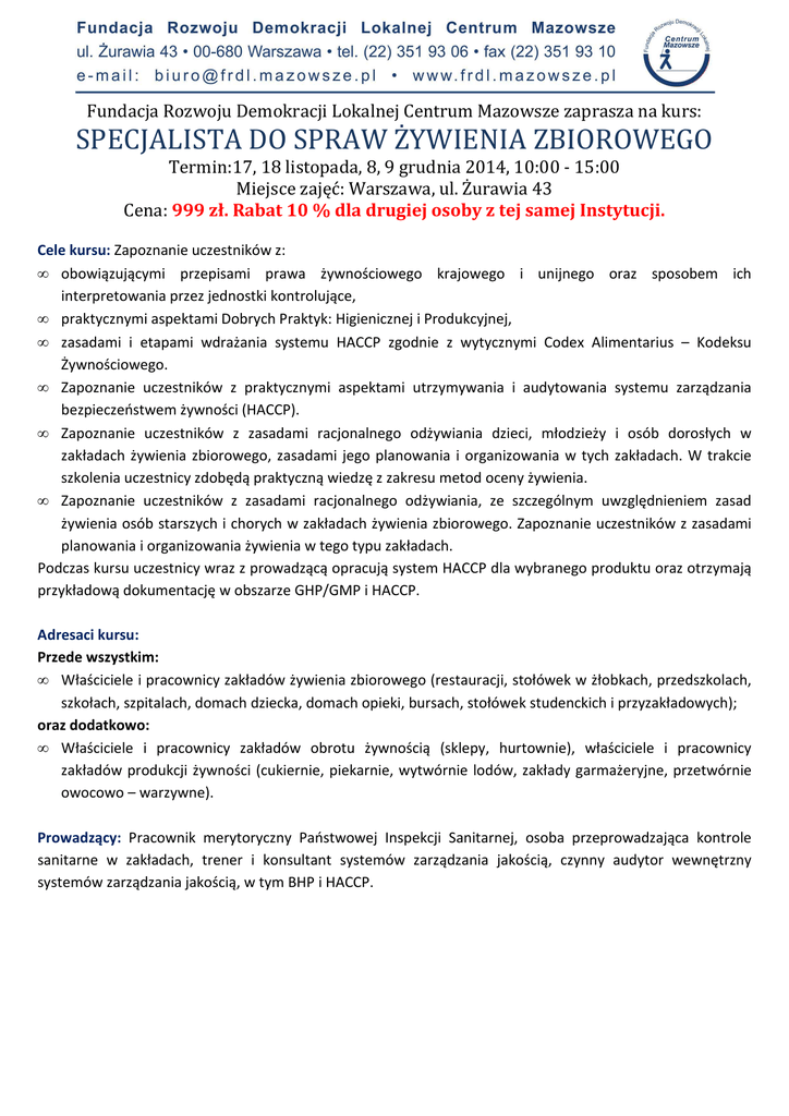 Fundacja Rozwoju Demokracji Lokalnej Centrum Mazowsze zaprasza na kurs: SPECJALISTA DO SPRAW ŻYWIENIA ZBIOROWEGO Termin:17, 18 listopada, 8, 9 grudnia 2014, 10:00 - 15:00 Miejsce zajęć: Warszawa, ul. Żurawia 43 Cena: 999 zł. Rabat 10 % dla drugiej osoby z tej samej Instytucji. Cele kursu: Zapoznanie uczestników z: • obowiązującymi przepisami prawa żywnościowego krajowego i unijnego oraz sposobem ich interpretowania przez jednostki kontrolujące, • praktycznymi aspektami Dobrych Praktyk: Higienicznej i Produkcyjnej, • zasadami i etapami wdrażania systemu HACCP zgodnie z wytycznymi Codex Alimentarius – Kodeksu Żywnościowego. • Zapoznanie uczestników z praktycznymi aspektami utrzymywania i audytowania systemu zarządzania bezpieczeństwem żywności (HACCP). • Zapoznanie uczestników z zasadami racjonalnego odżywiania dzieci, młodzieży i osób dorosłych w zakładach żywienia zbiorowego, zasadami jego planowania i organizowania w tych zakładach. W trakcie szkolenia uczestnicy zdobędą praktyczną wiedzę z zakresu metod oceny żywienia. • Zapoznanie uczestników z zasadami racjonalnego odżywiania, ze szczególnym uwzględnieniem zasad żywienia osób starszych i chorych w zakładach żywienia zbiorowego. Zapoznanie uczestników z zasadami planowania i organizowania żywienia w tego typu zakładach. Podczas kursu uczestnicy wraz z prowadzącą opracują system HACCP dla wybranego produktu oraz otrzymają przykładową dokumentację w obszarze GHP/GMP i HACCP. Adresaci kursu: Przede wszystkim: • Właściciele i pracownicy zakładów żywienia zbiorowego (restauracji, stołówek w żłobkach, przedszkolach, szkołach, szpitalach, domach dziecka, domach opieki, bursach, stołówek studenckich i przyzakładowych); oraz dodatkowo: • Właściciele i pracownicy zakładów obrotu żywnością (sklepy, hurtownie), właściciele i pracownicy zakładów produkcji żywności (cukiernie, piekarnie, wytwórnie lodów, zakłady garmażeryjne, przetwórnie owocowo – warzywne). Prowadzący: Pracownik merytoryczny Państwowej Inspekcji Sanitarnej, osoba przeprowadzająca kontrole sanitarne w zakładach, trener i konsultant systemów zarządzania jakością, czynny audytor wewnętrzny systemów zarządzania jakością, w tym BHP i HACCP. Program: Dzień I – 17 XI 2014 SYSTEM HACCP (WDRAŻANIE I UTRZYMYWANIE) ORAZ AKTUALNE PRZEPISY HIGIENICZNO – SANITARNE OBOWIĄZUJĄCE W ZAKŁADACH ŻYWIENIOWO – ŻYWNOŚCIOWYCH I SPOSÓB ICH INTERPRETOWANIA PRZEZ JEDNOSTKI KONTROLUJĄCE Część teoretyczna: 1. Bezpieczeństwo i jakość zdrowotna żywności w świetle aktualnych przepisów prawnych krajowych i UE. Aktualne wymagania prawne stawiane dla zakładów żywieniowo – żywnościowych oraz sposób ich interpretowania przez służby kontrolne. 2. Ułatwienia we wdrażaniu systemu HACCP – stanowisko UE. 4. GHP, GMP, HACCP jako narzędzia zabezpieczania jakości zdrowotnej żywności. 5. Dobre Praktyki Higieniczne i Produkcyjne podwaliną systemu HACCP. 6. Zasady i etapy wdrażania systemu HACCP. 7. Ograniczenia i korzyści wynikające z wdrożenia GHP, GMP oraz systemu HACCP. Część praktyczna - warsztaty - praca zespołowa: 1. Przygotowanie pełnej dokumentacji systemu HACCP dla wybranego produktu – aspekty praktyczne: przygotowanie receptury produktu gotowego, przeprowadzenie analizy zagrożeń oraz wyznaczenie punktów kontrolnych i krytycznych, ustalenie sposobu i częstotliwości monitorowania, działań korygujących i zapobiegawczych, ustalenie sposobu weryfikacji wdrożonego systemu. 2. Ocena zakładowej dokumentacji GHP, GMP i HACCP przedstawionej przez uczestników szkolenia, indywidualne konsultacje dla uczestników – fakultatywnie. Podsumowanie i dyskusja. Potwierdzenie uczestnictwa w szkoleniu: certyfikat ukończenia szkolenia, umożliwiający spełnienie obowiązku prawnego dotyczącego obowiązkowego przeszkolenia osób odpowiedzialnych za wdrażanie i utrzymywanie systemu HACCP w zakładach żywieniowo - żywnościowych. Dzień II – 18 XI 2014 SYSTEM HACCP – WERYFIKACJA SYSTEM ZARZĄDZANIA BEZPIECZEŃSTWEM ŻYWNOŚCI ZGODNY Z NORMĄ PN-EN-ISO 22000: 2006. AUDITOR WEWNĘTRZNY SYSTEMU ZARZĄDZANIA BEZPIECZEŃSTWEM ŻYWNOŚCI WDROŻONEGO ZGODNIE Z NORMĄ PN-EN-ISO 22000:2006 Program: Część teoretyczna: 1. Zasady i etapy wdrażania systemu zarządzania bezpieczeństwem żywności zgodne z wytycznymi Codex Alimentarius – Kodeksu Żywnościowego. 2. Powody przeprowadzania weryfikacji systemu zarządzania bezpieczeństwem żywności. 3. Audit wewnętrzny, jako skuteczne narzędzie monitorowania skuteczności wdrożonego systemu zarządzania bezpieczeństwem żywności. 4. Podstawy auditowania systemu zarządzania bezpieczeństwem zdrowotnym żywności: terminologia, pojęcie auditu, powody przeprowadzania auditów, cechy auditów – zgodnie z nowym wydaniem normy PN-EN ISO 19011:2012. 5. Wymagania stawiane auditorom, rola auditora, kompetencje. 6. Przebieg auditu: planowanie auditu, spotkanie otwierające, przeprowadzanie auditu, poszukiwanie zgodności i dowodów, formułowanie niezgodności i spostrzeżeń. 7. Raportowanie wyników auditu. 8. Działania poauditowe, jako forma doskonalenia zakładowego systemu zarządzania bezpieczeństwem zdrowotnym żywności. 9. Certyfikacja systemu zarządzania bezpieczeństwem zdrowotnym żywności. Część praktyczna - warsztaty - praca zespołowa: 1. Przegląd przykładowej Księgi systemu zarządzania bezpieczeństwem żywności. 2. Omówienie pełnej dokumentacji systemu zarządzania bezpieczeństwem żywności dla wybranego produktu. 3. Przygotowanie dokumentów auditowych: program auditów, plan auditu, lista pytań kontrolnych, raport z auditu. 4. Ocena zakładowej dokumentacji GHP, GMP i HACCP przedstawionej przez uczestników szkolenia, indywidualne konsultacje dla uczestników. Podsumowanie i dyskusja. Potwierdzenie uczestnictwa w szkoleniu: certyfikat ukończenia szkolenia, umożliwiający spe