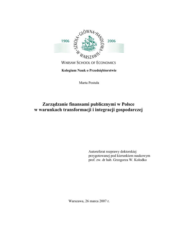 Kolegium Nauk o Przedsiębiorstwie Marta Postuła Zarządzanie finansami publicznymi w Polsce w warunkach transformacji i integracji gospodarczej Autoreferat rozprawy doktorskiej przygotowanej pod kierunkiem naukowym prof. zw. dr hab. Grzegorza W. Kołodko Warszawa, 26 marca 2007 r. Spis treści I Przesłanki podjęcia tematu...................................................................................................3 II Cele pracy i główne tezy badawcze.................................................................................... 6 III Metody badawcze oraz źródła informacji........................................................................7 IV Struktura pracy.................................................................................................................. 8 V Wnioski ................................................................................................................................ 9 VI Spis treści ..........................................................................................................................13 2 I Przesłanki podjęcia tematu W długim okresie kryterium sukcesu gospodarczego jest poprawa konkurencyjności przedsiębiorstw oraz stały wzrost dobrobytu obywateli. W przypadku Polski cel ten jest określony przez osiągnięcie realnej konwergencji z krajami wysoko rozwiniętymi, co jest możliwe tylko na drodze szybkiego wzrostu gospodarczego. Badania naukowe i wiele przykładów z historii gospodarczej wskazują, że osiągnięcie i utrzymanie wysokiego tempa wzrostu gospodarczego nie jest możliwe bez funkcjonalnego i efektywnego systemu finansów publicznych. Zagadnienia związane z finansami publicznymi poddawane są analizie pod kątem: • prawa regulującego ich funkcjonowanie; • skali uczestnictwa państwa w procesach alokacji czynników wytwórczych oraz redystrybucji dochodów; • optymalnego poziomu oraz rodzajowej struktury wydatków dokonywanych przez państwo w kontekście realizowanych zadań; • procesów pozyskiwania środków do budżetu, czyli tzw. ogólnej teorii opodatkowania badającej podstawy prawne i zasady poboru podatków, technikę opodatkowania i skutki makroekonomiczne systemu podatkowego ze szczególnym uwzględnieniem wpływu na deficyt budżetowy i dług publiczny, oraz szczegółowej teorii podatków, tj. teorii pozytywnej, opisującej praktykę rozwiązań podatkowych. Jednym z głównych tematów podejmowanych we współczesnej ekonomii, w tym w zakresie finansów publicznych, jest zagadnienie wywiązywania się z zadań powierzonych rynkowi oraz państwu. Istnieją różne przyczyny, które mogą sprawić, że rynek nie zawsze jest efektywny: zawodność konkurencji, zakłócenia wynikające z istnienia dóbr publicznych, niedostosowanie wynikające z efektów zewnętrznych, niekompletność rynków, zawodność wynikająca z niepełnej czy asymetrycznej informacji, bezrobocie, inflacja i brak równowagi. Brak zdolności do pełnej regulacji procesów reprodukcji wyłącznie przez czynniki rynkowe uzasadnia zatem ingerencję państwa w mechanizm rynkowy. Państwo jednak, podobnie jak rynek, też bywa niesprawne i nieefektywne. Głównymi przyczynami w tym przypadku są ponownie niedostatek i asymetria informacji, ograniczone możliwości kontroli nad działaniem prywatnych rynków oraz alienowanie się biurokracji państwowej i samorządowej i jej skorumpowanie, a dodatkowo także sytuacja polityczna i ograniczenia z nią związane. Przeciwnicy interwencji państwa – czy też, w innym ujęciu, zwolennicy skrajnej deregulacji i totalnej prywatyzacji – uważają, że źródła zawodności państwa są wystarczającym argumentem za tym, aby powstrzymało się od interwencji w gospodarce i nie próbowało naprawiać wad mechanizmu rynkowego, gdyż per saldo powoduje to więcej szkód niż pożytku w funkcjonowaniu gospodarki. Transformacja roli państwa polega więc na ograniczeniu jego dotychczasowych prerogatyw, ale nie oznacza to, że jego rola zanika lub staje się mniej istotna, dzieje się bowiem odwrotnie. Ten pozorny paradoks ginie, gdy funkcje te rozdzieli się na operacyjne i systemowe. Operacyjne rzeczywiście ulegają ograniczeniu, natomiast zapotrzebowanie na systemowe rośnie. Trzeba przy tym podkreślić, że funkcjonujący w ramach państwa system finansów publicznych musi być zrozumiały i akceptowany przez podmioty gospodarcze – przez przedsiębiorców i gospodarstwa domowe. Jest to niezbędny warunek ich funkcjonalności i efektywności, tym bardziej, że często to, co niezrozumiałe, nie jest także akceptowane. 3 Okres transformacji, który polega na przejściu od socjalistycznej gospodarki centralnie planowanej do kapitalistycznej gospodarki rynkowej, jest procesem bardzo złożonym. Część problemów związanych z kształtowaniem struktury gospodarki i procesów rozwojowych została rozwiązana, wielu nie udało się sprostać, wyłoniły się także nowe. Zmieniająca się krok po kroku rola państwa siłą rzeczy oznaczała bardzo głębokie przekształcenia w systemie finansów publicznych, co warte jest dokładnego przeanalizowania. Mówiąc o początku okres transformacji gospodarczej w Polsce, często ma się na myśli początek 1990 roku związany z wprowadzeniem programu gospodarczego ogłoszonego w październiku 1989 roku. Nie odpowiada to jednak rzeczywistości i jest dużym uproszczeniem, ponieważ szereg ważnych reform zostało wprowadzonych już przed rokiem 1990. Zmiany polityczno-ustrojowe, jakie nastąpiły w 1989 roku, były wszakże okazją do zintensyfikowania prowadzonych już wcześniej działań, również w obszarze finansów publicznych. Można przyjąć bowiem, że fundamentalna, jakościowa restrukturyzacja sektora finansów publicznych w naszym kraju rozpoczęła się już podczas tzw. drugiego etapu reformy gospodarczej w drugiej połowie lat 80., a impetu nabrała od historycznych obrad Okrągłego Stołu. Od tamt
