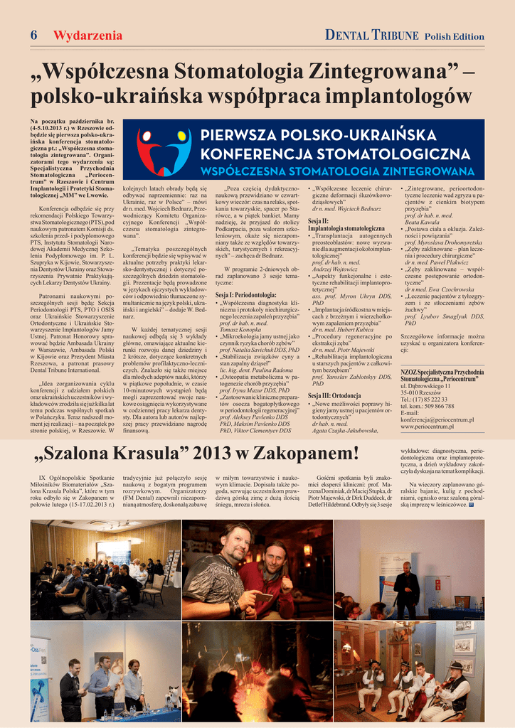 6 Wydarzenia DENTAL TRIBUNE Polish Edition „Współczesna Stomatologia Zintegrowana” – polsko-ukraińska współpraca implantologów Na początku października br. (4-5.10.2013 r.) w Rzeszowie odbędzie się pierwsza polsko-ukraińska konferencja stomatologiczna pt.: „Współczesna stomatologia zintegrowana”. Organizatorami tego wydarzenia są: Specjalistyczna Przychodnia Stomatologiczna „Periocentrum” w Rzeszowie i Centrum Implantologii i Protetyki Stomatologicznej „MM” we Lwowie. Konferencja odbędzie się przy rekomendacji Polskiego Towarzystwa Stomatologicznego (PTS), pod naukowym patronatem Komisji ds. szkolenia przed- i podyplomowego PTS, Instytutu Stomatologii Narodowej Akademii Medycznej Szkolenia Podyplomowego im. P. L. Szupryka w Kijowie, Stowarzyszenia Dentystów Ukrainy oraz Stowarzyszenia Prywatnie Praktykujących Lekarzy Dentystów Ukrainy. Patronami naukowymi poszczególnych sesji będą: Sekcja Periodontologii PTS, PTO i OSIS oraz Ukraińskie Stowarzyszenie Ortodontyczne i Ukraińskie Stowarzyszenie Implantologów Jamy Ustnej. Patronat Honorowy sprawować będzie Ambasada Ukrainy w Warszawie, Ambasada Polski w Kijowie oraz Prezydent Miasta Rzeszowa, a patronat prasowy Dental Tribune International. „Idea zorganizowania cyklu konferencji z udziałem polskich oraz ukraińskich uczestników i wykładowców zrodziła się już kilka lat temu podczas wspólnych spotkań w Polańczyku. Teraz nadszedł moment jej realizacji – na początek po stronie polskiej, w Rzeszowie. W kolejnych latach obrady będą się odbywać naprzemiennie: raz na Ukrainie, raz w Polsce” – mówi dr n. med. Wojciech Bednarz, Przewodniczący Komitetu Organizacyjnego Konferencji „Współczesna stomatologia zintegrowana”. „Tematyka poszczególnych konferencji będzie się wpisywać w aktualne potrzeby praktyki lekarsko-dentystycznej i dotyczyć poszczególnych dziedzin stomatologii. Prezentacje będą prowadzone w językach ojczystych wykładowców i odpowiednio tłumaczone symultanicznie na język polski, ukraiński i angielski” – dodaje W. Bednarz. W każdej tematycznej sesji naukowej odbędą się 3 wykłady główne, omawiające aktualne kierunki rozwoju danej dziedziny i 2 krótsze, dotyczące konkretnych problemów profilaktyczno-leczniczych. Znalazło się także miejsce dla młodych adeptów nauki, którzy w piątkowe popołudnie, w czasie 10-minutowych wystąpień będą mogli zaprezentować swoje naukowe osiągnięcia wykorzystywane w codziennej pracy lekarza dentysty. Dla autora lub autorów najlepszej pracy przewidziano nagrodę finansową. „Poza częścią dydaktycznonaukową przewidziano w czwartkowy wieczór: czas na relaks, spotkania towarzyskie, spacer po Starówce, a w piątek bankiet. Mamy nadzieję, że przyjazd do stolicy Podkarpacia, poza walorem szkoleniowym, okaże się niezapomniany także ze względów towarzyskich, turystycznych i rekreacyjnych” – zachęca dr Bednarz. W programie 2-dniowych obrad zaplanowano 3 sesje tematyczne: Sesja I: Periodontologia: • „Współczesna diagnostyka kliniczna i protokoły niechirurgicznego leczenia zapaleń przyzębia” prof. dr hab. n. med. Tomasz Konopka • „Mikroekologia jamy ustnej jako czynnik ryzyka chorób zębów” prof. Natalia Savichuk DDS, PhD • „Stabilizacja związków cyny a stan zapalny dziąseł” lic. hig. dent. Paulina Radoma • „Osteopatia metaboliczna w patogenezie chorób przyzębia” prof. Iryna Mazur DDS, PhD • „Zastosowanie kliniczne preparatów osocza bogatopłytkowego w periodontologii regeneracyjnej” prof. Aleksey Pavlenko DDS PhD, Maksim Pavlenko DDS PhD, Viktor Clementyev DDS • „Współczesne leczenie chirurgiczne deformacji śluzówkowodziąsłowych” dr n. med. Wojciech Bednarz Sesja II: Implantologia stomatologiczna • „Transplantacja autogennych preosteoblastów: nowe wyzwanie dla augmentacji okołoimplantologicznej” prof. dr hab. n. med. Andrzej Wojtowicz • „Aspekty funkcjonalne i estetyczne rehabilitacji implantoprotetycznej” ass. prof. Myron Uhryn DDS, PhD • „Implantacja śródkostna w miejscach z brzeżnym i wierzchołkowym zapaleniem przyzębia” dr n. med. Hubert Kubica • „Procedury regeneracyjne po ekstrakcji zęba” dr n. med. Piotr Majewski • „Rehabilitacja implantologiczna u starszych pacjentów z całkowitym bezzębiem” prof. Yaroslav Zablotskyy DDS, PhD Sesja III: Ortodoncja • „Nowe możliwości poprawy higieny jamy ustnej u pacjentów ortodontycznych” dr hab. n. med. Agata Czajka-Jakubowska, „Szalona Krasula” 2013 w Zakopanem! IX Ogólnopolskie Spotkanie Miłośników Biomateriałów „Szalona Krasula Polska”, które w tym roku odbyło się w Zakopanem w połowie lutego (15-17.02.2013 r.) tradycyjnie już połączyło sesję naukową z bogatym programem rozrywkowym. Organizatorzy (FM Dental) zapewnili niezapomnianą atmosferę, doskonałą zabawę w miłym towarzystwie i naukowym klimacie. Dopisała także pogoda, serwując uczestnikom prawdziwą górską zimę z dużą ilością śniegu, mrozu i słońca. Gośćmi spotkania byli znakomici eksperci kliniczni: prof. Marzena Dominiak, dr Maciej Stupka, dr Piotr Majewski, dr Dirk Duddeck, dr Detlef Hildebrand. Odbyły się 3 sesje • „Zintegrowane, perioortodontyczne leczenie wad zgryzu u pacjentów z cienkim biotypem przyzębia” prof. dr hab. n. med. Beata Kawala • „Postawa ciała a okluzja. Zależności i powiązania” prof. Myroslava Drohomyretska • „Zęby zaklinowane – plan leczenia i procedury chirurgiczne” dr n. med. Paweł Plakwicz • „Zęby zaklinowane – współczesne postępowanie ortodontyczne” dr n med. Ewa Czochrowska • „Leczenie pacjentów z tyłozgryzem i ze stłoczeniami zębów żuchwy” prof. Lyubov Smaglyuk DDS, PhD Szczegółowe informacje można uzyskać u organizatora konferencji: NZOZ Specjalistyczna Przychodnia Stomatologiczna „Periocentrum” ul. Dąbrowskiego 11 35-010 Rzeszów Tel.: (17) 85 2