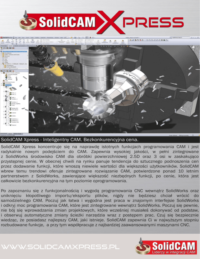 SolidCAM Xpress - Inteligentny CAM. Bezkonkurencyjna cena. SolidCAM Xpress koncentruje się na naprawdę istotnych funkcjach programowania CAM i jest radykalnie nowym podejściem do CAM. Zapewnia wysokiej jakości, w pełni zintegrowane z SolidWorks środowisko CAM dla obróbki powierzchniowej 2.5D oraz 3 osi w zaskakująco przystępnej cenie. W obecnej chwili na rynku panuje tendencja do sztucznego podnoszenia cen przez dodawanie funkcji, które wnoszą niewiele wartości dla większości użytkowników. SolidCAM wbrew temu trendowi oferuje zintegrowane rozwiązanie CAM, potwierdzone ponad 10 letnim partnerstwem z SolidWorks, zawierające większość niezbędnych funkcji, po cenie, która jest całkowicie bezkonkurencyjna na tym poziomie oprogramowania. Po zapoznaniu się z funkcjonalnością i wygodą programowania CNC wewnątrz SolidWorks oraz uniknięciu kłopotliwego importu/eksportu plików, nigdy nie będziesz chciał wrócić do samodzielnego CAM. Poczuj jak łatwa i wygodna jest praca w znajomym interfejsie SolidWorks i odkryj moc programowania CAM, które jest zintegrowane wewnątrz SolidWorks. Poczuj się pewnie, nie bój się wprowadzania zmian projektowych, które wcześniej musiałeś dokonywać od podstaw, i obserwuj automatyczne zmiany ścieżki narzędzia wraz z postępem prac. Czuj się bezpiecznie wiedząc, że posiadasz najlepszy CAM, jaki istnieje. SolidCAM zapewnia Ci w najwyższym stopniu rozbudowane funkcje, a przy tym współpracuje z najbardziej zaawansowanymi maszynami CNC. WWW.SOLIDCAMXPRESS.PL Części, złożenia i rysunki SolidWorks. Pracuj wygodnie na częściach, złożeniach i rysunkach tworząc operacje. Szybko umieszczaj uchwyty i podzespoły dla pełnej wizualizacji. Znana z SolidWorks funkcja złożeń pozwala na programowanie wielu części. Menedżer CAM. Ścieżki narzędzia są przechowywane jako operacje w Menedżerze CAM, w którym ścieżki można je przesuwać korzystając z metody "przeciągnij i upuść" (ang. "drag & drop") reorganizując je w dowolnym momencie. Każda operacja może zostać wygaszona/wycięta/skopiowana/wklejona, zgodnie z metodologią SolidWorks i MS Windows. Wykonuj symulację lub generuj Kod-G dowolnej kombinacji operacji wybierając operacje z drzewa z użyciem klawiszy CTRL lub CTRL + SHIFT. Szybka obróbka powierzchniowa HSS. Xpress zawiera najczęściej używane elementy modułu HSS. Strategie Liniowa i Stałe-Z umożliwiają obróbki 3D części pryzmatycznych. Obrabiane mogą być pojedyncze powierzchnie, jak i elementy wielopowierzchniowe. Frezowanie kieszeni. Zaawansowana obróbka kieszeni obsługuje nieograniczoną liczbę kieszeni i wysp. Geometria kieszeni może być określona jako otwarta, częściowo otwarta, zamknięta, z wyspami lub bez nich. Otwarte i pół-otwarte kieszenie zastępują potrzebę definiowania dodatkowych geometrii. Inteligentne ścieżki narzędzia automatycznie zagłębiają się i stopniowo usuwają materiał z otwartych krawędzi kieszeni (zygzak lub w jedną stronę). Do zamkniętej kieszeni stosowane są wejścia helikalne i zagłębianie liniowe pod kątem. Frezowanie profili. Tworzy ścieżkę narzędzia, prowadzoną przez dowolny profil SolidWorks. Geometria może być określona na podstawie krawędzi modelu, linii szkicu, lub elementów pośrednich. Usuwanie materiału z dużych powierzchni możliwe jest dzięki zdefiniowaniu wielokrotnych przejść. W tej samej operacji mogą być zdefiniowane obróbki zgrubne i wykańczające, wraz z różnymi głębokościami cięcia. Zaawansowane opcje "edycji geometrii" pozwalają ją modyfikować (odsunięcia, wydłużanie i ucinanie geometrii oraz definicję punktu startowego) bez konieczności korzystania z narzędzi SolidWorks. Frezowanie ścian. Łatwo określaj jedno lub wiele przejść cięcia. Dla wygody użytkownika, dostępny jest wybór części, ścian(y), lub szkicu. Rozszerzenie, zawinięcie, wejście i wyjście są automatycznie stosowane, aby wyczyścić całą geometrię. Ruchy podczas zagłębiania i wycofywania narzędzia, jak również ominięcia wykonywane są w powietrzu. Wiercenie. Umożliwia łatwą definicję cykli wiercenia obrabianych otworów. Standardowe cykle obejmują cykle wiertarskie, pogłębianie, rozwiercanie, wytaczanie i gwintowanie. Do postprocesora mogą być również łatwo dodawane własne cykle użytkownika. WWW.SOLIDCAMXPRESS.PL Premium Solutions Sp. z o. o. ul. Leszno 14, 01 - 192 Warszawa tel. (22) 535 - 68 - 60 [email protected]