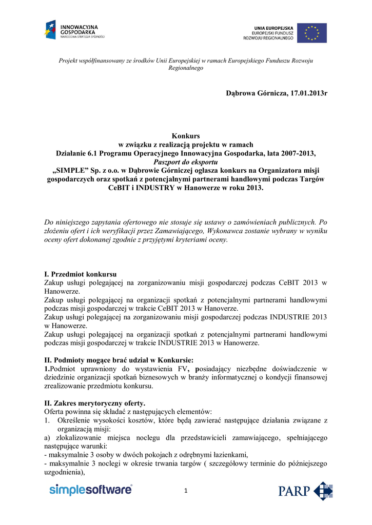 Projekt współfinansowany ze środków Unii Europejskiej w ramach Europejskiego Funduszu Rozwoju Regionalnego Dąbrowa Górnicza, 17.01.2013r Konkurs w związku z realizacją projektu w ramach Działanie 6.1 Programu Operacyjnego Innowacyjna Gospodarka, lata 2007-2013, Paszport do eksportu „SIMPLE” Sp. z o.o. w Dąbrowie Górniczej ogłasza konkurs na Organizatora misji gospodarczych oraz spotkań z potencjalnymi partnerami handlowymi podczas Targów CeBIT i INDUSTRY w Hanowerze w roku 2013. Do niniejszego zapytania ofertowego nie stosuje się ustawy o zamówieniach publicznych. Po złożeniu ofert i ich weryfikacji przez Zamawiającego, Wykonawca zostanie wybrany w wyniku oceny ofert dokonanej zgodnie z przyjętymi kryteriami oceny. I. Przedmiot konkursu Zakup usługi polegającej na zorganizowaniu misji gospodarczej podczas CeBIT 2013 w Hanowerze. Zakup usługi polegającej na organizacji spotkań z potencjalnymi partnerami handlowymi podczas misji gospodarczej w trakcie CeBIT 2013 w Hanoverze. Zakup usługi polegającej na zorganizowaniu misji gospodarczej podczas INDUSTRIE 2013 w Hanowerze. Zakup usługi polegającej na organizacji spotkań z potencjalnymi partnerami handlowymi podczas misji gospodarczej w trakcie INDUSTRIE 2013 w Hanowerze. II. Podmioty mogące brać udział w Konkursie: 1.Podmiot uprawniony do wystawienia FV, posiadający niezbędne doświadczenie w dziedzinie organizacji spotkań biznesowych w branży informatycznej o kondycji finansowej zrealizowanie przedmiotu konkursu. II. Zakres merytoryczny oferty. Oferta powinna się składać z następujących elementów: 1. Określenie wysokości kosztów, które będą zawierać następujące działania związane z organizacją misji: a) zlokalizowanie miejsca noclegu dla przedstawicieli zamawiającego, spełniającego następujące warunki: - maksymalnie 3 osoby w dwóch pokojach z odrębnymi łazienkami, - maksymalnie 3 noclegi w okresie trwania targów ( szczegółowy terminie do późniejszego uzgodnienia), 1 - możliwość zakupienia dodatkowego wyżywienia(śniadanie, obiadokolacja) - przynajmniej minimalne wyposażenie socjalne pokoju (czajnik, lodówka, TV, telefon, filiżanki do kawy i herbaty itp.) - dostęp do bezpłatnego Internetu - swobodny dostęp do pokoi/ recepcji 24h/dobę - nieodpłatny parking w miejscu noclegu, - zdolność podmiotu udzielającego noclegu/usługi do wystawienia FV, - nieuciążliwe sąsiedztwo (lokalizacja umożliwiająca wypoczynek po prac, wyklucza się lokalizację na terenie na o których nie obowiązuje cisza nocna w pobliżu ruchliwych tras, dyskotek, klubów nocnych) - koszt noclegi nie przekraczający 103 Euro na osobę, - dojazd samochodem do Hannover Messe nie przekraczający 90 minut, - odległość nie przekraczająca 90 km b) zarejestrowanie firmy w serwisie B2B Future Match z wypełnieniem profilu zamawiającego w j. angielskim, oferty zamawiającego w j. angielskim , wizytówek osób kontaktowych w j. angielskim (ewentualne koszty zakupu usługi B2B Future Match pokrywa bezpośrednio Zamawiający; koszty dojazdu i noclegu pokrywa bezpośrednio zamawiający) 2. Działania związane z organizacją spotkań z potencjalnymi partnerami biznesowymi podczas misji gospodarczych CeBIT i INDUSTRIE 2013: a) analiza wpisów firm znajdujących się w serwisie B2B Future Match b) analiza podmiotów wystawiających się na Targach CeBit z krajów Turcja, Brazylia, Rumunia, Ukraina, Rosja, a nie biorących udziału w spotkaniach Future Match. c) wybór i rekomendowanie firm spełniających kryteria potencjalnego partnera biznesowego d) pilotaż elektronicznego terminarza celem skutecznego umówienia spotkań z wybranymi podmiotami z takich krajów jak Turcja, Brazylia, Rumunia, Ukraina, Rosja. III. Kryteria oceny oferty: SIMPLE Sp. z o.o. przy wyborze Organizatora bierze pod uwagę wyłącznie cenę. IV. Warunki składania ofert. Oferta powinna zostać przygotowana komputerowo na formularzu oferty, który stanowi załącznik do zapytania. Ofertę należy przesłać w zamkniętej kopercie, na której należy umieścić nazwę i adres autora oraz tekst: Oferta na Konkurs na Organizatora misji gospodarczych Future Match 2013 - CeBIT, INDUSTRIE Hanover) Termin składania ofert dla programów promocji określonych w ust. I pkt. Niniejszego ogłoszenia upływa 31.01.2013r. (decyduje data wpływu oferty do siedziby firmy). Miejsce składania ofert: SIMPLE Sp. z o.o., ul. Cieplaka 19, 41-300 Dąbrowa Górnicza. V. Wybór Organizatora. W dniu 31.01 nastąpi porównanie ofert i wybór najkorzystniejszej z nich. Do wybranego oferenta zostanie skierowane zamówienie. VI. Termin realizacji Za termin realizacji zamówienia przyjmuje się czas umożliwiający odbycie misji – nie później niż na 7 dni przed rozpoczęciem Targów 2 VII. Rozliczenie. Rozliczenie nastąpi na podstawie FV płatnej w terminie nie krótszym niż 7 dni, wystawionej po zaakceptowaniu przez Zamawiającego wyniku realizacji zamówienia. Akceptacja przez Zamawiającego przedmiotu zamówienia nastąpi po odbyciu misji gospodarczych, nie później niż 30.04.2013r. 3 KRYTERIA WYBORU: Lp. 1 2 Sposób oceny Nazwa Cena netto za organizację misji gospodarczych Cena netto za organizację spotkań z potencjalnymi partnerami handlowymi podczas misji gospodarczych Maksymalna ilość punktów Pow. 450 zł/netto – 0 pkt Poniżej 450 zł/netto – 10 pkt 10 Pow. 600zł/netto – 0 pkt Poniżej 600 zł/netto – 10 pkt 10 Zapytanie ofertowe zamieszczone na stronie internetowej oraz w siedzibie Zamawiającego w miejscu publicznie dostępnym. 4