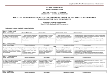 Zespół Szkół im Jarosława Iwaszkiewicza w Sochaczewie TECHNIK HANDLOWIEC SYMBOL ZAWODU 522305 ZASADNICZA SZKOŁA ZAWODOWA SPRZEDAWCA SYMBOL ZAWODU 522301 WYMAGANIA EDUKACYJNE NIEZB DNE DO UZYSKANIA POSZCZEGÓLNYCH ROCZNYCH OCEN KLASYFIKACYJNYCH Z OBOWI ZKOWYCH ZAJ Ć EDUKACYJNYCH Przedmiot: J zyk angielski w handlu Klasa IICR Technikum/IIsk ZSZ sprzedawca Podr cznik: Business English 2, Express Publishing Unit 1 – Product details Ocena dopuszczaj ca Ocena dostateczna Ocena dobra W stopniu bardzo ograniczonym posługuje si j zykiem zawodowym z zakresu rodzaju reklam w mówieniu, pisaniu, słuchaniu i czytaniu ze zrozumieniem. W sposób dostateczny posługuje si j zykiem zawodowym z zakresu rodzaju reklam w mówieniu, pisaniu, słuchaniu i czytaniu ze zrozumieniem. Sprawnie posługuje si j zykiem zawodowym z zakresu rodzaju reklam w mówieniu, pisaniu, słuchaniu i czytaniu ze zrozumieniem. Unit 2 – Selling products Ocena dopuszczaj ca W stopniu bardzo ograniczonym posługuje si j zykiem zawodowym z zakresu sprzeda y towarów online i przez telefon w mówieniu, pisaniu, słuchaniu i czytaniu ze zrozumieniem. Unit 3 – Product problems Ocena dopuszczaj ca W stopniu bardzo ograniczonym posługuje si j zykiem zawodowym z zakresu zwrotu zakupionych produktów w mówieniu, pisaniu, słuchaniu i czytaniu ze zrozumieniem. Unit 4 –Telephoning Ocena dopuszczaj ca Ocena dostateczna W sposób dostateczny posługuje si j zykiem zawodowym z zakresu sprzeda y towarów online i przez telefon w mówieniu, pisaniu, słuchaniu i czytaniu ze zrozumieniem. Ocena dostateczna W sposób dostateczny posługuje si j zykiem zawodowym z zakresu zwrotu zakupionych produktów w mówieniu, pisaniu, słuchaniu i czytaniu ze zrozumieniem. Ocena dostateczna Ocena dobra Ucze : Ucze : Sprawnie posługuje si j zykiem zawodowym z zakresu sprzeda y towarów online i przez telefon w mówieniu, pisaniu, słuchaniu ze zrozumieniem i czytaniu ze zrozumieniem. Ocena dobra Ucze : Sprawnie posługuje si j zykiem zawodowym z zakresu zwrotu zakupionych produktów w mówieniu, pisaniu, słuchaniu ze zrozumieniem i czytaniu ze zrozumieniem. Ocena dobra Ocena bardzo dobra Ocena celuj ca W sposób swobodny i efektywny posługuje si j zykiem zawodowym z zakresu rodzaju reklam w mówieniu, pisaniu, słuchaniu i czytaniu ze zrozumieniem. Swobodnie posługuje si j zykiem zawodowym z zakresu rodzaju reklam w mówieniu, pisaniu, słuchaniu i czytaniu ze zrozumieniem, posługuje si wymow bardzo zbli on do autentycznej. Ponadto ucze wykazuje du e zainteresowanie przedmiotem, potrafi rozwi zywać problemy; pracuje samodzielnie rozwijaj c umiej tno ci j zykowe. Ocena bardzo dobra W sposób swobodny i efektywny posługuje si j zykiem zawodowym z zakresu sprzeda y towarów online i przez telefon w mówieniu, pisaniu, słuchaniu i czytaniu ze zrozumieniem. Ocena bardzo dobra W sposób swobodny i efektywny posługuje si j zykiem zawodowym z zakresu zwrotu zakupionych produktów w mówieniu, pisaniu, słuchaniu i czytaniu ze zrozumieniem. Ocena bardzo dobra Ocena celuj ca Swobodnie posługuje si j zykiem zawodowym z zakresu sprzeda y towarów online i przez telefon w mówieniu, pisaniu, słuchaniu i czytaniu ze zrozumieniem, posługuje si wymow bardzo zbli on do autentycznej. Ponadto ucze wykazuje du e zainteresowanie przedmiotem, potrafi rozwi zywać problemy; pracuje samodzielnie rozwijaj c umiej tno ci j zykowe. Ocena celuj ca Swobodnie posługuje si j zykiem zawodowym z zakresu zwrotu zakupionych produktów w mówieniu, pisaniu, słuchaniu i czytaniu ze zrozumieniem, posługuje si wymow bardzo zbli on do autentycznej. Ponadto ucze wykazuje du e zainteresowanie przedmiotem, potrafi rozwi zywać problemy; pracuje samodzielnie rozwijaj c umiej tno ci j zykowe. Ocena celuj ca W stopniu bardzo ograniczonym posługuje si j zykiem zawodowym z zakresu słownictwa i zwrotów zwi zanych z rozmowami telefonicznymi w mówieniu, pisaniu, słuchaniu i czytaniu ze zrozumieniem. Unit 5 – Emails Ocena dopuszczaj ca W stopniu bardzo ograniczonym posługuje si j zykiem zawodowym z zakresu wysyłania i odbierania poczty elektronicznej w mówieniu, pisaniu, słuchaniu i czytaniu ze zrozumieniem. Unit 6 – Letters Ocena dopuszczaj ca W stopniu bardzo ograniczonym posługuje si j zykiem zawodowym z zakresu podawania ró nic pomi dzy listami w korespondencji handlowej i listami prywatnymi w mówieniu, pisaniu, słuchaniu i czytaniu ze zrozumieniem. Unit 7 – Faxes Ocena dopuszczaj ca W stopniu bardzo ograniczonym posługuje si j zykiem zawodowym z zakresu organizacji i przekładania spotka biznesowych w mówieniu, pisaniu, słuchaniu i czytaniu ze zrozumieniem. W stopniu bardzo ograniczonym posługuje si j zykiem zawodowym z zakresu sposobów organizacji spotka biznesowych w firmach w mówieniu, pisaniu, słuchaniu i czytaniu ze zrozumieniem. Unit 9 – Meeting etiquette Ocena dopuszczaj ca Sprawnie posługuje si j zykiem zawodowym z zakresu słownictwa i zwrotów zwi zanych z rozmowami telefonicznymi w mówieniu, pisaniu, słuchaniu ze zrozumieniem i czytaniu ze zrozumieniem. Ocena dostateczna Ocena dobra W sposób dostateczny posługuje si j zykiem zawodowym z zakresu wysyłania i odbierania poczty elektronicznej w mówieniu, pisaniu, słuchaniu i czytaniu ze zrozumieniem. Ucze : Sprawnie posługuje si j zykiem zawodowym z zakresu wysyłania i odbierania poczty elektronicznejw mówieniu, pisaniu, słuchaniu ze zrozumieniem i czytaniu ze zrozumieniem. Ocena dostateczna Ocena dobra W sposób dostateczny posługuje si j zykiem zawodowym z zakresu podawania ró nic pomi dzy listami w korespondencji handlowej i listami prywatnymi w mówieniu, pisaniu, słuchaniu i czytaniu ze zrozumieniem. Sprawnie posługuje si j zykiem zawodowym z zakresu podawania ró nic pomi dzy listami w korespondencji handlowej i listami prywatnymi w mówieniu, pisaniu, słuchaniu ze zrozumieniem i czytaniu ze zrozumieniem. Ocena dostateczna Ocena dobra W sposób dostateczny posługuje s