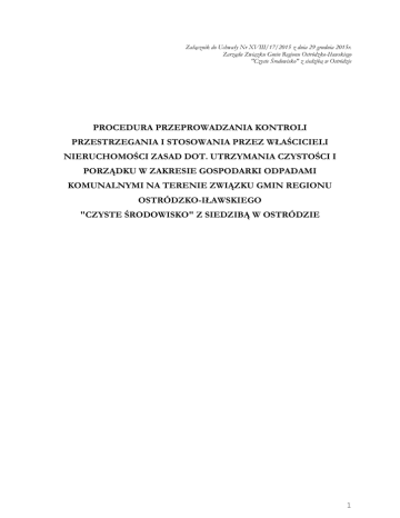 Załącznik do Uchwały Nr XVIII/17/2015 z dnia 29 grudnia 2015r. Zarządu Związku Gmin Regionu Ostródzko-Iławskiego "Czyste Środowisko" z siedzibą w Ostródzie PROCEDURA PRZEPROWADZANIA KONTROLI PRZESTRZEGANIA I STOSOWANIA PRZEZ WŁAŚCICIELI NIERUCHOMOŚCI ZASAD DOT. UTRZYMANIA CZYSTOŚCI I PORZĄDKU W ZAKRESIE GOSPODARKI ODPADAMI KOMUNALNYMI NA TERENIE ZWIĄZKU GMIN REGIONU OSTRÓDZKO-IŁAWSKIEGO "CZYSTE ŚRODOWISKO" Z SIEDZIBĄ W OSTRÓDZIE 1 I. PODSTWA PRAWNA Podstawę prawną do przeprowadzania kontroli przestrzegania zasad dot. utrzymania czystości i porządku w gminach w zakresie gospodarki odpadami komunalnymi (dalej: kontrola) stanowią: 1) art. 9 u i 9 v ustawy z dnia 13 września 1996 r. o utrzymaniu czystości i porządku w gminach (t.j.: Dz. U. z 2013r. poz.1399; zmiany: Dz. U. z 2013r. poz.1593; Dz. U. z 2015r. poz. 87) ( dalej: Ustawa); 2) art. 379 i 380 ustawy z dnia 27 kwietnia 2001r. Prawo ochrony środowiska ( Dz.U.2013.1232 j.t. ze zm.)(dalej: POŚ); 3) przepisy rozdziału 5 ustawy z dnia 2 lipca 2004 r. o swobodzie działalności gospodarczej (t.j: Dz. U. z 2013 r., poz. 672 z późn. zmianami) (dalej: SDG); 4) uchwały rad miast i gmin - członków Związku Gmin w sprawie przyjęcia regulaminu utrzymania czystości i porządku w gminach lub uchwała Związku Gmin w porządku w sprawie przyjęcia regulaminu utrzymania czystości i gminach (o ile zostanie przyjęta) (dalej: Regulaminy/Regulamin); Wyciąg z przepisów prawa dotyczących kontroli stanowi Załącznik Nr 1 do Procedury. 2 II. ORGAN UPRAWNIONY DO KONTROLI. Organem uprawnionym do kontroli przestrzegania i stosowania przepisów Ustawy na terenie miast i gmin - członków Związku Gmin jest Zarząd Związku Gmin. III. OSOBY UPOWAŻNIONE DO KONTROLI Zarząd Związku Gmin jako organ uprawniony do kontroli upoważnia do przeprowadzania kontroli wyłącznie podległych pracowników Związku Gmin, na podstawie odrębnych upoważnień- rodzajowych lub szczególnych. Upoważnienie udzielone pracownikom w trakcie stosunku pracy wygasa wraz z jego rozwiązaniem. Wzory upoważnień stanowią Załączniki Nr 2 i 2a do Procedury. IV. ZAKRES PRZEDMIOTOWY KONTROLI Zakres przedmiotowy kontroli obejmuje przestrzeganie przez właścicieli1 nieruchomości zasad utrzymania czystości i porządku zgodnie z przyjętym w gminie/Związku Gmin Regulaminem oraz Ustawą. V. PODMIOTY KONTROLOWANE Kontroli podlegają właściciele nieruchomości objęci systemem gospodarowania odpadami komunalnymi na terenie Związku Gmin, tj. właściciele nieruchomości, na których zamieszkują mieszkańcy oraz właściciele nieruchomości, które w części stanowią nieruchomości, na których zamieszkują mieszkańcy, a w części nieruchomości, na których nie zamieszkują mieszkańcy, a powstają odpady komunalne oraz właściciele nieruchomości, na których nie zamieszkują mieszkańcy, a powstają odpady komunalne ( dalej: właściciel/właściciele).1, 2 1 przez właściciela nieruchomości rozumie się także współwłaścicieli, użytkowników wieczystych oraz jednostki organizacyjne i osoby posiadające nieruchomości w zarządzie lub użytkowaniu, a także inne podmioty władające nieruchomością. 2 Jeżeli obowiązki wskazane w Ustawie mogą jednocześnie dotyczyć kilku podmiotów spośród wskazanych w art. 2 ust. 1 pkt 4, obowiązany do ich wykonania jest podmiot lub podmioty faktycznie władające nieruchomością. W takim przypadku podmioty, o których mowa w art. 2 ust. 1 pkt 4, mogą w drodze umowy zawartej w formie pisemnej, wskazać podmiot obowiązany do wykonania obowiązków wynikających z ustawy. 3 VI. WYBÓR PODMIOTÓW KONTROLOWANYCH Podmioty kontrolowane wybierane są: 1) na podstawie zgłoszeń pracowników Związku Gmin mających - na podstawie posiadanej dokumentacji - uzasadnione obawy co do nieprzestrzegania przez właścicieli nieruchomości zasad, zwłaszcza co do segregacji odpadów komunalnych; 2) na podstawie zgłoszeń dokonywanych przez podmioty odbierające odpady o niedopełnieniu obowiązku utrzymania czystości i porządku, w tym w szczególności w zakresie segregacji odpadów na danej nieruchomości ( niezgodność ze złożoną deklaracją);3 3) na podstawie innych zgłoszeń, zgodnie z decyzją Zarządu Związku Gmin lub Dyrektora Biura; 4) losowo przez Dyrektora Biura Związku Gmin (Dział Gospodarki Odpadami). VII. PROCEDURA KONTROLI Zarząd Związku Gmin po podjęciu decyzji o przeprowadzeniu kontroli udziela właściwego upoważnienia pracownikowi Biura Związku Gmin. Pracownik przed przeprowadzeniem kontroli: 1) sprawdza w systemie informatycznym, w którym prowadzona jest ewidencja czy właściciel złożył deklarację o wysokości opłaty za gospodarowanie odpadami komunalnymi (dalej: deklaracja) i czy zadeklarował segregowanie odpadów komunalnych; 2) w przypadku, gdy właściciel nie złożył deklaracji, pracownik informuje o powyższym Dyrektora Biura celem podjęcia przez Zarząd Związku Gmin czynności, o których mowa w art. 6o Ustawy; 3) w przypadku, gdy właściciel złożył deklarację, pracownik podejmuje 3 Zgodnie z art. 9f Ustawy podmiot odbierający odpady komunalne zobowiązany jest powiadamiać Związek Gmin o przypadkach niedopełniania przez właścicieli nieruchomości obowiązku w zakresie selektywnego zbierania odpadów komunalnych. 4 czynności kontrolne na co najmniej dzień przed dniem odbioru odpadów przez podmiot odbierający odpady wyznaczonym na podstawie obowiązującego harmonogramu; 4) w razie konieczności (zalecane) upoważniony pracownik wnosi do Komendanta Policji lub Straży Miejskiej właściwej ze względu na miejsce położenia nieruchomości o udział w kontroli policjanta, 4 5) kontrola przeprowadzana jest w obecności właściciela, a w razie jego nieobecności - dorosłego domownika; 6) pracownik przeprowadzający kontrolę zobowiązany jest do posiadania podczas kontroli upoważnienia oraz legitymacji służbowej, które okazuje właś