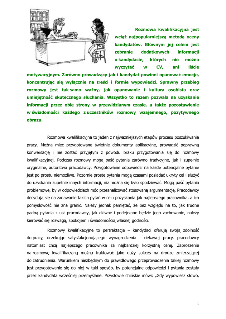 Rozmowa kwalifikacyjna jest wciąŜ najpopularniejszą metodą oceny kandydatów. Głównym jej celem jest zebranie dodatkowych o kandydacie, wyczytać w których CV, informacji nie moŜna ani liście motywacyjnym. Zarówno prowadzący jak i kandydat powinni opanować emocje, koncentrując się wyłącznie na treści i formie wypowiedzi. Sprawny przebieg rozmowy jest tak samo waŜny, jak opanowanie i kultura osobista oraz umiejętność skutecznego słuchania. Wszystko to razem pozwala na uzyskanie informacji przez obie strony w przewidzianym czasie, a takŜe pozostawienie w świadomości kaŜdego z uczestników rozmowy wzajemnego, pozytywnego obrazu. Rozmowa kwalifikacyjna to jeden z najwaŜniejszych etapów procesu poszukiwania pracy. MoŜna mieć przygotowane świetnie dokumenty aplikacyjne, prowadzić poprawną konwersację i nie zostać przyjętym z powodu braku przygotowania się do rozmowy kwalifikacyjnej. Podczas rozmowy mogą paść pytania zarówno tradycyjne, jak i zupełnie oryginalne, autorstwa pracodawcy. Przygotowanie odpowiedzi na kaŜde potencjalne pytanie jest po prostu niemoŜliwe. Pozornie proste pytania mogą czasami posiadać ukryty cel i słuŜyć do uzyskania zupełnie innych informacji, niŜ moŜna się było spodziewać. Mogą paść pytania problemowe, by w odpowiedziach móc przeanalizować stosowaną argumentację. Pracodawcy decydują się na zadawanie takich pytań w celu pozyskania jak najlepszego pracownika, a ich pomysłowość nie zna granic. NaleŜy jednak pamiętać, Ŝe bez względu na to, jak trudne padną pytania z ust pracodawcy, jak dziwne i podejrzane będzie jego zachowanie, naleŜy kierować się rozwagą, spokojem i świadomością własnej godności. Rozmowy kwalifikacyjne to pertraktacje – kandydaci oferują swoją zdolność do pracy, oczekując satysfakcjonującego wynagrodzenia i ciekawej pracy, pracodawcy natomiast chcą najlepszego pracownika za najbardziej korzystną cenę. Zaproszenie na rozmowę kwalifikacyjną moŜna traktować jako duŜy sukces na drodze zmierzającej do zatrudnienia. Warunkiem niezbędnym do prawidłowego przeprowadzenia takiej rozmowy jest przygotowanie się do niej w taki sposób, by potencjalne odpowiedzi i pytania zostały przez kandydata wcześniej przemyślane. Przysłowie chińskie mówi: „Gdy wypowiesz słowo, 1 zyskuje ono władzę nad Tobą. Dopóki nie zostanie wypowiedziane, to Ty masz nad nim władzę”. R REEK KR RU UTTAACCJJAA kandydatów do pracy to komunikowanie się danej firmy z rynkiem pracy w celu pozyskania odpowiednich osób na konkretne stanowisko pracy. Funkcje rekrutacji: informacyjna – przedstawienie warunków pracy i potrzeb konkretnego zakładu na konkretnym rynku pracy; motywacyjna – wywołanie zainteresowania właściwych grup zawodowych; preselekcyjna – dokonanie wstępnej selekcji ofert (dokumentów aplikacyjnych) złoŜonych przez kandydatów. SSEELLEEK KCCJJAA K KAAN ND DYYD DAATTÓ ÓW W polega na zbieraniu informacji o kandydatach na pracowników i dokonywaniu wyboru najbardziej odpowiedniego na dane stanowisko. Selekcji dokonuje się wśród kandydatów pozyskanych wskutek przeprowadzonej rekrutacji. R Reekkrruuttaaccjjaa m mooŜŜee bbyyćć:: ogólna – prowadzona według standardowych i prostych procedur, by przyciągnąć jak największą liczbę kandydatów na stanowisko np. związane z produkcją; wyspecjalizowana – opracowana według jednostkowych, indywidualnych i czasami skomplikowanych procedur dla przyciągnięcia kandydatów – specjalistów. W WyyrróóŜŜnniiaam myy ddw wiiee ffoorrm myy rreekkrruuttaaccjjii:: Rekrutacja wewnętrzna – jest oparta o wewnętrzny rynek pracy, który tworzą osoby zatrudnione w firmie. WiąŜe się to z mniejszymi kosztami niŜ w wypadku innych metod poszukiwania nowych pracowników. Proces wewnętrznej rekrutacji zaczyna się przez poinformowanie personelu (drogą słuŜbową, poprzez np. ogłoszenia) i stosuje się tutaj najczęściej poniŜsze metody: analizę dokumentów kadrowych, obserwację, wywiad i rekomendację bezpośrednich kierowników, oddelegowanie, ogłoszenia wewnętrzne. Rekrutacja zewnętrzna – prowadzona jest na otwartym rynku pracy przy uŜyciu większego zakresu metod, których zróŜnicowanie zaleŜy w znacznym stopniu od tego, czy realizowana jest rekrutacja ogólna (informacje ustne, rekomendacje, ogłoszenia w mediach lokalnych i ogólnokrajowych, współpraca z urzędami pracy, prowadzenie akcji „otwartych drzwi”, korzystanie z pomocy agencji doradztwa personalnego, firm konsultingowych) czy segmentowa (brany jest pod uwagę wyselekcjonowany rynek i na nim koncentruje się uwaga organizacji; jej słabą stroną są wyŜsze koszty rekrutacji, większe ryzyko popełnienia błędów przy selekcji, dłuŜsza adaptacja do nowych warunków pracy). 2 EEttaappyy pprroocceessuu rreekkrruuttaaccyyjjnneeggoo:: zebranie ofert preselekcja szczegółowa selekcja ofert zastosowanie innych metod selekcyjnych wybór najlepszych kandydatów ostateczny wybór kandydata zatrudnienie kandydata M Meettooddyy ddoobboorruu ii oocceennyy kkaannddyyddaattóów w:: analiza dokumentów wywiady – rozmowy kwalifikacyjne referencje bio-dane analiza grafologiczna ocena zintegrowana (Assessment Centre) testy: psychometryczne, praktyczne, inteligencji, umiejętności, merytoryczne, językowe, badające predyspozycje psychiczne TTrraaffnniiee ookkrreeśślloonnyy pprrooffiill oossoobboow wyy w wsskkaazzuujjee,, jjaakkaa oossoobbaa jjeesstt ppoottrrzzeebbnnaa ddoo w włłaaśścciiw weeggoo ii kkoom mppeetteennttnneeggoo w wyykkoonnyyw waanniiaa ccaałłeejj pprraaccyy nnaa ddaannyym m ssttaannoow wiisskkuu.. W Wyym maaggaanniiaa nniiee ppoow wiinnnnyy ooppiieerraaćć ssiięę nnaa pprrzzeesszzłłoośśccii ii zzw wiiąązzaannyycchh zz nniiąą ppoottrrzzeebbaacchh,, lleecczz w wyybbiieeggaaćć w w pprrzzyysszzłłoośśćć ii pprrzzeew wiiddyyw waaćć,, jjaakkiiee cceecchhyy bbęęddąą nnaajjppoottrrzzeebbn